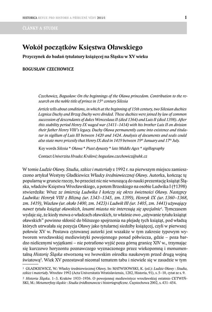 HISTORICA Revue pro historii a příbuzné vědy 2011/1 1 ČLÁNKY A STUDIE Wokół początków Księstwa Oławskiego Przyczynek do badań tytulatury książęcej na Śląsku w XV wieku BOGUSŁAW CZECHOWICZ Czechowicz, Bogusław: On the beginnings of the Oława princedom. Contribution to the research on the noble title of prince in 15th century Silesia Article tells about conditions, in which at the beginning of 15th century, two Silesian duchies Legnica Duchy and Brzeg Duchy were divided. These duchies were joined by law of common succession of descendants of dukes Wenceslaus II (died 1364) and Luis II (died 1398). After this stability period Henry IX waged war (1411–1414) with his brother Luis II on division their father Henry VIII’s legacy. Duchy Oława permanently came into existence and titulatur in sigillum of Luis III between 1420 and 1424. Analysis of documents and seals could also state more pricesily that Henry IX died in 1419 between 19th January and 17th July. Key words Silesia * Oława * Piast dynasty * late Middle Ages * sigillography Contact Univerzita Hradec Králové; [email protected] W tomie Ludzie Oławy. Studia, szkice i materiały z 1992 r. na pierwszym miejscu zamiesz czono artykuł Westyny Gładkiewicz Władcy średniowiecznej Oławy. Autorka, kończąc tę popularną w gruncie rzeczy, bo przecież nic nie wnoszącą do nauki prezentację książąt Ślą ska, władców Księstwa Wrocławskiego, a potem Brzeskiego na osobie Ludwika I (†1398) stwierdziła: Wraz ze śmiercią Ludwika I kończy się okres świetności Oławy. Następcy Ludwika: Henryk VIII z Blizną (ur. 1343–1345, zm. 1399), Henryk IX (ur. 1360–1368, zm. 1419), Wacław (ur. około 1400, zm. 1423) i Ludwik III (ur. 1405, zm. 1441) używający nawet tytułu książąt oławskich, losami miasta nie interesują się specjalnie1. Tymczasem wydaje się, że kiedy mowa o władcach oławskich, to właśnie owo „używanie tytułu książąt oławskich” powinno skłonić do bliższego spojrzenia na plejadę tych książąt, pod władzą których utrwalała się pozycja Oławy jako tytularnej siedziby książęcej, czyli w pierwszej połowie XV w. Postawa cytowanej autorki jest wszakże w tym zakresie typowym wy tworem wrocławskiej mediewistyki powojennego ponad półwiecza, gdzie – poza bar dzo nielicznymi wyjątkami – nie potrafiono wyjść poza górną granicę XIV w., trzymając się kurczowo horyzontu poznawczego wyznaczonego przez wiekopomną i monumen talną Historię Śląska stworzoną we lwowskim ośrodku naukowym przed drugą wojną światową2. Wiek XV pozostawał nieomal tematem tabu i niewiele się w zasadzie w tym 1 GŁADKIEWICZ, W.: Władcy średniowiecznej Oławy. In: MATWIJOWSKI, K. (ed.): Ludzie Oławy : Studia, szkice i materiały. Wrocław 1992 (Acta Universitatis Wratislaviensis, 1282, Historia, 91), s. 5–10, cytat ze s. 9. 2 Historia Śląska. 1–3. Kraków 1933–1936. O powojennej mediewistyce wrocławskiej ostatnio CETWIŃ SKI, M.: Metamorfozy śląskie : Studia źródłoznawcze i historiograficzne. Częstochowa 2002, s. 431–454. 2 HISTORICA Revue pro historii a příbuzné vědy 2011/1 zakresie do dziś w piśmiennictwie polskojęzycznym zmieniło (chlubnym wyjątkiem byli i są badacze historii Kościoła)3, a próby szerzej zakrojonego wypełniania tej pustki oraz – siłą rzeczy – przewartościowań stereotypów często napotykają na niezrozumienie i opór autorów uformowanych intelektualnie w duchu rzeczonej pracy sprzed blisko 80 lat 4. Niemniej, nie poddając się tej sytuacji, należy dążyć do tworzenia podstaw do dyskusji wykraczającej poza stan wiedzy z czasów już bardzo odległych. Problematykę tego artykuły przedstawił niedawno w szerszym horyzoncie czasowym i terytorialnym Marek L. Wójcik 5. Jego artykuł poświęcony tytulaturze książąt z linii le gnicko-brzeskiej – doprowadzony, co charakterystyczne, do początków XV w. – nie za wiera jednak przypisów i odesłania do źródeł, a jedynie bibliografię. W zasadniczy sposób utrudnia to weryfikację tez autora i sprawia, że praca ta nie spełnia wymogów stawianych publikacjom naukowym. Ma jedynie walor opracowania pomocniczego. O ile rok 1311 można bez większych obaw popełniania błędu wskazać jako początek istnienia w strukturze Śląska Księstwa Brzeskiego, tak znacznie trudniej uchwycić mo ment, w którym na podobnych zasadach wyodrębniło się z niego władztwo oławskie. Za kryterium pozwalające mówić o istnieniu jakiegoś księstwa proponowano uznać w lite raturze nie tylko pojawienie się partykularnej tytulatury jakiegoś księcia (w naszym przy padku – oławskiego), ale potwierdzenie tego stanu w akcie lennym nadania inwestytury na księstwo6 – to rzecz jasna w dobie podległości Śląska królom czeskim, a od 7 kwietnia 1348 r. – proklamowanej wtedy Koronie Królestwa Czech 7. Trudno natomiast o speł nienie tego warunku w dobie formalnej podległości Śląska Królestwu Polskiemu, kiedy księstwa Legnickie, Głogowskie czy nawet Brzeskie rodziły się spontanicznie i nie istniał mechanizm prawny nadawania inwestytury 8. Sądzę jednak, że akceptacja wewnętrznych podziałów księstw Śląskich dokonana przez kancelarię królewską w Pradze nie musi być warunkiem dla uznania prawowitości decyzji podziałowych książąt, zwłaszcza w dobie osłabienia władzy centralnej za rządów Wacława IV czy bezkrólewia po śmierci Albrechta Habsburga. Istotnym wydaje się natomiast trwałość występowania partykularnych ty 3 Np. URBAN, W.: Studia nad dziejami wrocławskiej diecezji w pierwszej połowie XV wieku. Wrocław 1959; DOLA, K.: Wrocławska kapituła katedralna w XV wieku : Ustrój – skład osobowy – działalność. Lublin 1983; DRABINA, J.: Kontakty Wrocławia z Rzymem w latach 1409–1517. Wrocław – Warszawa – Kraków – Gdańsk – Łódź 1981; TENŻE: Idee koncyliaryzmu na Śląsku : Wkład miejscowych środowisk intele
