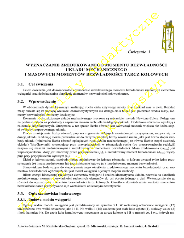 dy da kt Ma yc sz zn yn e Ćwiczenie 3 WYZNACZANIE ZREDUKOWANEGO MOMENTU BEZWŁADNOŚCI UKŁADU MECHANICZNEGO I MASOWYCH MOMENTÓW BEZWŁADNOŚCI TARCZ KOŁOWYCH Cel ćwiczenia Ma te ri al y 3.1. Celem ćwiczenia jest doświadczalne wyznaczenie zredukowanego momentu bezwładności ruchomych elementów wciągarki oraz doświadczalne określenie momentów bezwładności kołowych tarcz. 3.2. Wprowadzenie Ka te dr a Dy na mi ki W obliczeniach dynamiki maszyn analizując ruchu ciała sztywnego należy znać rozkład mas w ciele. Rozkład masy określa się za pomocą wielkości charakterystycznych dla danego ciała takich jak: położenie środka masy, momenty bezwładności, momenty dewiacyjne. Równania ruchu złożonego układu mechanicznego tworzone są najczęściej metodą Newtona-Eulera. Polega ona na podziale układu na podukłady i napisaniu równań ruchu dla każdego podukładu. Dodatkowe równania wynikają z zależności kinematycznych. Otrzymana w ten sposób liczba równań jest zazwyczaj znacznie większa niż liczba stopni swobody rozpatrywanego układu. Proces zmniejszania liczby równań, poprzez rugowanie kolejnych niewiadomych przyspieszeń, nazywa się redukcją układu. Redukcję można prowadzić aż do otrzymania takiej liczby równań ruchu, jaka jest liczba stopni swobody układu (minimalna liczba równań opisujących ruch układu mechanicznego jest równa liczbie stopni swobody układu.) Współczynniki występujące przy przyspieszeniach w równaniach ruchu (po przeprowadzeniu redukcji) nazywa się masami zredukowanymi i zredukowanymi momentami bezwładności. Masa zredukowana (mi red) jest współczynnikiem, który jest mnożony przez przyspieszenie (pi), a zredukowany moment bezwładności (Jk red) występuje przy przyspieszeniu kątowym (εk). Układ o jednym stopniu swobody można zredukować do jednego równania, w którym wystąpi tylko jedno przyspieszenie (p) i masa zredukowana lub przyspieszenie kątowe (ε ) i zredukowany moment bezwładności. Stanowiskiem badawczym do eksperymentalnego określenia zredukowanego momentu bezwładności oraz momentów bezwładności wybranych ciał jest model wciągarki o jednym stopniu swobody. Bilans energii kinetycznej ruchomych elementów wciągarki i analiza kinematyczna układu, pozwala na określenie zredukowanego momentu bezwładności ruchomych elementów do osi obrotu jednego z ciał. Wykorzystuje się go również do wyznaczenia momentów bezwładności tarcz kołowych. Określone doświadczalnie wartości momentów bezwładności tarcz porównywane są z wartościami obliczonymi teoretycznie. 3.3. Opis stanowiska badawczego 3.3.1. Budowa modelu wciągarki Ogólny widok modelu wciągarki jest przedstawiony na rysunku 3.1. W metalowej odbudowie wciągarki (12) umieszczono dwa wałki oznaczone jako I i II. Na wałku I (15) osadzone jest małe koło zębate (1), stalowy walec (3) i koło hamulca (4). Do czoła koła hamulcowego mocowane są tarcze kołowe A i B o masach mA i mB, których mo- Autorka ćwiczenia M. Kazimierska-Grębosz, rysunki B. Mianowski, redakcja: K. Januszkiewicz, J. Grabski dy da kt Ma yc sz zn yn e Wyznaczanie zredukowanego momentu bezwładności układu mechanicznego… menty bezwładności mają być wyznaczone doświadczalnie. Tarcze przedstawiono na rys.3.2. Na koło hamulca nawinięta jest linka opasująca ruchomy krążek (8) z obciążnikiem (9) o masie m1. Na wałku II (16) osadzone jest duże koło zębate (2) i rowkowany bęben (10), na który nawinięta jest linka obciążona ciałem (11) o masie m2. 1 – koło zębate małe, 2 – koło zębate duże, 3 – walec, 4 – koło hamulca, 5 – dźwignie hamulca szczękowego, 8 – ruchomy krążek, 9 – obciążnik o masie m1, 10 – bęben linowy, 11 – obciążnik o masie m2, 12 – obudowa wciągarki, 13 – czujniki optyczne: a) górny, b) dolny, Ka te dr a 14 – stojak, 15 – wałek I, 16 – wałek II Rys. 3.2. Tarcza A i tarcza B Dy na mi ki Ma te ri al y 6 – sprężyna hamulca, 7 – luzownik elektromagnetyczny, Rys. 3.1. Stanowisko badawcze - model wciągarki 3.3.2. Opis ruchu elementów modelu i zasada pomiarów Ciało o masie m1 poruszając się w dół przebywa drogę s1, a ciało masie m2 w tym samym czasie przebywa w górę drogę s2. Wciągarka umieszczona została na stojaku (14), do którego przymocowano dwa czujniki optyczne (13). Odległość między czujnikami stanowi drogę s2. Ciało o masie m2 przechodząc pomiędzy czujnikami dolnymi i górnymi zasłania strumienie świetlne i tym samym wytwarza impulsy przekazywane przez fototranzystory na układ wyzwalający, który steruje luzownikiem elektromagnetycznym hamulca szczękowego i miernikiem czasu. Na mierniku jest odczytywany czas, w jakim ciało o masie m2 przebywa tę drogę. Sygnał z górnego czujnika zwalnia luzownik elektromagnetyczny (7) hamulca szczękowego (5) zatrzymującego cały układ. Przycisk znajdujący się na stole przy stoisku badawczym służy do zwalniania hamulca poprzez luzownik. 2 dy da kt Ma yc sz zn yn e Ćwiczenie nr 3 3.4. Podstawowe zależności teoretyczne 3.4.1. Pojęcie zredukowanego momentu bezwładności Zredukowanym momentem bezwładności układu mechanicznego o jednym stopniu swobody do członu napędowego (poruszającego się z prędkością kątową ω w określonej chwili t), nazywa się moment bezwładności takiego fikcyjnego ciała, które posiadałoby energię kinetyczną równą sumie energii kinetycznych wszystkich elementów układu w tej samej chwili t. Wykorzystanie pojęcia momentu zredukowanego ( J red ) pozwala na przedstawienie energii kinetycznej układu o jednym stopniu swobody jako E= 1 J red ω 12 2 (3.1) oraz dynamicznego równania ruchu układu w postaci J red ε I = M red , gdzie: – zredukowany moment bezwładności, – prędkości członu napędowego, – przyspieszenia członu napędowego, – zredukowany moment napędowy. Ma te ri al y J red ω1 ε1 Mred (3.2) 3.4.2. Wyznaczenie zreduko