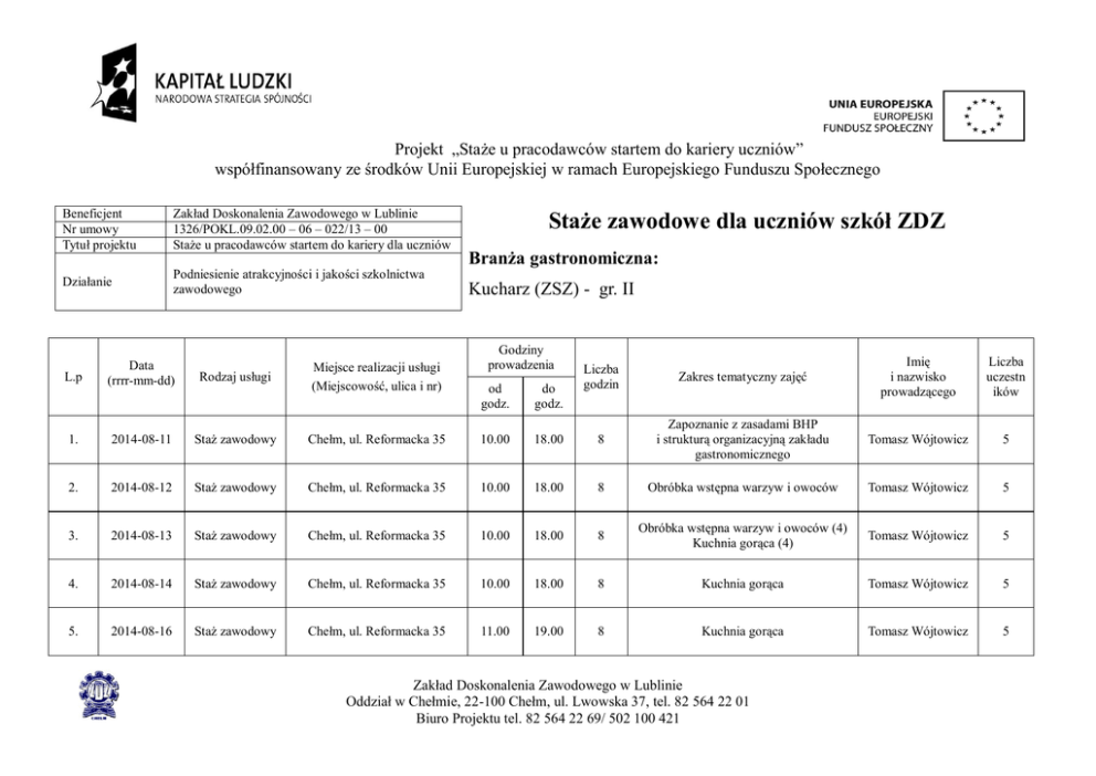 Projekt „Staże u pracodawców startem do kariery uczniów” współfinansowany ze środków Unii Europejskiej w ramach Europejskiego Funduszu Społecznego Beneficjent Nr umowy Tytuł projektu Zakład Doskonalenia Zawodowego w Lublinie 1326/POKL.09.02.00 – 06 – 022/13 – 00 Staże u pracodawców startem do kariery dla uczniów Działanie Podniesienie atrakcyjności i jakości szkolnictwa zawodowego Data (rrrr-mm-dd) Rodzaj usługi 1. 2014-08-11 Staż zawodowy 2. 2014-08-12 3. L.p Miejsce realizacji usługi (Miejscowość, ulica i nr) Staże zawodowe dla uczniów szkół ZDZ Branża gastronomiczna: Kucharz (ZSZ) - gr. II Godziny prowadzenia Liczba godzin Zakres tematyczny zajęć Imię i nazwisko prowadzącego Liczba uczestn ików od godz. do godz. Chełm, ul. Reformacka 35 10.00 18.00 8 Zapoznanie z zasadami BHP i strukturą organizacyjną zakładu gastronomicznego Tomasz Wójtowicz 5 Staż zawodowy Chełm, ul. Reformacka 35 10.00 18.00 8 Obróbka wstępna warzyw i owoców Tomasz Wójtowicz 5 2014-08-13 Staż zawodowy Chełm, ul. Reformacka 35 10.00 18.00 8 Obróbka wstępna warzyw i owoców (4) Kuchnia gorąca (4) Tomasz Wójtowicz 5 4. 2014-08-14 Staż zawodowy Chełm, ul. Reformacka 35 10.00 18.00 8 Kuchnia gorąca Tomasz Wójtowicz 5 5. 2014-08-16 Staż zawodowy Chełm, ul. Reformacka 35 11.00 19.00 8 Kuchnia gorąca Tomasz Wójtowicz 5 Zakład Doskonalenia Zawodowego w Lublinie Oddział w Chełmie, 22-100 Chełm, ul. Lwowska 37, tel. 82 564 22 01 Biuro Projektu tel. 82 564 22 69/ 502 100 421 Projekt „Staże u pracodawców startem do kariery uczniów” współfinansowany ze środków Unii Europejskiej w ramach Europejskiego Funduszu Społecznego 6. 2014-08-18 Staż zawodowy Chełm, ul. Reformacka 35 12.00 18.00 6 Kuchnia gorąca Tomasz Wójtowicz 5 7. 2014-08-19 Staż zawodowy Chełm, ul. Reformacka 35 11.00 18.00 7 Kuchnia gorąca Tomasz Wójtowicz 5 8. 2014-08-20 Staż zawodowy Chełm, ul. Reformacka 35 11.00 18.00 7 Kuchnia gorąca Tomasz Wójtowicz 5 9. 2014-08-21 Staż zawodowy Chełm, ul. Reformacka 35 11.00 18.00 7 Ekspedycja potraw Tomasz Wójtowicz 5 10. 2014-08-22 Staż zawodowy Chełm, ul. Reformacka 35 11.00 18.00 7 Ekspedycja potraw Tomasz Wójtowicz 5 11. 2014-08-23 Staż zawodowy Chełm, ul. Reformacka 35 12.00 18.00 6 Pracownia garmażeryjna Tomasz Wójtowicz 5 15. 2014-08-25 Staż zawodowy Chełm, ul. Reformacka 35 10.00 18.00 8 Pracownia garmażeryjna Tomasz Wójtowicz 5 16. 2014-08-26 Staż zawodowy Chełm, ul. Reformacka 35 10.00 18.00 8 Pracownia garmażeryjna Tomasz Wójtowicz 5 17. 2014-08-27 Staż zawodowy Chełm, ul. Reformacka 35 10.00 18.00 8 Pracownia garmażeryjna Tomasz Wójtowicz 5 18. 2014-08-28 Staż zawodowy Chełm, ul. Reformacka 35 10.00 18.00 8 Pracownia garmażeryjna Tomasz Wójtowicz 5 Zakład Doskonalenia Zawodowego w Lublinie Oddział w Chełmie, 22-100 Chełm, ul. Lwowska 37, tel. 82 564 22 01 Biuro Projektu tel. 82 564 22 69/ 502 100 421 Projekt „Staże u pracodawców startem do kariery uczniów” współfinansowany ze środków Unii Europejskiej w ramach Europejskiego Funduszu Społecznego 19. 2014-08-29 Staż zawodowy Chełm, ul. Reformacka 35 10.00 18.00 8 Deserownia/Ciastkarnia Tomasz Wójtowicz 5 20. 2014-09-05 Staż zawodowy Chełm, ul. Reformacka 35 15.00 18.00 3 Deserownia/Ciastkarnia Tomasz Wójtowicz 5 21. 2014-09-06 Staż zawodowy Chełm, ul. Reformacka 35 11.00 18.00 7 Deserownia/Ciastkarnia Tomasz Wójtowicz 5 22. 2014-09-12 Staż zawodowy Chełm, ul. Reformacka 35 15.00 18.00 3 Deserownia/Ciastkarnia Tomasz Wójtowicz 5 23. 2014-09-13 Staż zawodowy Chełm, ul. Reformacka 35 11.00 18.00 7 Deserownia/Ciastkarnia Tomasz Wójtowicz 5 24. 2014-09-19 Staż zawodowy Chełm, ul. Reformacka 35 15.00 18.00 3 Deserownia/Ciastkarnia (2) Zaopatrzenie/Magazynowanie/ Rozliczenie (1) Tomasz Wójtowicz 5 25. 2014-09-20 Staż zawodowy Chełm, ul. Reformacka 35 11.00 18.00 7 Zaopatrzenie/Magazynowanie/ Rozliczenie Tomasz Wójtowicz 5 Zakład Doskonalenia Zawodowego w Lublinie Oddział w Chełmie, 22-100 Chełm, ul. Lwowska 37, tel. 82 564 22 01 Biuro Projektu tel. 82 564 22 69/ 502 100 421