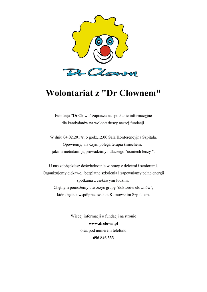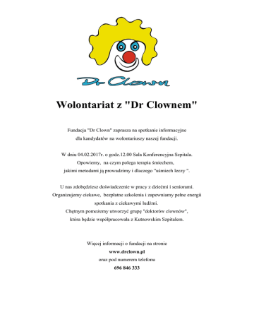 Wolontariat z "Dr Clownem" Fundacja "Dr Clown" zaprasza na spotkanie informacyjne dla kandydatów na wolontariuszy naszej fundacji. W dniu 04.02.2017r. o godz.12.00 Sala Konferencyjna Szpitala. Opowiemy, na czym polega terapia śmiechem, jakimi metodami ją prowadzimy i dlaczego "uśmiech leczy ". U nas zdobędziesz doświadczenie w pracy z dziećmi i seniorami. Organizujemy ciekawe, bezpłatne szkolenia i zapewniamy pełne energii spotkania z ciekawymi ludźmi. Chętnym pomożemy utworzyć grupę "doktorów clownów", która będzie współpracowała z Kutnowskim Szpitalem. Więcej informacji o fundacji na stronie www.drclown.pl oraz pod numerem telefonu 696 846 333