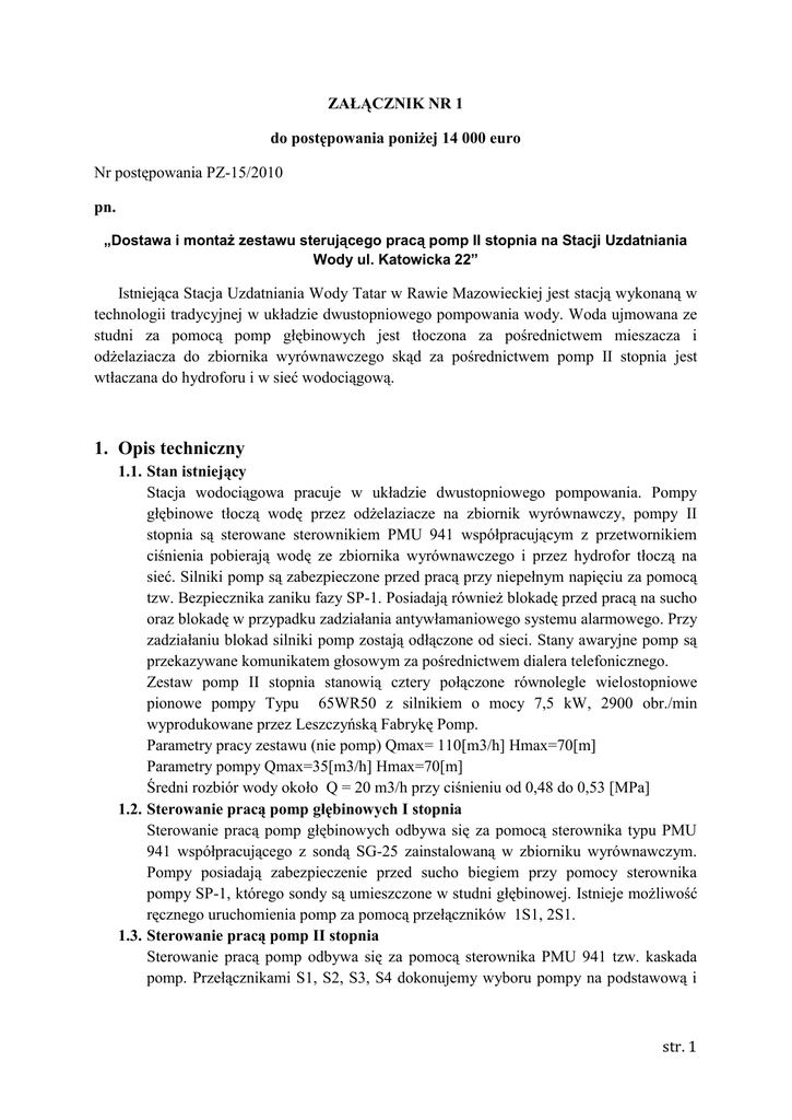 ZAŁĄCZNIK NR 1 do postępowania poniżej 14 000 euro Nr postępowania PZ-15/2010 pn. „Dostawa i montaż zestawu sterującego pracą pomp II stopnia na Stacji Uzdatniania Wody ul. Katowicka 22” Istniejąca Stacja Uzdatniania Wody Tatar w Rawie Mazowieckiej jest stacją wykonaną w technologii tradycyjnej w układzie dwustopniowego pompowania wody. Woda ujmowana ze studni za pomocą pomp głębinowych jest tłoczona za pośrednictwem mieszacza i odżelaziacza do zbiornika wyrównawczego skąd za pośrednictwem pomp II stopnia jest wtłaczana do hydroforu i w sieć wodociągową. 1. Opis techniczny 1.1. Stan istniejący Stacja wodociągowa pracuje w układzie dwustopniowego pompowania. Pompy głębinowe tłoczą wodę przez odżelaziacze na zbiornik wyrównawczy, pompy II stopnia są sterowane sterownikiem PMU 941 współpracującym z przetwornikiem ciśnienia pobierają wodę ze zbiornika wyrównawczego i przez hydrofor tłoczą na sieć. Silniki pomp są zabezpieczone przed pracą przy niepełnym napięciu za pomocą tzw. Bezpiecznika zaniku fazy SP-1. Posiadają również blokadę przed pracą na sucho oraz blokadę w przypadku zadziałania antywłamaniowego systemu alarmowego. Przy zadziałaniu blokad silniki pomp zostają odłączone od sieci. Stany awaryjne pomp są przekazywane komunikatem głosowym za pośrednictwem dialera telefonicznego. Zestaw pomp II stopnia stanowią cztery połączone równolegle wielostopniowe pionowe pompy Typu 65WR50 z silnikiem o mocy 7,5 kW, 2900 obr./min wyprodukowane przez Leszczyńską Fabrykę Pomp. Parametry pracy zestawu (nie pomp) Qmax= 110[m3/h] Hmax=70[m] Parametry pompy Qmax=35[m3/h] Hmax=70[m] Średni rozbiór wody około Q = 20 m3/h przy ciśnieniu od 0,48 do 0,53 [MPa] 1.2. Sterowanie pracą pomp głębinowych I stopnia Sterowanie pracą pomp głębinowych odbywa się za pomocą sterownika typu PMU 941 współpracującego z sondą SG-25 zainstalowaną w zbiorniku wyrównawczym. Pompy posiadają zabezpieczenie przed sucho biegiem przy pomocy sterownika pompy SP-1, którego sondy są umieszczone w studni głębinowej. Istnieje możliwość ręcznego uruchomienia pomp za pomocą przełączników 1S1, 2S1. 1.3. Sterowanie pracą pomp II stopnia Sterowanie pracą pomp odbywa się za pomocą sterownika PMU 941 tzw. kaskada pomp. Przełącznikami S1, S2, S3, S4 dokonujemy wyboru pompy na podstawową i str. 1 uzupełniające. Istnieje możliwość ręcznego uruchomienia pomp za pomocą przełączników 1S1, 2S1, 3S1, 4S1. 1.4. Sterowanie pompy popłucznej Załączenie pompy popłucznej odbywa się ręcznie lub automatycznie, natomiast wyłączenie tylko automatycznie za pomocą sterownika poziomu MPC-2, którego sondy są umieszczone w zbiorniku wody popłucznej. 1.5. Sterowanie pracą sprężarki, elektrozaworu i chloratora Sterowanie praca sprężarki odbywa się w automatycznie za pomocą wyłącznika ciśnieniowego. Chlorator i zawór elektromagnetyczny w pracy automatycznej włączają się i wyłączają razem z pompą głębinową. 1.6. Schematy sterowania w załącznikach. 2. Stan po modernizacji 2.1. Sterowanie pracą pomp I stopnia (głębinowych) – bez zmian 2.2. Sterowanie pompy popłucznej – bez zmian 2.3. Sterowanie pracą sprężarki, elektrozaworu i chloratora -- bez zmian 2.4. Sterowanie pracą pomp II stopnia – układ pracy z przetwornicą kroczącą, tzn. każda pompa wchodząca do pracy zaczyna współpracę z przetwornicą. 3. Wymagania dla zestawu sterującego pracą pomp II stopnia 3.1. Algorytm pracy Układ powinien sterować pracą pomp II stopnia według wpisanej charakterystyki ze stałym ciśnieniem H=const. Układ sterowania powinien zapewnić w miarę równomierne zużycie pomp. W przypadku awarii przetwornicy układ powinien automatycznie przejść w tryb pracy kaskadowej. 3.2. Zabezpieczenia - Kontrola zaniku fazy i kierunku wirowania faz. - Zabezpieczenie przed suchobiegiem. - Zabezpieczenie przed wzrostem ciśnienia. - Zabezpieczenia zwarciowe i przeciążeniowe silników pomp. - Układ po wyłączeniu zasilania zachowuje swoje ustawienia a po powrocie zasilania powoli dochodzi do zadanego ciśnienia. - Zatrzymanie pomp przy alarmie „włamanie” z systemu monitorującego obiekt. 3.3. Stany pracy i alarmy - Praca pompy z sieci - Praca pompy z przetwornicy - Awaria przetwornicy - Awaria przeciążenie pompy - Awaria zasilania - Suchobieg - Ciśnienie Max - Stany alarmowe (zbiorcze) muszą być przekazane do urządzenia Diall 1602 firmy Roger w celu wysłania głosowego komunikatu o nieprawidłowościach pracy zestawu. Opcja – inne urządzenie do powiadamiania komunikatem głosowym przez linię telefoniczną stacjonarną. str. 2 3.4. Szafa sterownicza - Wykonanie materiałowe – szafa metalowa, malowana proszkowo o stopniu ochrony IP 54, W wersji standardowej wyposażona w przemiennik częstotliwości z filtrem RFI, aparaturę łączeniową, zabezpieczającą oraz sterownik programowalny z ekranem wizualizacyjnym. - Praca tylko i wyłącznie przetwornicy nie będzie powodowała przekompensowania sieci. - Na drzwiach obudowy powinny znajdować się następujące elementy: - Panel sterujący - Przełączniki trybu pracy dla każdej pompy: praca ręczna – stop – praca z przetwornicy. Ustawienie przełącznika w pozycję stop powoduję, że pompa nie pracuje i nie może być załączona przez sterownik. - Kontrolki sygnalizacyjne LED: praca pompy z sieci, praca pompy z przetwornicy, awaria pompy, zasilanie szafy. - Wyłącznik główny. - Wyłącznik bezpieczeństwa. 3.5. Sterownik - Możliwość sterowania co najmniej pięcioma pompami. - Algorytm pracy sterowania pomp wg charakterystyki H=const. w przypadku awarii przetwornicy układ przechodzi do pracy kaskadowej. - Zmiana ustawień ciśnienia zadanego dostępna z klawiatury sterownika. - Musi posiadać: wejścia, wyjścia w celu zrealizowania wyżej opisanych wymagań. - Informuje o wystąpieniu awarii przyczynach i czasie wystąpienia. - Powinien 