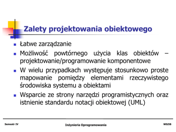 Zalety projektowania obiektowego Semestr IV Łatwe zarządzanie Możliwość powtórnego użycia klas obiektów – projektowanie/programowanie komponentowe W wielu przypadkach występuje stosunkowo proste mapowanie pomiędzy elementami rzeczywistego środowiska systemu a obiektami Wsparcie ze strony narzędzi programistycznych oraz istnienie standardu notacji obiektowej (UML) Inżynieria Oprogramowania WSZiB Obiekty - komunikacja Koncepcyjnie obiekty komunikują się poprzez przesyłanie wiadomości/komunikatów gdzie nazwa wiadomości określa usługę do wykonania. Wiadomość zawiera również informacje niezbędne do wykonania operacji oraz posiada możliwość zwracania wartości będących wynikiem wykonania operacji W praktyce przekazywanie wiadomości realizowne jest jako wywołanie metod zdefiniowanych w klasie obiektu: Semestr IV Nazwa metody == nazwa wiadomości Informacja == wartości paremetrów metody Wynik operacji == wartość zwracana przez metodę Inżynieria Oprogramowania WSZiB Proces tworzenia modelu obiektowego Identyfikacja kontekstu (środowiska) pracy systemu Określenie przypadków (modeli) wykorzystania systemu Budowa obiektowego modelu architektury systemu: Semestr IV Identyfikacja klas i obiektów Identyfikacja związków klas i obiektów Identyfikacja atrybutów klas Identyfikacja i definiowanie metod i komunikatów – interfejsy obiektów Inżynieria Oprogramowania WSZiB Przykład - system gromadzenia informacji pogodowych - opis System gormadzenia informacji pogodowych (weather forecast system) służy do automatycznej generacji map pogodowych na podstawie danych gromadzonych przez zdalne stacje pogodowe (weather station) i inne źródła informacji pogodowych takie jak satelity i balony obserwcyjne. Każda stacja pogodowa przesyła zgromadzone dane do centralnego komputera w odpowiedzi na jego zapytanie. Komputer centralny weryfikuje otrzymane dane oraz integruje wszystkie dane przesłane z różnych źródeł. Zgromadzone w ten sposób dane przechowywane są w archiwum danych. Na podstwie zapisanych informacji i bazy map system generuje lokalne mapy pogodowe dla różnych obszarów. Stworzone mapy mogą być drukowane na ploterze lub wyświetlane w różnych formatach. Semestr IV Inżynieria Oprogramowania WSZiB Opis stacji pogodowej (weather station) Stacja pogodowa (weather station) jest zbiorem przyrządów pomiarowych kontrolowanych za pomocą specjalizowanego oprogramowania. Przyrządy pomiarowe gromadzą dane pogodowe (np. temperaturę powietrza, wilgotność itp.), które następnie zostają poddane wstępnej analizie i w odpowiedzi na żądanie zostają przesłane do centralnego komputera. W skład przyrządów pomiarowych wchodzą termometry mierzące temperaturę powietrza i ziemi, prędkość wiatru, ciśnienie oraz ilość opadów. Dane z poszczególnych przyrządów odczytywane są w pięciominutowych odstępach. W momencie gdy zostanie odebrane żądanie przesyłu danych, oprogramowanie stacji pogodowej przetwarza zgromadzone dane i przesyła wyniki przetwarzania do komputera centralnego. Semestr IV Inżynieria Oprogramowania WSZiB Identyfikacja kontekstu pracy systemu Kontekst pracy systemu określa poszczególne elementy wchodzące w skład systemu lub stanowiące jego otoczenie, z którym system wchodzi w interakcję Semestr IV Inżynieria Oprogramowania WSZiB Określenie przypadków wykorzystania systemu – przykład stacji pogodowej Dynamiczny model określający sposób interakcji systemu z poszczególnymi elementami otaczającego środowiska Semestr IV Inżynieria Oprogramowania WSZiB Opis przypadku użycia (ang. use-case) Semestr IV System: stacja pogodowa (weather station) Use-case: send report Aktorzy: podsystem data collection Przetwarzanie: w odpowiedzi na żądanie stacja pogodowa przesyła dane zgromadzone przez poszczególne przyrządy pomiarowe w ostatnim okresie gromadzenia danych. Przesyłane dane dotyczą minimalnej, maksymalnej i średniej temperatury powietrza i ziemi, minimalnego, maksymalnego i średniego ciśnienia powietrza, minimalnej, maksymalnej i średniej prędkości wiatru, całkowitej ilości opadów Zdarzenie: podsystem data collection zestawia modemowe połączenie do stacji pogodowej i przesyła żądanie transmisji zgromadzonych danych Odpowiedź: zgromadzone w ostatnim okresie dane zostają przesłane do podsystemu data collection Komentarz: podystem data collection wysyła żądania przesłania raportów do stacji pogodowych w odstępach nie krótszych niż 10 minut Inżynieria Oprogramowania WSZiB Budowa obiektowego modelu architektury systemu Identyfikacja klas i obiektów Identyfikacja metod i komunikatów Semestr IV Identyfikacja związków klas i obiektów Identyfikacja i definiowanie atrybutów Inżynieria Oprogramowania WSZiB Logiczny model architektury systemu dla stacji pogodowej Semestr IV Inżynieria Oprogramowania WSZiB Identyfikacja klas i obiektów – metoda klasyczna (1/2) Poszukiwanie klas obiektów polegające na obserwacji, klas i obiektów w innych systemach. Na podstawie analizy listy typowych klas określa się klasy obiektów w analizowanym systemie. Do typowych klas można zaliczyć: Semestr IV przedmiot namacalne (np.: samochód, czujnik) role pełnione przez osoby (np.: pracownik, student, wykładowca) zdarzenia, o których system przechowuje informacje (np.: zamówienie, dostawa) interakcje pomiędzy osobami, systemami, o których system przechowuje informacje (np.: spotkanie, konferencja) Inżynieria Oprogramowania WSZiB Identyfikacja klas i obiektów – metoda klasyczna (2/2) lokalizacje – miejsca przeznaczone dla ludzi lub przedmiotów (np.: magazyn, mieszkanie) grupy przedmiotów namacalnych (np.: czujniki, studenci) organizacje (np.: firma, wydział, uczelnia) koncepcje (np.: miara jakości) dokumenty (np.: faktura, prawo jazdy) interfejsy dla sytemów zewnętrznych lub urządzeń Należy zwrócić uwagę, że pewne elementy mogą posiadać dwojakie znaczenie w zale