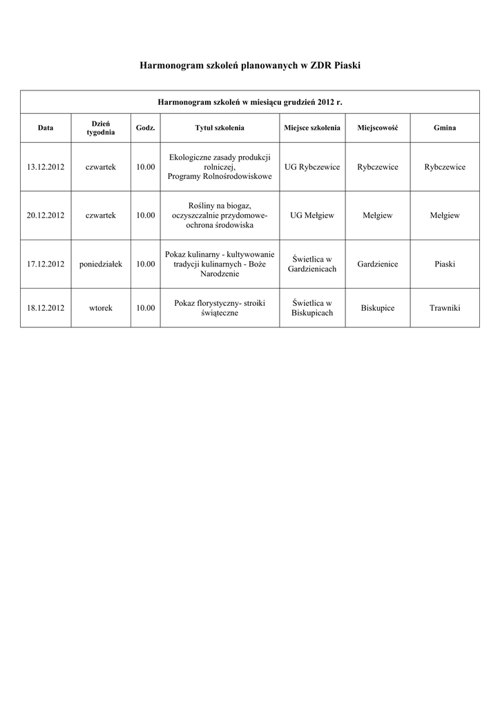 Harmonogram szkoleń planowanych w ZDR Piaski Harmonogram szkoleń w miesiącu grudzień 2012 r. Data Dzień tygodnia Godz. Tytuł szkolenia Miejsce szkolenia Miejscowość Gmina 13.12.2012 czwartek 10.00 Ekologiczne zasady produkcji rolniczej, Programy Rolnośrodowiskowe UG Rybczewice Rybczewice Rybczewice 20.12.2012 czwartek 10.00 Rośliny na biogaz, oczyszczalnie przydomoweochrona środowiska UG Mełgiew Mełgiew Mełgiew 17.12.2012 poniedziałek 10.00 Pokaz kulinarny - kultywowanie tradycji kulinarnych - Boże Narodzenie Świetlica w Gardzienicach Gardzienice Piaski 18.12.2012 wtorek 10.00 Pokaz florystyczny- stroiki świąteczne Świetlica w Biskupicach Biskupice Trawniki