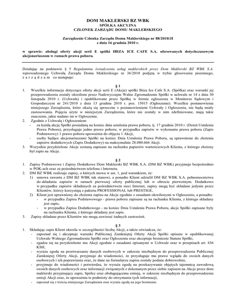 DOM MAKLERSKI BZ WBK SPÓŁKA AKCYJNA CZŁONEK ZARZĄDU DOMU MAKLERSKIEGO Zarządzenie Członka Zarządu Domu Maklerskiego nr 88/2010/JI z dnia 16 grudnia 2010 r. w sprawie: obsługi oferty akcji serii E spółki IBIZA ICE CAFE S.A. oferowanych dotychczasowym akcjonariuszom w ramach prawa poboru. Działając na podstawie § 5 Regulaminu świadczenia usług maklerskich przez Dom Maklerski BZ WBK S.A. wprowadzonego Uchwałą Zarządu Domu Maklerskiego nr 36/2010 podjętą w trybie głosowania pisemnego, z a r z ą d z a m co następuje: 1. 2. 3. 1. 2. 3. 1. §1 Wszelkie informacje dotyczące oferty akcji serii E (Akcje) spółki Ibiza Ice Cafe S.A. (Spółka) oraz warunki jej przeprowadzenia zostały określone przez Nadzwyczajne Walne Zgromadzenie Spółki w uchwale nr 14 z dnia 30 listopada 2010 r. (Uchwała) i opublikowane przez Spółkę w formie ogłoszenia w Monitorze Sądowym i Gospodarczym nr 241/2010 z dnia 13 grudnia 2010 r. poz. 15015 (Ogłoszenie). Wszelkie postanowienia niniejszego Zarządzenia, które okaŜą się sprzeczne z postanowieniami Uchwały i Ogłoszenia, nie będą miały zastosowania. Pojęcia uŜyte w niniejszym Zarządzeniu, które nie zostały w nim zdefiniowane, mają takie znaczenie, jakie nadano im w Ogłoszeniu. Zgodnie z Uchwałą i Ogłoszeniem: - za kaŜdą akcję Spółki posiadaną na koniec dnia ustalenia prawa poboru, tj. 17 grudnia 2010 r. (Dzień Ustalenia Prawa Poboru), przysługuje jedno prawo poboru; w przypadku zapisów w wykonaniu prawa poboru (Zapis Podstawowy) 1 prawo poboru upowaŜnia do objęcia 1 Akcji, - osoby będące akcjonariuszami Spółki na koniec Dnia Ustalenia Prawa Poboru, są uprawnione do złoŜenia zapisów dodatkowych (Zapis Dodatkowy) na maksymalnie 28.080.666 Akcji. Wszystkie przydzielone Akcje zostaną zapisane na rachunku papierów wartościowych Klienta, z którego złoŜony był zapis na Akcje. §2 Zapisy Podstawowe i Zapisy Dodatkowe Dom Maklerski BZ WBK S.A. (DM BZ WBK) przyjmuje bezpośrednio w POK-ach oraz za pośrednictwem telefonu i Internetu. DM BZ WBK realizuje zapisy, o których mowa w ust. 1, pod warunkiem, Ŝe: 1) umowa zawarta z DM BZ WBK tak stanowi, a ponadto Klient udzielił DM BZ WBK S.A. pełnomocnictwa do składania zapisów w ramach pierwszej oferty publicznej lub w obrocie pierwotnym. Dodatkowo w przypadku zapisów składanych za pośrednictwem sieci Internet, zapisy mogą być składane jedynie przez Klientów, którzy korzystają z pakietu PROFESSIONAL lub PRESTIGE, 2) Klient jest uprawniony do złoŜenia zapisu na Akcje zgodnie z zasadami określonymi w Ogłoszeniu, a ponadto: - w przypadku Zapisu Podstawowego - prawa poboru zapisane są na rachunku Klienta, z którego składany jest zapis, - w przypadku Zapisu Dodatkowego - na koniec Dnia Ustalenia Prawa Poboru, akcje Spółki zapisane były na rachunku Klienta, z którego składany jest zapis. Zapisy składane przez Klientów nie mogą zawierać Ŝadnych zastrzeŜeń. §3 Składając zapis Klient określa w szczególności liczbę Akcji, a takŜe oświadcza, Ŝe: - zapoznał się i akceptuje warunki Publicznej Zamkniętej Oferty Akcji Spółki opisane w opublikowanej Uchwale Walnego Zgromadzenia Spółki oraz Ogłoszeniu oraz akceptuje brzmienie Statutu Spółki, - zgadza się na przydzielenie mu Akcji zgodnie z zasadami opisanymi w Uchwale oraz w przepisach art. 436 KSH, - wyraŜa zgodę na przetwarzanie danych osobowych w zakresie niezbędnym do przeprowadzenia Publicznej Zamkniętej Oferty Akcji, przyjmuje do wiadomości, Ŝe przysługuje mu prawo wglądu do swoich danych osobowych i ich poprawiania oraz, Ŝe dane na formularzu zapisu zostały podane dobrowolnie, - przyjmuje do wiadomości i potwierdza, Ŝe wyraŜa zgodę na przekazywanie objętych tajemnicą zawodową swoich danych osobowych oraz informacji związanych z dokonanym przez siebie zapisem na Akcje przez dom maklerski przyjmujący zapis, Spółce oraz obsługującemu emisję, w zakresie niezbędnym do przeprowadzenia emisji Akcji oraz, Ŝe upowaŜnia te podmioty do otrzymania tych informacji, zapoznał się z treścią niniejszego Zarządzenia oraz wyraŜa zgodę na jego brzmienie. - 2. 1. 2. 1. 2. 3. DM BZ WBK nie ponosi odpowiedzialności za przydzielenie mniejszej liczby Akcji niŜ określona w zapisie, lub za nieprzydzielenie ich w ogóle, zgodnie z odpowiednimi zapisami Ogłoszenia. §4 Środki na opłacenie zapisu DM BZ WBK pobiera z rachunku Klienta, z którego składany jest zapis, w chwili składania tego zapisu. Na opłacenie zapisu wykorzystane mogą być jedynie wolne środki finansowe. W systemie “Inwestor online”, środki takie oznaczone są jako “Środki pod wypłatę lub zlecenia na rynek terminowy”. Środki w wysokości równej wartości zapisu muszą znajdować się na rachunku Klienta w chwili składania zapisu. W przeciwnym wypadku zapis nie zostanie przyjęty. W przypadku wystąpienia przyczyn powodujących konieczność zwrotu całości lub części kwoty wpłaconej na opłacenie zapisu, zwrot ten zostanie dokonany na rachunek pienięŜny słuŜący do obsługi rachunku papierów wartościowych, z którego złoŜony był zapis na Akcje. §5 Zapisy Podstawowe i Zapisy Dodatkowe składane za pośrednictwem telefonu DM BZ WBK przyjmuje w terminie składania zapisów określonym przez Spółkę, z zastrzeŜeniem ust. 2. Zapisy, o których mowa w ust. 1, składane za pośrednictwem telefonu, na zasadach przewidzianych dla poszczególnych jednostek DM BZ WBK, określonych w odrębnych zarządzeniach lub umowach z Klientami, DM BZ WBK przyjmuje w następujących lokalizacjach: 1/ Zespół Contact Center – w dni robocze w godzinach od 6:00 do 22:00 z zastrzeŜeniem, Ŝe pierwszego dnia przyjmowania zapisów od godz. 8:00, a ostatniego dnia do godz. 20:00, 2/ Zespół Maklerów Transakcyjnych – w dni robocze w godzinach pracy tego zespołu, z zastrzeŜeniem Ŝe pierwszego dnia przyjmowania zapisów od godz. 8:00, oraz z zastrzeŜeniem ust. 3, 3/ w POK-ac