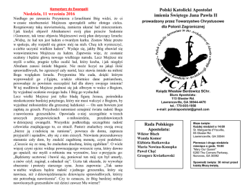 Komentarz do Ewangelii Niedziela, 11 września 2016 Niedługo po zawarciu Przymierza z Izraelitami Bóg widzi, że ci w czasie nieobecności Mojżesza sporządzili sobie złotego cielca. Rozgniewany taką niewiernością, zamierza ukarać lud zniszczeniem. I jak kiedyś objawił Abrahamowi swój plan przeciw Sodomie i Gomorze, tak teraz objawia Mojżeszowi swój plan dotyczący Izraela: „Widzę, że lud ten jest ludem o twardym karku. Zostaw Mnie przeto w spokoju, aby rozpalił się gniew mój na nich. Chcę ich wyniszczyć, a ciebie uczynić wielkim ludem”. Wydaje się, jakby Bóg obawiał się wstawiennictwa Mojżesza za ludem. Zapewnia więc, że zostanie ocalony i będzie głową nowego wielkiego narodu. Lecz Mojżesz nie myśli o sobie, pragnie tylko ocalić lud, który kocha, i jak niegdyś Abraham zanosi śmiałe błaganie. Nie może liczyć na jakąś ilość sprawiedliwych, bo zgrzeszył cały naród, lecz stawia śmiało na miłość Boga względem Izraela. Przypomina Mu cuda, dzięki którym wyprowadził go z Egiptu, a także obietnice dane patriarchom, perswaduje że powinien oszczędzić lud dla sławy swojego imienia! W tej modlitwie Mojżesz podnosi się jak olbrzym w walce z Bogiem, by wyjednać ocalenie swojego ludu. I Bóg go wysłuchał. Lecz wielki Mojżesz jest tylko bladą figurą Jezusa, pośrednika nieskończenie bardziej potężnego, który nie musi walczyć z Bogiem, by wyjednać miłosierdzie dla grzesznej ludzkości — On sam bowiem jest zapłatą za grzech. Przychodzi natomiast oznajmić światu radość Boga z nawrócenia grzeszników. Opowiada o niej szczególnie w trzech uroczych przypowieściach o miłosierdziu, przedstawionych w dzisiejszej ewangelii. Wszystkie podkreślają szczególnie radość człowieka znajdującego to, co stracił. Pasterz znalazłszy swoją owcę „bierze ją z radością na ramiona”, powraca do domu, zaprasza przyjaciół i sąsiadów, aby się z nim cieszyli. Niewiasta przeszukawszy starannie cały dom, by znaleźć zagubioną monetę, czyni podobnie: „Cieszcie się ze mną, bo znalazłam drachmę, którą zgubiłam”. O wiele więcej czyni ojciec widząc powracającego wreszcie syna, który dawno go opuścił; nie myśli o robieniu mu wyrzutów, lecz o przyjęciu go: „Będziemy ucztować i bawić się, ponieważ ten mój syn był umarły, a znów ożył; zaginął, a odnalazł się”. Uczta tak okazała, że wywołuje oburzenie i protesty starszego syna. Jezus zapewnia: „Tak samo w niebie większa będzie radość z jednego grzesznika, który się nawraca, niż z dziewięćdziesięciu dziewięciu sprawiedliwych, którzy nie potrzebują nawrócenia”. Czy to oznacza, że Bóg bardziej miłuje nawróconych grzeszników niż dzieci zawsze Mu wierne? Polski Katolicki Apostolat imienia Świętego Jana Pawła II prowadzony przez Towarzystwo Chrystusowe dla Polonii Zagranicznej Ksiądz Wiesław Berdowicz SChr. Biuro Apostolatu: 113 Gloster Rd. Lawrenceville, GA 30044-4470 tel.: 770-935-1958 e-mail: [email protected] Rada Polskiego Apostolatu: Wiktor Błach Wanda Komor Elżbieta Rutkowska Maria Nowina-Konopka Paweł Chęć Grzegorz Kwiatkowski Msze święte: Każdej niedzieli o 14:00 St. Marguerite d'Youville, 85 Gloster Rd. Lawrenceville, GA 30044 Pierwsza i druga niedziela miesiąca o godz. 19:00 "Mary Our Queen" 6260 The Corners Parkway, Norcross, GA 30092 Spowiedź święta: 30 minut przed każdą Mszą świętą. Biuletyn: 11 września 2016 24 niedziela zwykła Wstanę i wrócę do mojego ojca. Służba liturgiczna OGŁOSZENIA 11 września 2016 2:00pm St. Marguerite I czytanie Jakub Białek II czytanie Gracjan Jezierski Szafarze Józef Mądrzyk Adam Śniady 11 września 2016 7:00pm MOQ I czytanie Genowefa Klas II czytanie Anna Górczyńska Katecheza Rozpoczynamy dziś rok katechetyczny, na razie powoli, zapisami i sprawami organizacyjnymi. Składki 4 września St Marguerite $466 MOQ $577 Potrzebna tygodniowa składka $1500. Serdeczne Bóg zapłać za wsparcie. *************************************************************************************************************** Intencje Mszalne Niedziela, 11 września 2016 Md'Y - 2:00pm – + Stanisław Cieślak i zm. z rodziny. ++ Anna, Franciszek Maro MOQ – 7:00pm – O błogosławieństwo Boże dla Pauliny Jezierskiej z okazji ur. Niedziela, 18 września 2016 Md'Y - 2:00pm Dziękczynna i o błog. Boże, zdrowie i potrzebne łaski dla całej rodziny Szymonik + Eleonora Cieślak (5. rocz.) Wszystkim zaangażowanym w Festiwal Pierogów serdeczne Bóg zapłać. Wygląda na to, że tegoroczny festiwal okazał się sukcesem. Sprzedaliśmy więcej pierogów, gołąbków i piwa niż rok temu, ale musieliśmy kupić skillet oraz choć częściowo zwrócić koszty podróży (nie wiemy czy konsulat nam zwróci). Według wstępnych podliczeń wyrównaliśmy zeszłoroczny wynik 18.700 czystego zysku. To dzięki Waszej ofierze, pracy i poświęceniu Polski Apostolat może istnieć i funkcjonować.