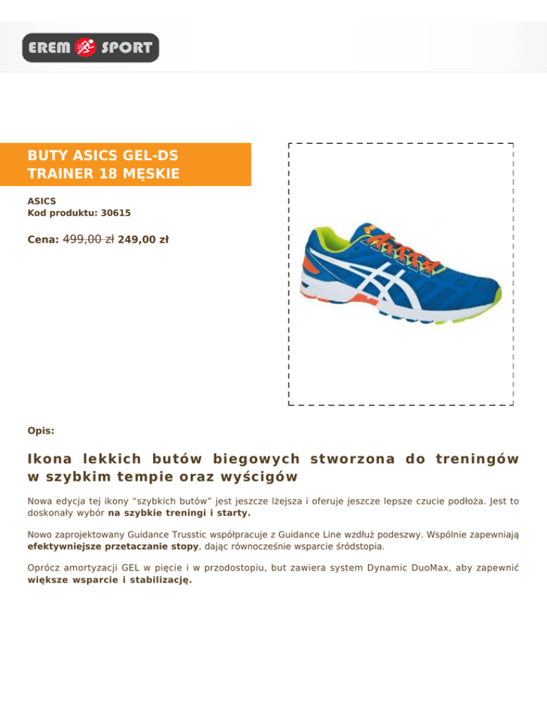 BUTY ASICS GEL-DS TRAINER 18 MĘSKIE ASICS Kod produktu: 30615 Cena: 499,00 zł 249,00 zł Opis: Ikona lekkich butów biegowych stworzona do treningów w szybkim tempie oraz wyścigów Nowa edycja tej ikony “szybkich butów” jest jeszcze lżejsza i oferuje jeszcze lepsze czucie podłoża. Jest to doskonały wybór na szybkie treningi i starty. Nowo zaprojektowany Guidance Trusstic współpracuje z Guidance Line wzdłuż podeszwy. Wspólnie zapewniają efektywniejsze przetaczanie stopy, dając równocześnie wsparcie śródstopia. Oprócz amortyzacji GEL w pięcie i w przodostopiu, but zawiera system Dynamic DuoMax, aby zapewnić większe wsparcie i stabilizację. Zapiętek Clutch Counter zapewnia przytulne i dynamiczne dopasowanie wokół pięty. Cholewka Hotmelt zawiera mniej szwów, aby zredukować ryzyko obtarć i zapewnić doskonałe dopasowanie. Podeszwa w GEL-DS TRAINER 18 jest stworzona z WetGrip RubberSponge, zaprojektowana tak, aby zapewnić przyczepność nawet na mokrej nawierzchni. Idealny dla: Pronator Tabela rozmiarów: