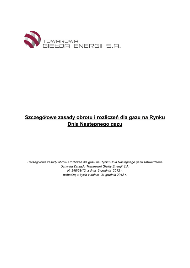 Szczegółowe zasady obrotu i rozliczeń dla gazu na Rynku Dnia Następnego gazu Szczegółowe zasady obrotu i rozliczeń dla gazu na Rynku Dnia Następnego gazu zatwierdzone Uchwałą Zarządu Towarowej Giełdy Energii S.A. Nr 248/63/12 z dnia 6 grudnia 2012 r. wchodzą w życie z dniem 31 grudnia 2012 r. Rozdział 1. Definicje. 1) Członek Giełdy – podmiot posiadający status Członka Giełdy, dopuszczony przez Zarząd Giełdy do działania na RDNiBg, 2) Dzień Dostawy – odpowiada dobie gazowej w rozumieniu IRiESPg i oznacza kolejne godziny począwszy od godziny 06:00 dnia bieżącego do godziny 06:00 dnia następnego, w których gaz zakontraktowany na giełdzie w Dniu Obrotu zostanie dostarczony lub odebrany, 3) Dzień Obrotu – dzień, w którym odbywa się określenie kursów dla danego Dnia Dostawy, 4) giełda – Rynek Towarów Giełdowych prowadzony przez Towarową Giełdę Energii S.A. zgodnie z Regulaminem Giełdy, 5) Giełda, TGE – Towarowa Giełda Energii S.A., 6) Grafik Pracy – program dostaw lub odbioru gazu zawarty w nominacji dla pojedynczego Kodu ZUP, w każdej godzinie Dnia Dostawy, obejmujący gaz zakontraktowany na RDNg oraz RTT, 7) IRiESPg – rozumie się przez to Instrukcję Ruchu i Eksploatacji Sieci Przesyłowej opracowaną przez Operatora Gazociągów Przesyłowych GAZ-SYSTEM S.A., zgodnie z art. 9 g) ustawy Prawo energetyczne; 8) Izba Rozliczeniowa – Izba Rozliczeniowa Giełd Towarowych S.A. z siedzibą w Warszawie prowadząca izbę rozliczeniową i rozrachunkową, która pełni funkcję giełdowej izby rozrachunkowej, zgodnie z ustawą o obrocie instrumentami finansowymi, 9) Kod ZUP – rozumie się przez to kod służący do identyfikacji ZUP; 10) kontrakt – umowa zawarta na RDNg pomiędzy Członkami Giełdy, w wyniku której dochodzi do przeniesienia własności gazu ze sprzedającego na kupującego, 11) kurs – jednolita cena 1 MWh gazu w danej godzinie Dnia Dostawy, określana na RDNg, 12) niepubliczna strona internetowa – strona internetowa dostępna tylko dla danego Członka Giełdy i dla Giełdy, 13) nominacja – rozumie się przez to nominację zdefiniowaną w IRiESPg, 14) Operator Systemu Przesyłowego Gazowego lub OSPg – rozumie się przez to Operatora Gazociągów Przesyłowych GAZ-SYSTEM S. A. z siedzibą w Warszawie, 15) Portfel – jeden lub grupa obiektów dostawy lub odbioru, należących do tego samego Członka Giełdy, dla których przygotowywany jest jeden Grafik Pracy, 16) Prawo Energetyczne – ustawa z dnia 10 kwietnia 1997 r. Prawo energetyczne (j.t. Dz. U. z 2006 r. Nr 89; poz. 625; z późń. zm.), 17) RDNg – wyodrębniony w ramach RDNiBg Rynek Dnia Następnego gazu, prowadzony przez Giełdę, 18) RDNiBg – Rynek Dnia Następnego i Bieżącego gazu, prowadzony przez Giełdę, 19) RTT – Rynek Terminowy Towarowy prowadzony przez Giełdę, 20) Regulamin Giełdy – Regulamin obrotu Rynku Towarów Giełdowych Towarowej Giełdy Energii S.A., 21) system informatyczny giełdy – zespół urządzeń i oprogramowania, w szczególności wyspecjalizowany program komputerowy, za pośrednictwem którego odbywa się obrót na RDNg, 22) Szczegółowe zasady obrotu i rozliczeń – niniejsze Szczegółowe zasady obrotu i rozliczeń dla gazu na Rynku Dnia Następnego gazu, 23) transakcja – umowa sprzedaży gazu zawarta na giełdzie między Członkami Giełdy, Strona 2 z 11 24) Usługa Giełdowa – prowizja, należna Giełdzie od Członka Giełda z tytułu transakcji zawartych przez Członka Giełdy, naliczana zgodnie z Regulaminem Giełdy, 25) Warunki obrotu – odpowiednie Warunki obrotu dla programu instrumentów terminowych na gaz uchwalane przez Zarząd Giełdy zgodnie z § 101 ust. 3 Regulaminu Giełdy, 26) zlecenie – złożona przez Członka Giełdy oferta kupna lub sprzedaży gazu na RDNg, 27) ZUP – rozumie się przez to Zleceniodawcę Usługi Przesyłania zdefiniowanego w IRiESPg. Strona 3 z 11 Rozdział 2. Zasady obrotu. Oddział 1. Organizacja notowań na RDNg. §1. 1. Obrót na RDNg prowadzony jest na jeden dzień poprzedzający Dzień Dostawy na instrumencie określonym w specyfikacji stanowiącej Załącznik nr 1 do Szczegółowych zasad obrotu i rozliczeń. 2. Przedmiotem obrotu na RDNg jest gaz ziemny wysokometanowy grupy E, zgodny ze standardem określonym przez Zarząd Giełdy. §2. W dobach zmiany Czasu Urzędowego w Polsce, regulowanego rozporządzeniem Prezesa Rady Ministrów w sprawie wprowadzenia i odwołania czasu letniego środkowoeuropejskiego liczba godzin w terminie wykonania kontraktu jest odpowiednio zmieniona stosownie do treści rozporządzenia (tj. 23 lub 25 godzin). Oddział 2. Harmonogram notowań na RDNg. §3. 1. Notowania odbywają się codziennie wg poniższego harmonogramu: Godziny Do 18:30 na 2 dni przed Dniem Dostawy Od 8:00 na 1 dzień przed Dniem Dostawy do 12:30 na 1 dzień przed Dniem Dostawy Faza notowań Aktualizacja zabezpieczeń Wprowadzenie aktualnych zabezpieczeń. Notowania ciągłe Przyjmowanie zleceń; zlecenia można usuwać i modyfikować; zlecenia są sprawdzane ze względu na stan zabezpieczeń. Do 13:00 na 1 dzień przed Dniem Dostawy Aktualizacja Grafików Pracy przez Członków Giełdy Do 14:00 na 1 dzień przed Dniem Dostawy Zgłaszanie transakcji handlowych do OSPg Do 17:00 na 1 dzień przed Dniem Dostawy Opublikowanie wyników notowań na publicznej stronie internetowej Oddział 3. Zlecenia na sesje RDNg. §4. Członkowie Giełdy składają zlecenia w odniesieniu do Portfeli. W systemie informatycznym giełdy Portfel jest zdefiniowany jako konto. Do Portfela przyporządkowany jest Kod ZUP. §5. Każdy Członek Giełdy posiada w systemie informatycznym giełdy tyle Portfeli ile posiada Kodów ZUP. Członek Giełdy może posiadać Portfele dla Kodów ZUP Udostępnionych. §6. Każdy Portfel może być przypisany tylko do jednego Członka Giełdy, chyba że Członek Giełdy udostępni ten Portfel innemu Członkowi Giełdy na zasadach określonych w Regulaminie 