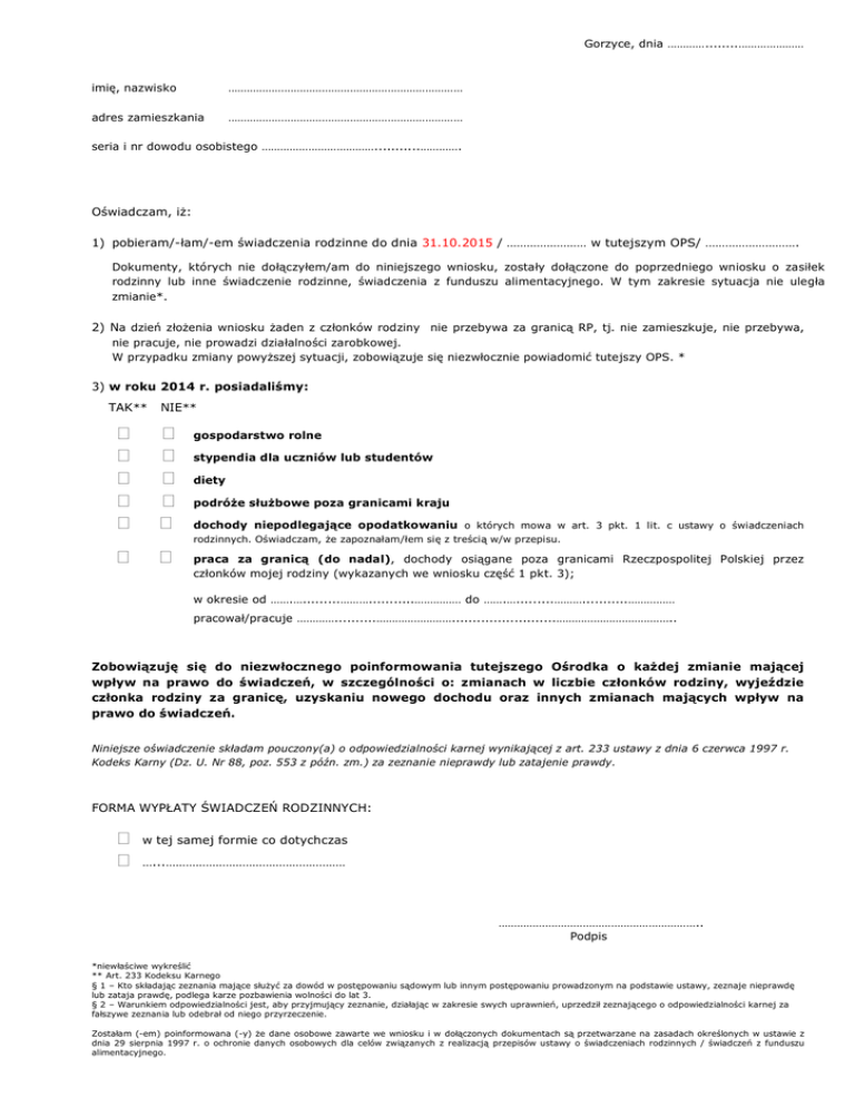 Gorzyce, dnia …………........………………… imię, nazwisko ………………………………………………………………… adres zamieszkania ………………………………………………………………… seria i nr dowodu osobistego ………………………………...........…………. Oświadczam, iż: 1) pobieram/-łam/-em świadczenia rodzinne do dnia 31.10.2015 / …………………… w tutejszym OPS/ ………………………. Dokumenty, których nie dołączyłem/am do niniejszego wniosku, zostały dołączone do poprzedniego wniosku o zasiłek rodzinny lub inne świadczenie rodzinne, świadczenia z funduszu alimentacyjnego. W tym zakresie sytuacja nie uległa zmianie*. 2) Na dzień złożenia wniosku żaden z członków rodziny nie przebywa za granicą RP, tj. nie zamieszkuje, nie przebywa, nie pracuje, nie prowadzi działalności zarobkowej. W przypadku zmiany powyższej sytuacji, zobowiązuje się niezwłocznie powiadomić tutejszy OPS. * 3) w roku 2014 r. posiadaliśmy: TAK** NIE** gospodarstwo rolne stypendia dla uczniów lub studentów diety podróże służbowe poza granicami kraju dochody niepodlegające opodatkowaniu o których mowa w art. 3 pkt. 1 lit. c ustawy o świadczeniach rodzinnych. Oświadczam, że zapoznałam/łem się z treścią w/w przepisu. praca za granicą (do nadal), dochody osiągane poza granicami Rzeczpospolitej Polskiej przez członków mojej rodziny (wykazanych we wniosku część 1 pkt. 3); w okresie od …….….........………...........…………… do …….….........………...........…………… pracował/pracuje …………..........…………………….........................……………………………….. Zobowiązuję się do niezwłocznego poinformowania tutejszego Ośrodka o każdej zmianie mającej wpływ na prawo do świadczeń, w szczególności o: zmianach w liczbie członków rodziny, wyjeździe członka rodziny za granicę, uzyskaniu nowego dochodu oraz innych zmianach mających wpływ na prawo do świadczeń. Niniejsze oświadczenie składam pouczony(a) o odpowiedzialności karnej wynikającej z art. 233 ustawy z dnia 6 czerwca 1997 r. Kodeks Karny (Dz. U. Nr 88, poz. 553 z późn. zm.) za zeznanie nieprawdy lub zatajenie prawdy. FORMA WYPŁATY ŚWIADCZEŃ RODZINNYCH: w tej samej formie co dotychczas …...……………………………………………… ……………………………………………………….. Podpis *niewłaściwe wykreślić ** Art. 233 Kodeksu Karnego § 1 – Kto składając zeznania mające służyć za dowód w postępowaniu sądowym lub innym postępowaniu prowadzonym na podstawie ustawy, zeznaje nieprawdę lub zataja prawdę, podlega karze pozbawienia wolności do lat 3. § 2 – Warunkiem odpowiedzialności jest, aby przyjmujący zeznanie, działając w zakresie swych uprawnień, uprzedził zeznającego o odpowiedzialności karnej za fałszywe zeznania lub odebrał od niego przyrzeczenie. Zostałam (-em) poinformowana (-y) że dane osobowe zawarte we wniosku i w dołączonych dokumentach są przetwarzane na zasadach określonych w ustawie z dnia 29 sierpnia 1997 r. o ochronie danych osobowych dla celów związanych z realizacją przepisów ustawy o świadczeniach rodzinnych / świadczeń z funduszu alimentacyjnego. OŚWIADCZENIE O DOCHODACH RODZINY Oświadczam, że w okresie od 01.01.2014 r. do chwili obecnej członkowie mojej rodziny, w skład której wchodzą osoby wykazane w części I wniosku o ustalenie prawa do zasiłku rodzinnego, osiągali dochody z następujących tytułów/źródeł, w podanych niżej okresach (od-do). Oświadczam, że zapoznałem się z treścią art. 3 ustawy o świadczeniach rodzinnych, który stanowi m.in., że dochodem rodziny uwzględnianym przy ustalaniu prawa do świadczeń rodzinnych są zarówno dochody podlegające opodatkowaniu jak i nie podlegające opodatkowaniu (wymienione w ustawowej definicji) uzyskane na terenie RP lub poza jej granicami. Oświadczam, że poza wymienionymi przeze mnie niżej dochodami moja rodzina nie uzyskała innych dochodów. Zobowiązuję się powiadomić niezwłocznie na piśmie OPS Gorzyce o uzyskaniu nowego dochodu przez członka rodziny. Oświadczam że w okresie od 01.01.2014 do nadal: Posiadałam (-em) lub posiadam dochody: okres od – do Liczba tytuł/źródło oraz miesięcy nazwa firmy instytucji przedkładam dokumenty na potwierdzenie daty oraz rodzaju dochodu utraconego, a także kwoty dochodu utraconego Mój mąż / moja żona ………....…………………….……………. posiadał/a (lub posiada nadal) dochody: Moje dzieci: ……………………………………………………..……..…… posiadały (lub posiadają nadal) dochody: Podpis osoby składającej oświadczenie: ………………………………….………………………………