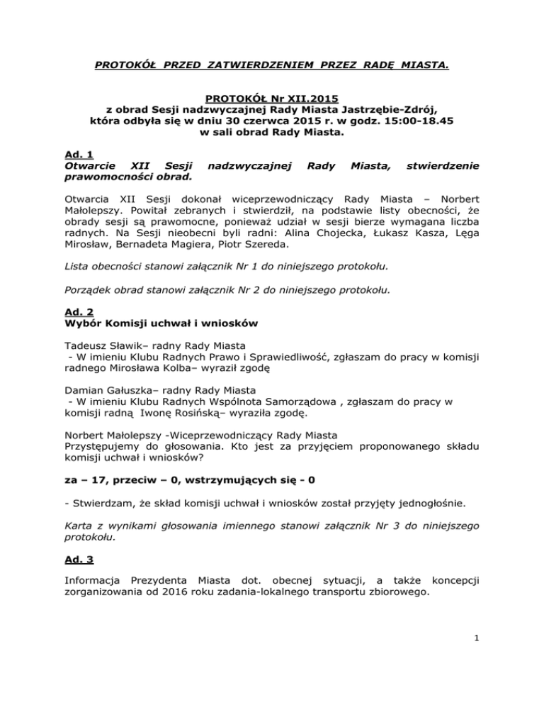 PROTOKÓŁ PRZED ZATWIERDZENIEM PRZEZ RADĘ MIASTA. PROTOKÓŁ Nr XII.2015 z obrad Sesji nadzwyczajnej Rady Miasta Jastrzębie-Zdrój, która odbyła się w dniu 30 czerwca 2015 r. w godz. 15:00-18.45 w sali obrad Rady Miasta. Ad. 1 Otwarcie XII Sesji prawomocności obrad. nadzwyczajnej Rady Miasta, stwierdzenie Otwarcia XII Sesji dokonał wiceprzewodniczący Rady Miasta – Norbert Małolepszy. Powitał zebranych i stwierdził, na podstawie listy obecności, że obrady sesji są prawomocne, ponieważ udział w sesji bierze wymagana liczba radnych. Na Sesji nieobecni byli radni: Alina Chojecka, Łukasz Kasza, Lęga Mirosław, Bernadeta Magiera, Piotr Szereda. Lista obecności stanowi załącznik Nr 1 do niniejszego protokołu. Porządek obrad stanowi załącznik Nr 2 do niniejszego protokołu. Ad. 2 Wybór Komisji uchwał i wniosków Tadeusz Sławik– radny Rady Miasta - W imieniu Klubu Radnych Prawo i Sprawiedliwość, zgłaszam do pracy w komisji radnego Mirosława Kolba– wyraził zgodę Damian Gałuszka– radny Rady Miasta - W imieniu Klubu Radnych Wspólnota Samorządowa , zgłaszam do pracy w komisji radną Iwonę Rosińską– wyraziła zgodę. Norbert Małolepszy -Wiceprzewodniczący Rady Miasta Przystępujemy do głosowania. Kto jest za przyjęciem proponowanego składu komisji uchwał i wniosków? za – 17, przeciw – 0, wstrzymujących się - 0 - Stwierdzam, że skład komisji uchwał i wniosków został przyjęty jednogłośnie. Karta z wynikami głosowania imiennego stanowi załącznik Nr 3 do niniejszego protokołu. Ad. 3 Informacja Prezydenta Miasta dot. obecnej sytuacji, a także koncepcji zorganizowania od 2016 roku zadania-lokalnego transportu zbiorowego. 1 Anna Hetman - Panie Przewodniczący, zaproszeni goście, Radni. Chcąc przedstawić Państwu informację na temat aktualnej sytuacji komunikacji miejskiej oraz perspektyw od 2016 r. Chciałabym swoją wypowiedź podzielić na kilka osób. Pewne informacje przedstawi Prezydent Ryszard Rakoczy, który będzie mówił o możliwościach komunikacji od 2016 r. oraz pewne dane przedstawi prof. Tomanek. Na wstępie chciałabym przedstawić jaki stan komunikacji miejskiej istnieje od 8 grudnia 2014 czyli to co zastałam obejmując Urząd. W grudniu został rozstrzygnięty przetarg na organizację komunikacji miejskiej. W przetargu Przedsiębiorstwo Komunikacji Miejskiej nie zostało wybrane tylko firma Warbus. Pojawiły się niepokoje wśród pracowników PKM dotyczące przyszłości funkcjonowania firmy. W tym czasie pracownicy PKM i Związków Zawodowych pojawiali się w Urzędzie Miasta. 29 stycznia 2015 r. pracownicy pojawili się w Urzędzie Miasta podczas Sesji Rady Miasta na której została podjęta uchwała o wystąpieniu miasta z Międzygminnego Związku Komunikacyjnego. Z czym to się wiąże to zapewne Radni wiedzieli podejmując uchwałę jednogłośnie. 18 czerwca 2015 r. realizując uchwałę wystosowałam oświadczenie o wystąpieniu miasta z MZK. Na stronie Urzędu Zamówień Publicznych zostanie zamieszczone ogłoszenie o zamiarze przeprowadzenia postępowania o udzielenie zamówienia na świadczenie usług w zakresie publicznego transportu zbiorowego. Od grudnia planowaliśmy rozmowy z MZK o możliwości realizacji w innej formule komunikacji miejskiej. Taki był nasz cel. Sytuacja stawała się z miesiąca na miesiąc dynamiczna. Wśród innych Gmin pojawiały się niepokoje, niezadowolenie z funkcjonowania MZK. Wśród członków MZK zaczęły się pojawiać różne informacje, niepokoje co dalej. To w jaki sposób będzie funkcjonowała komunikacja ponadlokalna w dużej mierze zależy od wszystkich Gmin. Jako miasto jesteśmy otwarci na wszystkie propozycje, rozmowy, konsultacje i dialog. Tylko integracja może nam zapewnić dobrą komunikację w regionie. Nasz region powinien zachować bądź zoptymalizować sieć dróg i połączeń, która w tej chwili funkcjonuje. Najważniejsze dla nas jest bezpieczeństwo mieszkańców jeżeli chodzi o komunikację. Będziemy do tego dążyć, aby od 1 stycznia komunikacja funkcjonowała dobrze, aby każdy mógł dojechać do pracy, szkoły i domu. W jaki sposób będzie ona zorganizowana od stycznia 2016 r. w dużej mierze zależy od tego jak my w tej chwili jako wszystkie Gminy będące bądź nie będące w MZK podejdziemy do tematu. Co chcemy osiągnąć? Dobrze wiemy, że komunikacja lokalna i ponadlokalna może być organizowana w różnej formie. Bardzo bym prosiła o wystąpienie Pana prof. Tomanka, który przedstawi nam aktualny stan MZK oraz dlaczego nasze analizy i decyzje zostały w tym temacie podjęte. Prof. Robert Tomanek przedstawił informację dot. modeli organizacji transportu zbiorowego w Jastrzębiu-Zdroju. Informacja stanowi załącznik nr 4 do niniejszego protokołu. Ryszard Rakoczy - Szanowni Państwo, tak jak powiedziała Pani Prezydent Jastrzębie-Zdrój wystąpiło z MZK. Uchwała Rady Miasta została wykonana. Od dnia 1 stycznia 2016 r. miasto Jastrzębie-Zdrój organizuje komunikację na swoim terenie we własnym zakresie. Jeżeli MZK będzie dalej istniało a wiemy, że po walnym zgromadzeniu , które odbywało się 25 czerwca dalej istnieje albo podpiszemy umowę na organizacje komunikacji zewnętrznej albo na podstawie umów z 2 Gminami będziemy taką organizację komunikacji indywidualnie uzgadniać z każdą Gminą samodzielnie. Będzie tu głównie chodziło o koszty, które musza być realne i społecznie uzasadnione. Każdy za komunikację powinien płacić tyle ile rzeczywiście wynosi. Następną rzeczą o której chciałbym powiedzieć to dotacja z UE na system komunikacyjny i tzw. e - bilet, który został podpisany 28 grudnia 2012 r. Wczoraj miałem przyjemność być w Warszawie w Ministerstwie Infrastruktury. Rozmawiałem bezpośrednio z dwoma osobami – p.o Dyrektora Paweł Szaciło oraz Szymonem Kuczyńskim Dyrektorem departamentu projektów UE w Ministerstwie Infrastruktury. Rozmowy były dość rzeczowe przebi