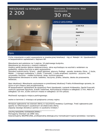 Warszawa, Śródmieście, Aleje Ujazdowskie MIESZKANIE na WYNAJEM 2 200 30 m2 205/2185/OMW 2 200 PLN 30 HighBlock 1970 1 10 1 Opis Ciche mieszkanie w pełni wyposażone w rewelacyjnej lokalizacji - róg ul. Matejki i Al. Ujazdowskich w bezpośrednim sąsiedztwie z Sejmem RP. Mieszkanie jest położone na 1 piętrze, 10 piętrowego budynku. Mieszkanie po remoncie z nowymi meblami. Osobny pokój bardzo dobrze nasłoneczniony, okna wychodzące na wschód z widokiem na podwórko, osobna kuchnia w pełni wyposażona. Standard wykończenia: Ściany – gładź gipsowa, glazura; Podłogi - panele, terakota; Okna – 2 duże, Meble – 1 kanapa rozkładana, 1 stolik, 1 komoda, 1 szafa wnękowa, Łazienka – prysznic, WC, umywalka; Kuchnia – meble kuchenne, okap, kuchnia gazowa. Wyposażenie oferowane w cenie: lodówka, naczynia, pralka, żelazko, deska do prasowania, telewizor, Opis lokalizacji: Mieszkanie usytuowane w prestiżowej lokalizacji Traktu Królewskiego sprawia, że życie w tym miejscu jest przyjemnością. W bezpośrednim sąsiedztwie do dyspozycji Park Ujazdowski, Łazienki Królewskie, Ogród Frascatti, centrum sportowe Agrykola, ścieżki rowerowe. Komunikacja miejska w odległości 2 min, Metro w odległości 10 min, ścisłe centrum miasta w odległości 10 min pieszo. Możliwość wynajęcia miejsca parkingowego. wolne w terminie 1 miesiąca od podpisania umowy najmu _____________________________________________________ Niniejsze ogłoszenie nie stanowi oferty w rozumieniu Kodeksu Cywilnego. Treść ogłoszenia jest oparta na informacjach uzyskanych od właściciela oferty. Zapytaj naszego doradcę o pomoc w uzyskaniu kredytu ! _____________________________________________________ ZAUFAJ NASZEMU DOŚWIADCZENIU ! Pomagamy klientom od 1990 roku. Gwarantujemy BEZPIECZNĄ, profesjonalną obsługę przy transakcjach kupna-sprzedaży i wynajmu. ABRA-Nieruchomości Małgorzata Pakulska tel. 501 111 010 tel. 22 646 50 55 email: [email protected] ABRA-Nieruchomości Powered by TCPDF (www.tcpdf.org)