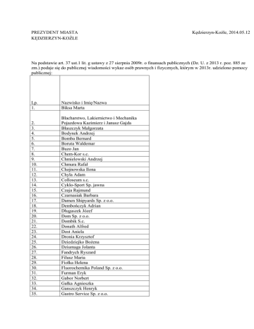 PREZYDENT MIASTA KĘDZIERZYN-KOŹLE Kędzierzyn-Koźle, 2014.05.12 Na podstawie art. 37 ust.1 lit. g ustawy z 27 sierpnia 2009r. o finansach publicznych (Dz. U. z 2013 r. poz. 885 ze zm.) podaje się do publicznej wiadomości wykaz osób prawnych i fizycznych, którym w 2013r. udzielono pomocy publicznej: Lp. 1. Nazwisko i Imię/Nazwa Biksa Marta 2. 3. 4. 5. 6. 7. 8. 9. 10. 11. 12. 13. 14. 15. 16. 17. 18. 19. 20. 21. 22. 23. 24. 25. 26. 27. 28. 29. 30. 31. 32. 33. 34. 35. Blacharstwo, Lakiernictwo i Mechanika Pojazdowa Kazimierz i Janusz Gajda Błaszczyk Małgorzata Bodynek Andrzej Bomba Bernard Boruta Waldemar Buzo Jan Chem-Kor s.c. Chmielewski Andrzej Chmura Rafał Chojnowska Ilona Chyla Adam Colloseum s.c. Cyklo-Sport Sp. jawna Czaja Rajmund Czarnasiak Barbara Damen Shipyards Sp. z o.o. Dembończyk Adrian Długaszek Józef Dom Sp. z o.o. Dombik S.c. Donath Alfred Dost Aniela Dronia Krzysztof Dziedziejko Bożena Dziumaga Jolanta Fandrych Ryszard Filusz Maria Fiołka Helena Fluorochemika Poland Sp. z o.o. Furman Eryk Gabor Norbert Gałka Agnieszka Ganszczyk Henryk Gastro Service Sp. z o.o. 36. 37. 38. 39. 40. 41. 42. 43. 44. 45. 46. 47. 48. 49. 50. 51. 52. 53. 54. 55. 56. 57. 58. 59. 60. 61. 62. 63. 64. 65. 66. 67. 68. 69. 70. 71. 72. 73. 74. 75. 76. 77. 78. 79. 80. 81. 82. 83. 84. 85. 86. 87. Gilewicz Maria Gilga Lidia Glomb Dawid Głogowski Włodzimierz Głuszczuk Ewa Golly Piotr Gruszczyńska Maria Hołoga Agnieszka Huebner Gabriela Idzi Lech Imfitex Jerzy Jarawka Sp. jawna Judyńska Elżbieta Judyński Jan Juraszek Damian Kainka Norbert Kaliński Andrzej Kapica Henryk Kapłan Grażyna Kilarski Dariusz Klama Dorota Klich Joachim Klose Pawel KOFAMA Koźle SA Kolasa Bożena Konig Metall Polska Sp. z o.o. Kopiec Janusz Kościelny Jerzy Kozłowski Michał Krupa Krystyna Krzyżyk Zygfryd Kukiełka Wojciech Kurpiela Damian Kurzaj Jan Kuźnik Marek Liebich Martin Liebich Robert Linek Hubert Łempicki Zbigniew Macha Dawid Macyszyn Michał Malaszko Jolanta Malaszko Marek Małucha Barbara Mende Marcin Moszko Bertold Norek Klaudiusz Nowak Elżbieta Pelzer Joachim Piekarnia Cukiernia Cichoń sp. jawna Piekarnia-Cukiernia Hehlmann s.c. Pilot Erwin Piosek Paweł 88. 89. 90. 91. 92. 93. 94. 95. 96. 97. 98. 99. 100. 101. 102. 103. 104. 105. 106. 107. 108. 109. 110. 111. 112. 113. 114. 115. 116. 117. 118. 119. 120. 121. 122. 123. 124. 125. 126. 127. Podolski Walter Posłuszny Joanna Prokopczuk Janusz Prowent Centrum Zaopatrzenia Matreiałów Budowlanych Sp. jawna Prywatne Biuro Podróży Ottocar Sp. z o.o. Przesdzing Joachim Przybyła Jan Restauracja Pod Słońcem s.c. Rippel Piotr Rolnicza Spółdzielnia Produkcyjna Kędzierzyn Rzeżacz Marian Schmidtko Grażyna Segrodnik Rudolf Seń Jacek Skiba Helena Solga Bernard Stein Rajmund Steyer Roland Struzyna Bernard Struzyna Gerard Studio Fryzjerskie "Grawo" s.c. Suchan Krystyna Swoboda Jan Szafarczyk Piotr Szymaczek Mariusz Świętokrzyska Wojewódzka Komenda Ochotniczych Hufców Pracy Tonderys Józef Walat Henryk Waleczko Krzysztof Warzecha Norbert Warzecha Zygfryd Wąsik Henryk Wencel Krystyna Węgier Andrzej Wieczorek Ewelina Wieczorek Stefan Wołyńska Bożena Wołyński Karol Zalewski Edward Zimon Henryk