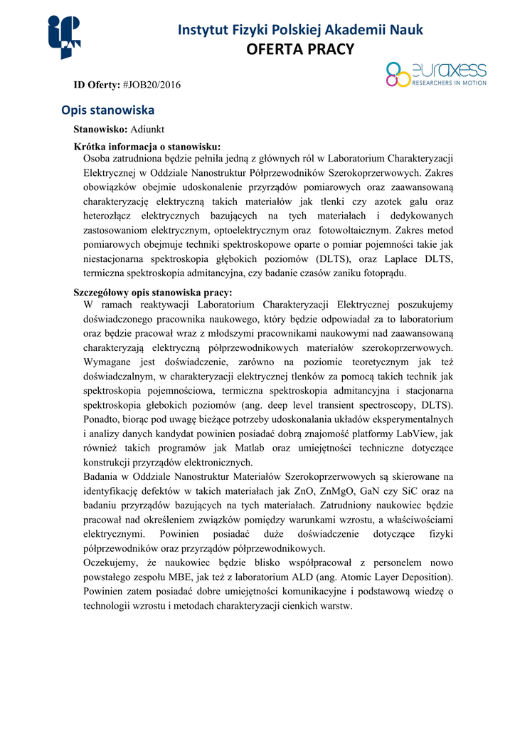 InstytutFizykiPolskiejAkademiiNauk OFERTAPRACY ID Oferty: #JOB20/2016 Opisstanowiska Stanowisko: Adiunkt Krótka informacja o stanowisku: Osoba zatrudniona będzie pełniła jedną z głównych ról w Laboratorium Charakteryzacji Elektrycznej w Oddziale Nanostruktur Półprzewodników Szerokoprzerwowych. Zakres obowiązków obejmie udoskonalenie przyrządów pomiarowych oraz zaawansowaną charakteryzację elektryczną takich materiałów jak tlenki czy azotek galu oraz heterozłącz elektrycznych bazujących na tych materiałach i dedykowanych zastosowaniom elektrycznym, optoelektrycznym oraz fotowoltaicznym. Zakres metod pomiarowych obejmuje techniki spektroskopowe oparte o pomiar pojemności takie jak niestacjonarna spektroskopia głębokich poziomów (DLTS), oraz Laplace DLTS, termiczna spektroskopia admitancyjna, czy badanie czasów zaniku fotoprądu. Szczegółowy opis stanowiska pracy: W ramach reaktywacji Laboratorium Charakteryzacji Elektrycznej poszukujemy doświadczonego pracownika naukowego, który będzie odpowiadał za to laboratorium oraz będzie pracował wraz z młodszymi pracownikami naukowymi nad zaawansowaną charakteryzają elektryczną półprzewodnikowych materiałów szerokoprzerwowych. Wymagane jest doświadczenie, zarówno na poziomie teoretycznym jak też doświadczalnym, w charakteryzacji elektrycznej tlenków za pomocą takich technik jak spektroskopia pojemnościowa, termiczna spektroskopia admitancyjna i stacjonarna spektroskopia głebokich poziomów (ang. deep level transient spectroscopy, DLTS). Ponadto, biorąc pod uwagę bieżące potrzeby udoskonalania układów eksperymentalnych i analizy danych kandydat powinien posiadać dobrą znajomość platformy LabView, jak również takich programów jak Matlab oraz umiejętności techniczne dotyczące konstrukcji przyrządów elektronicznych. Badania w Oddziale Nanostruktur Materiałów Szerokoprzerwowych są skierowane na identyfikację defektów w takich materiałach jak ZnO, ZnMgO, GaN czy SiC oraz na badaniu przyrządów bazujących na tych materiałach. Zatrudniony naukowiec będzie pracował nad określeniem związków pomiędzy warunkami wzrostu, a właściwościami elektrycznymi. Powinien posiadać duże doświadczenie dotyczące fizyki półprzewodników oraz przyrządów półprzewodnikowych. Oczekujemy, że naukowiec będzie blisko współpracował z personelem nowo powstałego zespołu MBE, jak też z laboratorium ALD (ang. Atomic Layer Deposition). Powinien zatem posiadać dobre umiejętności komunikacyjne i podstawową wiedzę o technologii wzrostu i metodach charakteryzacji cienkich warstw. Dyscyplina naukowa: Fizyka Specjalność: Fizyka materii skondensowanej Doświadczenie: Średniozaawansowany lub 4-10 lat (Post-Doc) Profil naukowy wg EURAXESS (szczegóły): Recognised Researcher (R2) Tryb zatrudnienia: Czas określony na dwa lata Wymiar etatu: Pełny etat Wynagrodzenie: W zależności od kwalifikacji. Od 2500 do 3300 PLN miesięcznie (brutto). Kontakt Dodatkowe informacje o stanowisku udziela prof. Elżbieta Guziewicz (e-mail: [email protected]). Składaniedokumentów Termin składania: 4 listopada 2016 r. Zgłoszenia po terminie nie będą rozpatrywane. Wymagane dokumenty: • Curriculum Vitae • Lista publikacji • Listy referencyjne od 2 naukowców znających osiągnięcia kandydata wysłane przez recenzentów bezpośrednio na adres [email protected] Wszystkie materiały należy przesłać w formie elektronicznej na adres: [email protected] podając w temacie ID Oferty.