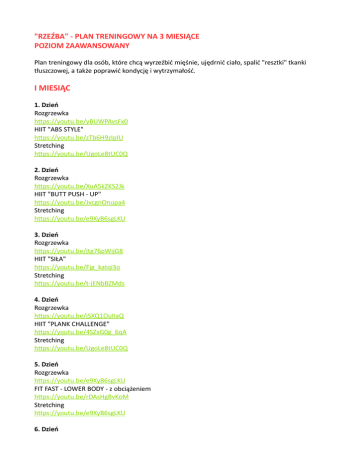 "RZEŹBA" - PLAN TRENINGOWY NA 3 MIESIĄCE POZIOM ZAAWANSOWANY Plan treningowy dla osób, które chcą wyrzeźbić mięśnie, ujędrnić ciało, spalić "resztki" tkanki tłuszczowej, a także poprawić kondycję i wytrzymałość. I MIESIĄC 1. Dzień Rozgrzewka https://youtu.be/yBUWPAvsFx0 HIIT "ABS STYLE" https://youtu.be/zTb6H9zIpIU Stretching https://youtu.be/UgoLe8tUC0Q 2. Dzień Rozgrzewka https://youtu.be/XuA5kZKS2Jk HIIT "BUTT PUSH - UP" https://youtu.be/JvcgnOnupa4 Stretching https://youtu.be/e9XyB6sgLKU 3. Dzień Rozgrzewka https://youtu.be/jtg76pWijG8 HIIT "SIŁA" https://youtu.be/Fjg_katqi3o Stretching https://youtu.be/t-jENbBZMds 4. Dzień Rozgrzewka https://youtu.be/jSXQ1OuIIaQ HIIT "PLANK CHALLENGE" https://youtu.be/4SZxG0g_6qA Stretching https://youtu.be/UgoLe8tUC0Q 5. Dzień Rozgrzewka https://youtu.be/e9XyB6sgLKU FIT FAST - LOWER BODY - z obciążeniem https://youtu.be/rDAsHgBvKoM Stretching https://youtu.be/e9XyB6sgLKU 6. Dzień PROGRAM "10 STEPS" https://youtu.be/IzmjqvXDHoM Stretching https://youtu.be/t-jENbBZMds 7. Dzień WOLNE II MIESIĄC 1. Dzień HIIT "BTTP" https://youtu.be/7heQU63_H8k 2. Dzień Rozgrzewka https://youtu.be/XuA5kZKS2Jk PROGRAM "PERFECT BUTT" https://youtu.be/Pvf4zxY9WCU PROGRAM "T - ARMS" - z hantlami, taśmą lub butelkami z wodą https://youtu.be/p7ImcQCgJt4 Stretching https://youtu.be/t-jENbBZMds 3. Dzień Rozgrzewka https://youtu.be/e9XyB6sgLKU HIIT "DEAD OR ALIVE" https://youtu.be/dCatIjblyLA Stretching https://youtu.be/e9XyB6sgLKU 4. Dzień Rozgrzewka https://youtu.be/yBUWPAvsFx0 HIIT "ABS ON FIRE" https://youtu.be/YdydWKiaXE0 Stretching https://youtu.be/UgoLe8tUC0Q 5. Dzień Rozgrzewka https://youtu.be/mxKr-ub5ijQ WEWNĘTRZNA STRONA UD https://youtu.be/4SZxG0g_6qA PROGRAM "T - ARMS" - z hantlami, taśmą lub butelkami z wodą https://youtu.be/p7ImcQCgJt4 Stretching https://youtu.be/t-jENbBZMds 6. Dzień Rozgrzewka https://youtu.be/jtg76pWijG8 HIIT "3P" https://youtu.be/Y7waSM_lHMc Stretching https://youtu.be/e9XyB6sgLKU 7. Dzień WOLNE III MIESIĄC 1. Dzień PROGRAM "FAST NAD FURIOUS" https://youtu.be/4whelVgUR7A Stretching https://youtu.be/UgoLe8tUC0Q 2. Dzień Rozgrzewka https://youtu.be/szMH-uD2-aQ HIIT "BAND WORK" https://youtu.be/jZl_tOeP71k Stretching https://youtu.be/t-jENbBZMds 3. Dzień Rozgrzewka https://youtu.be/jtg76pWijG8 HIIT "PUSH UP CHALLENGE" https://youtu.be/81kl-oL43nk HIIT "ANIMALS" https://youtu.be/INMv7ESJomE Stretching https://youtu.be/t-jENbBZMds 4. Dzień Rozgrzewka https://youtu.be/XuA5kZKS2Jk HIIT "DEAD OR ALIFE" https://youtu.be/dCatIjblyLA Stretching https://youtu.be/e9XyB6sgLKU 5. Dzień Rozgrzewka https://youtu.be/jSXQ1OuIIaQ HIIT "PLANK CHALLENGE" https://youtu.be/4SZxG0g_6qA Stretching https://youtu.be/UgoLe8tUC0Q 6. Dzień Rozgrzewka https://youtu.be/mxKr-ub5ijQ PROGRAM "PERFECT BUTT" https://youtu.be/Pvf4zxY9WCU PROGRAM "T - ARMS" - z hantlami, taśmą lub butelkami z wodą https://youtu.be/p7ImcQCgJt4 Stretching https://youtu.be/t-jENbBZMds 7. Dzień WOLNE Przeczytaj koniecznie: 10 TRENINGOWYCH ZASAD DLA DOBREGO SAMOPOCZUCIA: - Trenuj w butach sportowych - Nie dokładaj nic do planu, jest on kompletny - Zawsze ćwicz swoim tempem, nie moim - Najważniejsza podczas treningu jest technika, to dzięki niej nie ulegniesz kontuzji i osiągniesz upragnione efekty - Programy nie są łatwe i takie mają być. To trudne zestawy dla osób o poziomie zaawansowanym. NIE MUSISZ ich zrobić w 100%, ale masz dać z siebie 100%. Wykonanie połowy treningu to już ogromny sukces - Dieta stanowi 70% sukcesu - Do treningu przystąp po konsultacji ze swoim lekarzem - Jeśli źle się czujesz przerwij trening - Nie narażaj się na maksymalne zmęczenie, odpoczynek też jest elementem treningu - Dla kobiet: w trakcie cyklu menstruacyjnego wysiłek nie jest wskazany, unikaj też ćwiczeń na mięśnie brzucha i okolicę miednicy MIŁEGO TRENINGU!