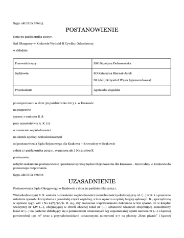 Sygn. akt II Ca 676/13 POSTANOWIENIE Dnia 30 października 2013 r. Sąd Okręgowy w Krakowie Wydział II Cywilny Odwoławczy w składzie: Przewodniczący: SSO Krystyna Dobrowolska Sędziowie: SO Katarzyna Biernat-Jarek SR (del.) Krzysztof Wąsik (sprawozdawca) Protokolant: Agnieszka Zapalska po rozpoznaniu w dniu 30 października 2013 r. w Krakowie na rozprawie sprawy z wniosku B. S. przy uczestnictwie A. K. (1) o zniesienie współwłasności na skutek apelacji wnioskodawczyni od postanowienia Sądu Rejonowego dla Krakowa – Krowodrzy w Krakowie z dnia 17 października 2012 r., sygnatura akt I Ns 211/09/K postanawia: uchylić zaskarżone postanowienie i przekazać sprawę Sądowi Rejonowemu dla Krakowa – Krowodrzy w Krakowie do ponownego rozpoznania. Sygn. akt II Ca 676/13 UZASADNIENIE Postanowienia Sądu Okręgowego w Krakowie z dnia 30 października 2013 r. Wnioskodawczyni B. S. wniosła o zniesienie współwłasności nieruchomości położonej przy ul. (...) w K. i o ponowne ustalenie sposobu korzystania z pozostałej części wspólnej, a to w oparciu o opinię biegłej sądowej I. K., sporządzoną w sprawie sygn. akt I Ns 2473/96/K. D. się, aby zniesienia współwłasności dokonano w ten sposób, że w księdze wieczystej nr KW (...), obejmującej w chwili obecnej lokal nr (...) ustanowić własność obejmującą samodzielny lokal nr (...) na parterze składający się z pomieszczeń oznaczonych wg wspomnianej opinii numerami (...) o łącznej powierzchni 130 m2 wraz z przynależnościami oznaczonymi numerami 2-7 na planszy „Rzut piwnic” i łącznej powierzchni 64,40 m2, co da łączną powierzchnię 194,50 m2 ; w księdze wieczystej nr KW (...) obejmującej w chwili obecnej lokal nr (...) ustanowić własność obejmującą samodzielny lokal nr (...) składający się z pomieszczeń oznaczonych w powołanej opinii numerami (...), o łącznej powierzchni 118,03 m2, tarasu o powierzchni 19,28 m2 i przynależności oznaczonej nr 1 na planszy „Rzut piwnic” oraz g-1 na planszy „Projekt odrębnego użytkowania” o łącznej powierzchni 48,37 m2, co da łączną powierzchnię 166,40 m2 wraz z tarasem o pow. 19,28 m2 ; w księdze wieczystej nr KW (...) w dziale I-O, Rubryka 1.4, Podrubryka 1.4.2. pole 15 wpisać części wspólne po zniesieniu współwłasności obejmujące pomieszczenia komunikacji oznakowane numerami 8-11 na planszy „Rzut piwnic” o łącznej powierzchni 14,11 m2 numerem 14 na planszy „Rzut parteru” o powierzchni 10,13 m2 oraz numerami 9-10 na planszy „Rzut poddasza” o łącznej powierzchni 6,77 m2, co da łączną powierzchnię pomieszczeń komunikacji 31,01 m2. Ustalenie sposobu korzystania z rzeczy wspólnej objętej księgą wieczystą nr KW (...) miałoby nastąpić w ten sposób, że do odrębnego korzystania poza budynkiem dla wnioskodawczyni wydzielone by zostały części oznaczone literami C oraz I (oznaczone kolorem czerwonym) o łącznej powierzchni 26,70 m2, a dla uczestnika części oznaczone literami B oraz g-2 (oznaczone kolorem niebieskim) o łącznej powierzchni 22,70 m2, pozostawiając we wspólnym użytkowaniu wewnątrz budynku powierzchnie komunikacyjne wymienione w Dziale I-O, Rubryka 1.4, Podrubryka 1.4.2., pole 15 księgi wieczystej nr KW (...), a poza budynkiem część oznaczoną literą J o powierzchni 77 m2. Wnioskodawczyni domagała się również zwrotu 7/15 części pożytków wynikających z wynajmu przez uczestnika części wspólnych nieruchomości tj. dwóch lokali użytkowych i garażu w wysokości 160 000 zł, podnosząc, iż kwota ta zawiera również zwrot 8/15 kosztów przeprowadzonego przez wnioskodawczynię remontu dachu oraz stosowne odsetki i waloryzację, a także domagała się zasądzenia od uczestnika na jej rzecz rekompensaty z tytułu znaczących różnic w standardzie nowo utworzonych samodzielnych lokali nr (...) w wysokości 200 000 zł i nakazania jej przeprowadzenia odpowiednich prac adaptacyjno-budowlanych dla osiągnięcia wskazanego celu. Ponadto, wnioskodawczyni wniosła o pozostawienie zarządu dwuosobowego złożonego ze współwłaścicieli przedmiotowej nieruchomości, z tym że na okres 5 lat od uprawomocnienia się postanowienia wyznaczonym zarządcą byłby pełnomocnik wnioskodawczyni M. S. oraz o zasądzenie od uczestnika na rzecz wnioskodawczyni kosztów postępowania. W uzasadnieniu wniosku wnioskodawczyni twierdziła, iż powyższy wniosek jest spowodowany niezadowoleniem wnioskodawczyni z treści prawomocnego postanowienia Sądu Rejonowego dla Krakowa- Krowodrzy w Krakowie z dnia 24 marca 2005 r., sygn. akt I Ns 2473/96/K oraz występującymi na tym tle konfliktami między wnioskodawczynią, a uczestnikiem. Uczestnik A. K. (2) wniósł o oddalenie wniosku oraz o wydanie mu przez wnioskodawczynię pomieszczenia nr 5 (wg oznaczeń biegłego H.) na parterze nieruchomości przy ul. (...) w K., które utracił na podstawie postanowienia Sądu Rejonowego dla Krakowa-Krowodrzy w Krakowie z dnia 24 marca 2005 r., sygn. akt I Ns 2473/96/K oraz że opiera swoje żądanie na prawie własności. Postanowieniem z dnia 17 października 2012 r. Sąd Rejonowy dla Krakowa-Krowodrzy w Krakowie oddalił wniosek wnioskodawczyni (pkt I), oddalił wniosek uczestnika o wydanie nieruchomości (pkt II), stwierdził, że wnioskodawczyni ponosi koszty postępowania (pkt III) oraz nakazał ściągnąć od wnioskodawczyni na rzecz Skarbu Państwa- Sądu Rejonowego dla Krakowa-Krowodrzy w Krakowie kwotę 3 561,96 zł tytułem zwrotu kosztów wynagrodzenia biegłego sądowego (pkt IV). Sąd Rejonowy oparł swoje rozstrzygnięcie na następująco ustalonym stanie faktycznym: Uczestnik A. K. (1) jest właścicielem stanowiącego odrębną nieruchomość lokalu nr (...) położonego w budynku przy ul. (...) w K., z własnością którego związana jest współwłasność 8/15 części nieruchomości objętej (...).d. KW (...) K. – B.. Wnioskodawczyni B. S. jest właścicielem stanowiącego odrębną n