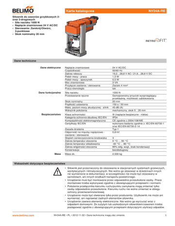 Karta katalogowa NV24A-RE Siłownik do zaworów grzybkowych 2oraz 3-drogowych • Siła nacisku 1000 N • Napięcie znamionowe 24 V AC/DC • Sterowanie: Zamknij/Otwórz, 3-punktowe • Skok nominalny 20 mm Dane techniczne Dane elektryczne Dane funkcjonalne Napięcie znamionowe Częstotliwość Zakres roboczy Pobór mocy - praca Pobór mocy - spoczynek Moc znamionowa Przyłącze zasilania / sterowania Praca równoległa 24 V AC/DC 50/60 Hz 19,2…28,8 V AC / 21,6…28,8 V DC 1,5 W 0,5 W 3 VA Zaciski 4 mm² tak Siła nacisku Przestawianie ręczne 1000 N Samopowrotny przycisk wysprzęglający przekładnię, możliwość zablokowania 20 mm 150 s / 20 mm 45 dB (A) mechaniczny, skok 5…20 mm Skok nominalny Prędkość ustawiania Maks. poziom mocy akustycznej - silnik Wskaźnik położenia Bezpieczeństwo Klasa ochronności Kategoria ochronna obudowy IEC/EN Kompatybilność elektromagnetyczna Certyfikaty IEC/EN Zasada działania Odporność na impulsy napięciowe zasilanie / sterowanie Stopień zanieczyszczenia środowiska Zakres temperatur otoczenia Zakres temperatur składowania Zakres wilgotności otoczenia Konserwacja Masa Masa ok. III (napięcie bezpieczne - niskie) IP54 CE zgodnie z 2004/108/WE wykonano badania zgodnie z: IEC/EN 60730-1 oraz IEC/EN 60730-2-14 Typ 1 0,8 kV 3 0 °C ... 50 °C -40 °C ... 80 °C 95% wilg. wzgl., brak kondensacji bezobsługowy 2,530 kg Wskazówki dotyczące bezpieczeństwa ! www.belimo.com • Siłownik jest przeznaczony do stosowania w stacjonarnych systemach grzewczych, wentylacyjnych i klimatyzacyjnych. Nie wolno go stosować w dziedzinach innych niż wymienione w dokumentacji, w szczególności nie może być stosowany w samolotach, ani innych środkach transportu powietrznego. • Urządzenie musi być montowane przez odpowiednio przeszkolone osoby. Prace montażowe trzeba wykonywać zgodnie z obowiązującymi przepisami i normami. • Położenie przełącznika kierunku ruchu/punktu zamykania mogą zmieniać tylko osoby odpowiednio przeszkolone. Kierunku ruchu nie wolno zmieniać w obiegu ochrony przeciwzamrożeniowej. • Urządzenie może być otwierane tylko przez producenta. Użytkownik nie może ani wymieniać, ani naprawiać żadnych elementów siłownika. • Urządzenie zawiera elementy elektroniczne. Nie wolno go wyrzucać wraz z odpadami domowymi. Ze zużytym lub uszkodzonym siłownikiem/zaworem trzeba postępować zgodnie z obowiązującymi przepisami dotyczącymi utylizacji odpadów. NV24A-RE • PL • 2012-11-02 • Dane techniczne mogą ulec zmianie. 1 Siłownik do zaworów grzybkowych, Zamknij/Otwórz, 3-punktowy, 24 V AC/DC, 1000 N NV24A-RE Cechy charakterystyczne wyrobu Montaż na zaworach innych producentów Siłownik do modernizacji jest przeznaczony do montażu na zaworach różnorodnych typów, pochodzących od różnych producentów. W skład zestawu wchodzi siłownik, konsola, uniwersalny adapter szyjki zaworu oraz uniwersalny adapter popychacza zaworu. Najpierw trzeba dostosować szyjkę oraz popychacz zaworu, po czym na adapterze szyjki zaworu zamocować konsolę. Następnie wprowadzić siłownik do konsoli i połączyć go z zaworem. Siłownik zamocować na konsoli przy użyciu śrub, uwzględniając położenie punktu zamykania zaworu, po czym można przeprowadzić rozruch. Adapter szyjki zaworu/siłownik można obracać na szyjce zaworu o 360°, o ile pozwala na to wielkość zaworu. Montaż na zaworach Belimo Na zaworach grzybkowych Belimo należy montować standardowe siłowniki Belimo. Montowanie siłowników do modernizacji na zaworach grzybkowych Belimo jest technicznie możliwe. Możliwość przestawiania ręcznego po naciśnięciu przycisku - tymczasowe lub trwałe wysprzęglenie przekładni. Przekładnia pozostaje wysprzęglona, dopóki przycisk jest wciśnięty. Skok można regulować kluczem sześciokątnym (4 mm), który wkłada się do gniazda w górnej części siłownika. Gdy klucz jest obracany w prawo, wrzeciono siłownika wysuwa się z obudowy siłownika. Przestawianie ręczne Wysoka niezawodność działania Siłownik jest odporny na przeciążenia, nie wymaga wyłączników krańcowych. Siłownik automatycznie zatrzymuje się po osiągnięciu pozycji krańcowej. Wskaźnik położenia Na konsoli znajduje się mechaniczny wskaźnik położenia. Zakres skoku jest ustawiany automatycznie podczas pracy. Przełącznik kierunku ruchu Kierunek ruchu można zmieniać przełącznikiem. Akcesoria Akcesoria elektryczne 2 Opis Typ Styk pomocniczy S2A-H NV24A-RE • PL • 2012-11-02 • Dane techniczne mogą ulec zmianie. www.belimo.com Siłownik do zaworów grzybkowych, Zamknij/Otwórz, 3-punktowy, 24 V AC/DC, 1000 N NV24A-RE Montaż elektryczny • Podłączać poprzez transformator bezpieczeństwa. • Jest możliwe równoległe podłączenie kilku siłowników. • Ustawienie fabryczne przełącznika kierunku ruchu: wrzeciono siłownika jest wsunięte Wskazówki ! Schematy połączeń 24 V AC/DC, Zamknij/Otwórz T ~ + ~ T – 24 V AC/DC, 3-punktowy + – 0 1 2 1 3 2 3 a a a a a a a b b b b b b b Kontrolki i elementy obsługowe (1) Przełącznik kierunku ruchu Przełączenie: zmiana kierunku ruchu (4) Przycisk wysprzęglający przekładnię Naciśnięcie przycisku: przekładnia wysprzęglona, silnik wyłączony, możliwe przestawianie ręczne Przycisk zwolniony: przekładania załączona, normalna praca 10 (10) Przestawianie ręczne Obrót w prawo: wrzeciono siłownika wysuwa się. Obrót w lewo: wrzeciono siłownika wsuwa się. 1 4 www.belimo.com NV24A-RE • PL • 2012-11-02 • Dane techniczne mogą ulec zmianie. 3 NV24A-RE Siłownik do zaworów grzybkowych, Zamknij/Otwórz, 3-punktowy, 24 V AC/DC, 1000 N Wymiary [mm] Rysunki wymiarowe 113 193 113 190 200 290 45 Dodatkowa dokumentacja • Instrukcje montażu siłowników BELIMO Siłowniki S.A. ul. Zagadki 21 02-227 Warszawa tel. 22 886 53 05 fax 22 886 53 08 [email protected] www.belimo.pl 4 NV24A-RE • PL • 2012-11-02 • Dane techniczne mogą ulec zmiani