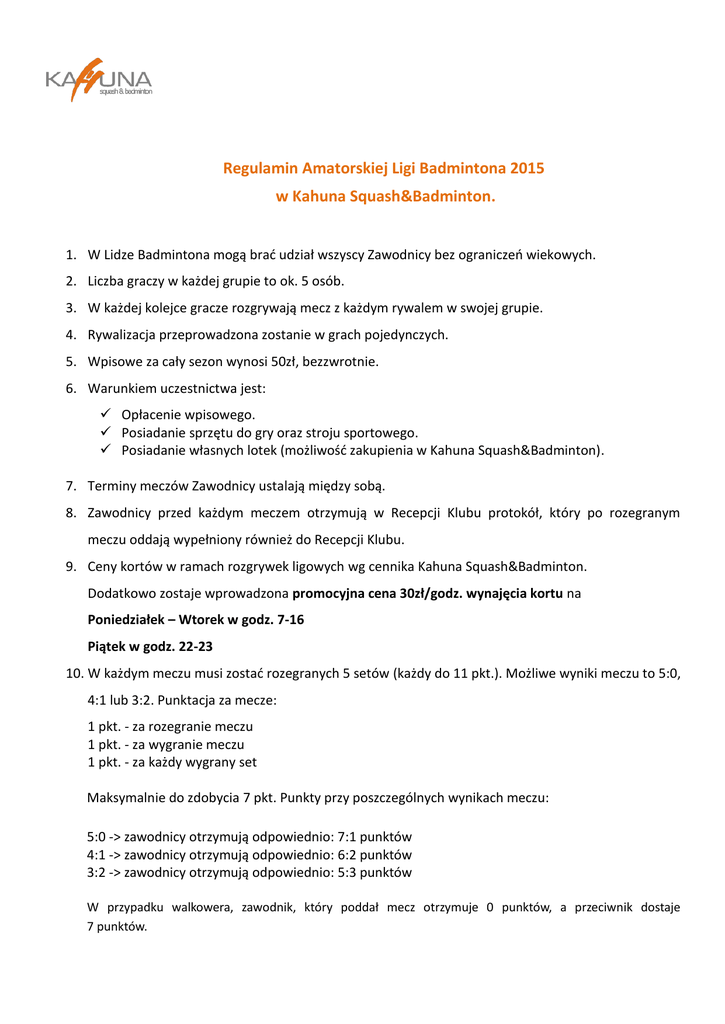 Regulamin Amatorskiej Ligi Badmintona 2015 w Kahuna