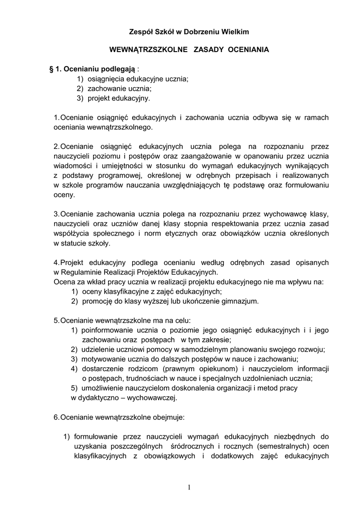 Zespół Szkół w Dobrzeniu Wielkim WEWNĄTRZSZKOLNE ZASADY OCENIANIA § 1. Ocenianiu podlegają : 1) osiągnięcia edukacyjne ucznia; 2) zachowanie ucznia; 3) projekt edukacyjny. 1. Ocenianie osiągnięć edukacyjnych i zachowania ucznia odbywa się w ramach oceniania wewnątrzszkolnego. 2. Ocenianie osiągnięć edukacyjnych ucznia polega na rozpoznaniu przez nauczycieli poziomu i postępów oraz zaangażowanie w opanowaniu przez ucznia wiadomości i umiejętności w stosunku do wymagań edukacyjnych wynikających z podstawy programowej, określonej w odrębnych przepisach i realizowanych w szkole programów nauczania uwzględniających tę podstawę oraz formułowaniu oceny. 3. Ocenianie zachowania ucznia polega na rozpoznaniu przez wychowawcę klasy, nauczycieli oraz uczniów danej klasy stopnia respektowania przez ucznia zasad współżycia społecznego i norm etycznych oraz obowiązków ucznia określonych w statucie szkoły. 4. Projekt edukacyjny podlega ocenianiu według odrębnych zasad opisanych w Regulaminie Realizacji Projektów Edukacyjnych. Ocena za wkład pracy ucznia w realizacji projektu edukacyjnego nie ma wpływu na: 1) oceny klasyfikacyjne z zajęć edukacyjnych; 2) promocję do klasy wyższej lub ukończenie gimnazjum. 5. Ocenianie wewnątrzszkolne ma na celu: 1) poinformowanie ucznia o poziomie jego osiągnięć edukacyjnych i i jego zachowaniu oraz postępach w tym zakresie; 2) udzielenie uczniowi pomocy w samodzielnym planowaniu swojego rozwoju; 3) motywowanie ucznia do dalszych postępów w nauce i zachowaniu; 4) dostarczenie rodzicom (prawnym opiekunom) i nauczycielom informacji o postępach, trudnościach w nauce i specjalnych uzdolnieniach ucznia; 5) umożliwienie nauczycielom doskonalenia organizacji i metod pracy w dydaktyczno – wychowawczej. 6. Ocenianie wewnątrzszkolne obejmuje: 1) formułowanie przez nauczycieli wymagań edukacyjnych niezbędnych do uzyskania poszczególnych śródrocznych i rocznych (semestralnych) ocen klasyfikacyjnych z obowiązkowych i dodatkowych zajęć edukacyjnych 1 2) 3) 4) 5) 6) 7) 8) z uwzględnieniem zindywidualizowanych wymagań wobec uczniów, którzy posiadają opinie z PPP lub orzeczenia lekarskie. ocenianie bieżące i ustalanie śródrocznych ocen klasyfikacyjnych z obowiązkowych oraz dodatkowych zajęć edukacyjnych oraz śródrocznej oceny klasyfikacyjnej zachowania, według skali i w formach przyjętych w WZO; ustalanie rocznych ( semestralnych ) ocen klasyfikacyjnych z obowiązkowych i dodatkowych zajęć edukacyjnych oraz rocznej oceny klasyfikacyjnej zachowania, według skali , o której mowa w §5 i §9 . przeprowadzanie egzaminów klasyfikacyjnych, poprawkowych i wyrównujących różnice programowe; ustalenie warunków i trybu uzyskania wyższej niż przewidywane rocznych ocen klasyfikacyjnych z obowiązkowych zajęć edukacyjnych oraz rocznej oceny klasyfikacyjnej zachowania; ustalanie sposobu i kryteriów oceny projektu edukacyjnego; ustalanie kryteriów oceniania zachowania; ustalanie warunków i sposobu przekazywania rodzicom (prawnym opiekunom) informacji o postępach i trudnościach ucznia w nauce; 7. Ocena jest informacją, w jakim stopniu uczeń spełnił wymagania programowe postawione przez nauczyciela, nie jest karą ani nagrodą. § 2. W ocenianiu obowiązują zasady: 1) Zasada częstotliwości i rytmiczności – uczeń oceniany jest na bieżąco i rytmicznie. Ocena semestralna /końcowo roczna nie jest średnią arytmetyczną ocen cząstkowych. Dopuszcza się możliwość stosowana przez nauczycieli poszczególnych przedmiotów średniej ważonej uwzględnionej w PZO. 2) Zasada jawności kryteriów – uczeń i jego rodzice (prawni opiekunowie) znają kryteria oceniania, zakres materiału z każdego przedmiotu oraz formy pracy podlegające ocenie; 3) Zasada różnorodności wynikająca ze specyfiki każdego przedmiotu; 4) Zasada różnicowania wymagań – zadania stawiane uczniom powinny mieć zróżnicowany poziom trudności i dawać możliwość uzyskania wszystkich ocen. 5) Zasada otwartości – wewnątrzszkolne ocenianie podlega weryfikacji i modyfikacji w oparciu o okresową ewaluację; § 3. Jawność oceny. 1. Nauczyciel we wrześniu danego roku szkolnego przedstawia uczniom opracowany przez siebie (wybrany) program nauczania w danej klasie uwzględniający profil i specyfikę zespołu. Fakt przekazania informacji nauczyciel dokumentuje odpowiednim zapisem w dzienniku lekcyjnym. 2 2. Nauczyciele na początku roku szkolnego informują uczniów i rodziców (prawnych opiekunów) o: 1) wymaganiach edukacyjnych niezbędnych do uzyskania poszczególnych śródrocznych i rocznych ocen klasyfikacyjnych z obowiązkowych i dodatkowych zajęć edukacyjnych, wynikających z realizowanego programu nauczania; 2) sposobach sprawdzania osiągnięć edukacyjnych uczniów; 3) warunkach i trybie uzyskania wyższej niż przewidywana rocznej oceny klasyfikacyjnej z obowiązkowych i dodatkowych zajęć edukacyjnych; 4) skutkach ustalenia uczniowi nagannej rocznej oceny klasyfikacyjnej zachowania; 5) warunkach, sposobach oraz kryteriach oceny projektu edukacyjnego. 3.Oceny są jawne zarówno dla ucznia, jak i jego rodziców (prawnych opiekunów). § 4. T r y b o c e n i a n i a i s k a l a o c e n . 1. Oceny bieżące odnotowuje się w Dzienniku Lekcyjnym Klasy. Oceny klasyfikacyjne w rubrykach przeznaczonych na ich wpis, a także w arkuszach ocen i protokołach egzaminów poprawkowych i klasyfikacyjnych – słownie, w pełnym brzmieniu. 2. Oceny bieżące, klasyfikacyjne śródroczne i końcowo roczne ustala się według następującej skali, z następującymi skrótami literowymi: 1) stopień celujący 6 - cel; 2) stopień bardzo dobry 5 - bdb; 3) stopień dobry 4 - db; 4) stopień dostateczny 3 - dst; 5) stopień dopuszczający 2 - dop; 6) stopień niedostateczny - 1 - ndst. 3. Dopuszcza się dodatkowo stosowanie znaków procentów w bieżącym ocenianiu. „ + „ „ – „; punktów oraz 4. Ilość 