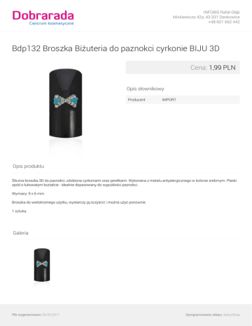 INFOBIS Rafał Głąb Mickiewicza 42a, 43-331 Dankowice +48 601 662 442 Bdp132 Broszka Biżuteria do paznokci cyrkonie BIJU 3D Cena: 1,99 PLN Opis słownikowy Producent IMPORT Opis produktu Śliczna broszka 3D do paznokci, zdobiona cyrkoniami oraz perełkami. Wykonana z metalu antyalergicznego w kolorze srebrnym. Płaski spód o łukowatym kształcie - idealnie dopasowany do wypukłości paznokci. Wymiary: 9 x 6 mm. Broszka do wielokrotnego użytku, wystarczy ją oczyścić i można użyć ponownie. 1 sztuka. Galeria Plik wygenerowano: 03-03-2017 Oprogramowanie sklepu: AptusShop INFOBIS Rafał Głąb Mickiewicza 42a, 43-331 Dankowice +48 601 662 442 Plik wygenerowano: 03-03-2017 Powered by TCPDF (www.tcpdf.org) Oprogramowanie sklepu: AptusShop