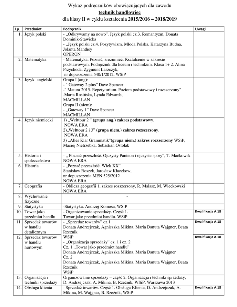 Wykaz podręczników obowiązujących dla zawodu technik handlowiec dla klasy II w cyklu kształcenia 2015/2016 – 2018/2019 Lp. Przedmiot 1. Język polski 2. Matematyka 3. Język angielski 4. Język niemiecki 5. Historia i społeczeństwo 6. Historia 7. Geografia 8. Wychowanie fizyczne 9. Statystyka 10. Towar jako przedmiot handlu 11. Sprzedaż towarów w handlu detalicznym 12. Sprzedaż towarów w handlu hurtowym 13. Organizacja i techniki sprzedaży 14. Obsługa klienta Podręcznik Uwagi - ,,Odkrywamy na nowo”. Język polski cz.3. Romantyzm, Donata Dominik-Stawicka - ,,Język polski cz.4. Pozytywizm. Młoda Polska, Katarzyna Budna, Jolanta Manthey OPERON - Matematyka. Poznać, zrozumieć. Kształcenie w zakresie podstawowym. Podręcznik dla liceum i technikum. Klasa 1+ 2. Alina Przychoda, Zygmunt Łaszczyk, nr dopuszczenia 540/1/2012. WSiP Grupa I (ang): - " Gateway 2 plus” Dave Spencer -" Matura 2015. Repetytorium. Poziom podstawowy i rozszerzony" .Marta Rosińska, Lynda Edwards, MACMILLAN Grupa II (niem): - ,,Gateway 1” Dave Spencer MACMILLAN 1) „Welttour 2 ” (grupa ang.) zakres podstawowy. NOWA ERA 2)„Welttour 2 i 3” (grupa niem.) zakres rozszerzony. NOWA ERA 3) „Alles Klar Grammatik”(grupa niem.) zakres rozszerzony WSiP, Maciej Nietrzebka, Sebastian Ostolak - ,, Poznać przeszłość. Ojczysty Panteon i ojczyste spory”, T. Maćkowsk NOWA ERA - „Poznać przeszłość. Wiek XX” Stanisław Roszek, Jarosław Kłaczkow, nr dopuszczenia MEN 525/2012 NOWA ERA - Oblicza geografii 1, zakres rozszerzony, R. Malasz, M. Wieckowski NOWA ERA -Statystyka. Andrzej Komosa, WSiP - Organizowanie sprzedaży. Część 1. Towar jako przedmiot handlu. WSiP - ,,Sprzedaż towarów” cz.1 Donata Andrzejczak, Agnieszka Mikina, Maria Danuta Wajgner, Beata Rzeźnik WSiP - ,,Organizacja sprzedaży” cz. 1 i cz. 2 Cz. 1 ,,Towar jako przedmiot handlu” Donata Andrzejczak, Agnieszka Mikina, Maria Danuta Wajgner Cz. 2 Donata Andrzejczak, Agnieszka Mikina, Maria Danuta Wajgner, Beata Rzeźnik WSiP Organizowanie sprzedaży – część 2. Organizacja i techniki sprzedaży, D. Andrzejczak, A. Mikina, B. Rzeźnik, WSiP, Warszawa 2013 - Sprzedaż towarów. Część 1. Obsługa Klienta, D. Andrzejczak, A. Mikina, M. Wajgnar, B. Rzeźnik, WSiP Kwalifikacja A.18 Kwalifikacja A.18 Kwalifikacja A.18 Kwalifikacja A.18