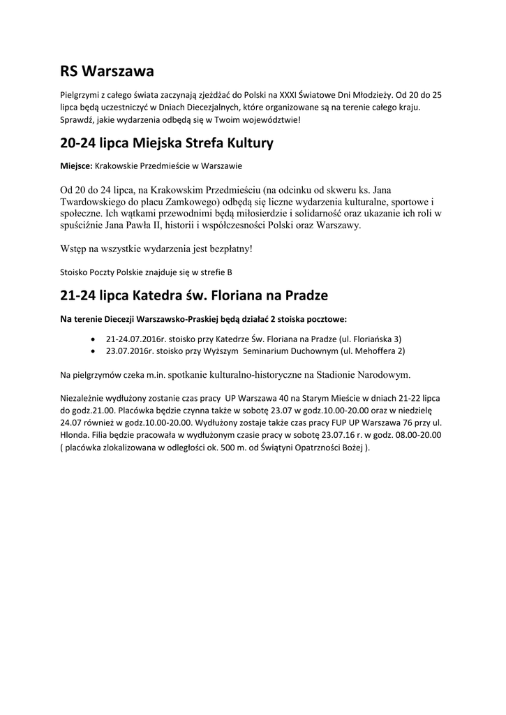 RS Warszawa Pielgrzymi z całego świata zaczynają zjeżdżać do Polski na XXXI Światowe Dni Młodzieży. Od 20 do 25 lipca będą uczestniczyć w Dniach Diecezjalnych, które organizowane są na terenie całego kraju. Sprawdź, jakie wydarzenia odbędą się w Twoim województwie! 20-24 lipca Miejska Strefa Kultury Miejsce: Krakowskie Przedmieście w Warszawie Od 20 do 24 lipca, na Krakowskim Przedmieściu (na odcinku od skweru ks. Jana Twardowskiego do placu Zamkowego) odbędą się liczne wydarzenia kulturalne, sportowe i społeczne. Ich wątkami przewodnimi będą miłosierdzie i solidarność oraz ukazanie ich roli w spuściźnie Jana Pawła II, historii i współczesności Polski oraz Warszawy. Wstęp na wszystkie wydarzenia jest bezpłatny! Stoisko Poczty Polskie znajduje się w strefie B 21-24 lipca Katedra św. Floriana na Pradze Na terenie Diecezji Warszawsko-Praskiej będą działać 2 stoiska pocztowe: 21-24.07.2016r. stoisko przy Katedrze Św. Floriana na Pradze (ul. Floriańska 3) 23.07.2016r. stoisko przy Wyższym Seminarium Duchownym (ul. Mehoffera 2) Na pielgrzymów czeka m.in. spotkanie kulturalno-historyczne na Stadionie Narodowym. Niezależnie wydłużony zostanie czas pracy UP Warszawa 40 na Starym Mieście w dniach 21-22 lipca do godz.21.00. Placówka będzie czynna także w sobotę 23.07 w godz.10.00-20.00 oraz w niedzielę 24.07 również w godz.10.00-20.00. Wydłużony zostaje także czas pracy FUP UP Warszawa 76 przy ul. Hlonda. Filia będzie pracowała w wydłużonym czasie pracy w sobotę 23.07.16 r. w godz. 08.00-20.00 ( placówka zlokalizowana w odległości ok. 500 m. od Świątyni Opatrzności Bożej ).