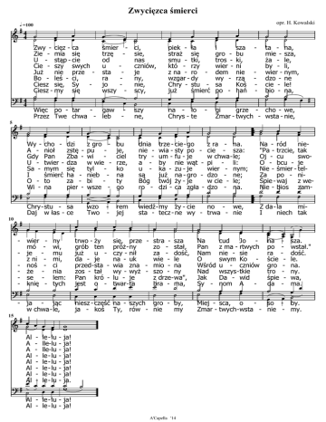 Zwycięzca śmierci dG =100 a 44 jj kk kk kk Zwy - cięz - ca Zie - mia się U - stąp - cie Cie - szy swych Już nie prze Bo - leś - ci, Ciesz się, Sy Ciesz - my się d 4 jj b 4 5 k a jj Wy A Gdy U Sa I O Wi - d jj b d kk kk cho nioł Pan twier mym śmierć to na dzi zstę Zba dza się ha za pier - z gro pu wi w wie tyl nieb bi wsze wzo Two kk - Chry - stu - sa Daj w łas - ce wier mó je z ni noś że se knię d jj b - kk jk k kk - ny wi, mu mi, ci nia lem: tych jj ja - jąc w chwa - le, dk k a j kk kk ii k k trwo - ży grób ten już u da - je przed - sta zos - tał Pan kró jest o - k k kk na - ło Chrys - te gi grze - cho - we, Zmar - twych - wsta - nie, - le - lu lle-lu lle-lu le - lu le - lu le - lu le - lu le - lu - ja! ja! ja! ja! ja! ja! ja! ja. k d j k kk kk ji b - k kk kk rem jej wiedź - my ży - cie no - we, sta - tecz - ne wy - trwa - nie j kk kk kk jj j j j j niesz - część na - szych gro - by, ja - koś Ty, rów - nie my j Al - le - lu - ja! Al - le - lu - ja! A'Capella '14 jj z ra - na. cie - sza: w chwa - le; pi - li: wier - nym; dzo - ne; w cie - le; dzo - na. jj - jj k Na Pan Nam O Wśród Nad Jak Sy - cud Jo z ma - rtwych nie - sie swym Ko u - czniów wszys - tkie Da - wid nom A - kk k kk jk kk k d kk Na - ród nie"Pa - trzcie, tak Oj - cu swoO - bcu - je Nie - śmier - telZa po - niŚpie - waj z weNie - bios zam- jj J j jj jj J jj trze - cie - go wia - sty po um - fu - je by nie wąt ka - zu - je już na - gro twój ży - je dzi - ca zgła - kk jj k dnia nie try a u są Bóg ro - k k na, sza, le, li, nym, ne le! na, szy ne, kk bu je, ciel rze, ko na ty go kk ta mie ża by wier dzo cie bio - i gro tros wier dem wy sa po - kk - jj piek - ła straż się smu - tki, któ - rzy z na - ro wzgar - dy Chry - stu już śmierć 15 Al A A Al Al Al Al Al sza bu ki, ni nie rzą Koś hań jj ci, sie, nas czniów, je ny, nie, scy, się, prze - stra - sza próż - ny zo - stał, czy - nił za - dość, na - uk wie - le wia zna - mio - na wy - wyż - szo - ny lu - je z drze - wa", twar - ta bra - ma, k k kk kk k jj k - kk kk kk jj kk k k - kk kk k jj jk k a jk k - śmier trzę od u sta ra jo wszy - Więc po - tar - gaw Przez Twe chwa - leb d 10 k k jj opr. H. Kowalski kk kk Z da - la miI niech tak kk kk jk k j k k k k j na po ra ście gro tro śpie da - sza. wstał." dość. le. na. ny. wa, ma. Miej - sca, o so - by. Zmar - twych - wsta - nie - my.