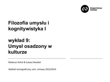 Filozofia umysłu i kognitywistyka I wykład 9: Umysł osadzony w kulturze Mateusz Hohol & Łukasz Kwiatek Wykład monograficzny, sem. zimowy 2013/2014 Umysł ucieleśniony – przypomnienie • „Nie istnieje ktoś taki jak człowiek obliczeniowy (…), którego umysł jakimś sposobem wytwarza znaczenie, otrzymując pozbawione znaczenia symbole „na wejściu”, przetwarzając je zgodnie z regułami i ponownie generując „na wyjściu”. Prawdziwi ludzie mają umysły ucieleśnione, a ich systemy pojęciowe powstają dzięki żywemu ciało, są przez nie ukształtowane i dzięki niemu posiadają znaczenie. Sieci neuronowe w naszych mózgach wytwarzają systemy pojęciowe i struktury językowe, których nie da się adekwatnie wyjaśnić jedynie za pomocą przetwarzających symbole systemów formalnych” G. Lakoff, M. Johnson, Co kognitywizm wniosi do filozofii UMYSŁ OSADZONY W KULTURZE (EMBEDDED MIND) Neurokognitywna teoria poznania społecznego – Michael Tomasello • Tomasello, Kulturowe źródła ludzkiego poznawania, przeł. J. Rączaszek, PIW, Warszawa 2002 . • Tomasello, Constructing a Language. A Usage-Based Theory of Language Acquisition, Harvard University Press, Cambridge-London 2003. • M. . Tomasello, Why We Cooperate?, The MIT Press, Cambridge-MA 2009. „Główna odmiana naszej hemoglobiny, na przykład, białka przenoszącego tlen, które nadaje krwi kolor czerwony, jest identyczna we wszystkich swoich 287 podjednostkach z hemoglobiną szympansa. Pod tym względem i pod wieloma innymi jesteśmy po prostu trzecim gatunkiem szympansa i to, co dobre dla bonobo i dla szympansa pospolitego, musi i nam wystarczyć. Istotne i rzucające się w oczy cechy odróżniające nas od innych szympansów - wyprostowana postawa, duży mózg, zdolność mowy, skąpe owłosienie ciała i osobliwe obyczaje seksualne - muszą się pomieścić w zaledwie 1,6 procent naszego programu genetycznego”. Jared Diamond, Trzeci szympans. Ewolucja i przyszłość zwierzęcia zwanego człowiekiem Zagadka do rozwiązania „6 milionów lat, oddzielających istoty ludzkie od innych człekokształtnych, to z ewolucyjnego punktu widzenia bardzo krótki okres. Szacuje się, że wspólny materiał genetyczny człowieka współczesnego i szympansów wynosi około 99%. Jest to podobny stopień pokrewieństwa, jak pomiędzy innymi siostrzanymi rodzajami, na przykład między lwami i tygrysami, końmi i zebrami czy szczurami i myszami. Głównym problemem jest więc kwestia czasu. Nie był on bowiem na tyle długi, by w drodze normalnych procesów ewolucji biologicznej, opierających się na zmienności genetycznej i doborze naturalnym, mogła powstać oddzielnie każda ze zdolności, umożliwiających współczesnemu człowiekowi tworzenie i podtrzymywanie złożonego przemysłu i technologii narzędziowych, wyższych form komunikacji i reprezentacji symbolicznej oraz zaawansowanego systemu instytucji i organizacji społecznych”. Tomasello 2002 Mało tego: „Zagadka staje się jeszcze bardziej tajemnicza, gdy weźmiemy pod uwagę wyniki ostatnich badań paleoantropologicznych, z których wynika, że a) poza okresem ostatnich 2 milionów lat przeszłość człowieka współczesnego nie wskazuje na to, że miał on jakiekolwiek zdolności poznawcze poza typowymi dla wszystkich człekokształtnych; b) pierwsze wyraźne oznaki zdolności poznawczych specyficznych dla naszego gatunku można zauważyć dopiero w danych pochodzących z okresu prawie ćwierć miliona lat temu, czyli wtedy, gdy wyłonił się współczesny Homo sapiens” Tomasello, Kulturowe źródła ludzkiego poznawania Filogeneza a ontogeneza „Ontogeneza jest (...), wraz ewolucją i historią, równorzędnym pod względem znaczenia elementem kształtującym poznanie ludzkie. Ludzie ewoluowali w ten sposób, że ich normalna ontogeneza poznawcza musi przebiegać w określonym rodzaju środowiska kulturowego (…). By w pełni docenić rolę procesów kulturowo-historycznych w kształtowaniu poznania człowieka współczesnego, musimy przyjrzeć się temu, co dzieje się w czasie ontogenezy. Kumulatywna ewolucja kulturowa sprawia, że ludzki rozwój poznawczy zachodzi w środowisku coraz to nowszych wytworów i praktyk społecznych, które w każdym momencie reprezentują coś, co można nazwać zbiorową mądrością całej grupy społecznej”. (Tomasello 2002) Ontogeneza nie jest powtórzeniem filogenezy! Hipoteza Tomasello • Hipoteza: Istotnym wytworem ewolucji biologicznej jest forma poznania społecznego, dzięki której wyewoluowało uczenie się, rozumiane jako proces kulturowy, co z kolei umożliwiło kumulatywną ewolucję kulturową. • Zapadka kulturowa: zapewnia trwałość wytworów kulturowych, nie pozwala cofnąć się do poprzednich form ewolucji, dzięki niej młode osobniki mogą uczyć się wspólnego dziedzictwa kulturowego, nie muszą „startować od zera”. Trzy wymiary hipotezy • Filogenetyczny: „człowiek współczesny rozwinął w procesie ewolucji zdolność utożsamiania się z członkami własnego gatunku, co doprowadziło do tego, że ludzie rozumieją innych jako istoty podobne im samym: intencjonalne i obdarzone umysłem”. • Historyczny: „to przystosowanie umożliwiło nowe formy uczenia się kulturowego i socjogenezę, która z kolei doprowadziła do powstania wytworów kulturowych i tradycji behawioralnych”. • Ontogenetyczny: „dzieci wzrastają wśród owych wytworów i tradycji kształtowanych w procesie historycznym, co umożliwia im korzystanie z wiedzy i umiejętności zgromadzonych przez grupę, do której należą; rozwijanie i używanie reprezentacji poznawczych opartych na zmiennej perspektywie, mających formę symboli językowych (...); internalizowanie pewnych typów interakcji dyskursywnych i rozwijanie zdolności metapoznania, re-deskrypcji reprezentacji i myślenia dialogowego”. Tomasello 2002 Najistotniejsza zdolność kognitywna „Chciałbym tu bronić twierdzeni
