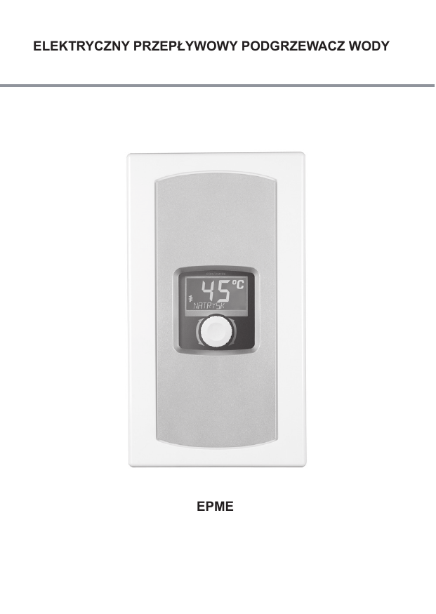 ELEKTRYCZNY PRZEPŁYWOWY PODGRZEWACZ WODY EPME Zużyty produkt nie może być traktowany jako odpad komunalny. Zdemontowane, urządzenie należy dostarczyć do punktu zbiórki sprzętu elektrycznego i elektronicznego w celu recyklingu. Odpowiednie zadysponowanie zużytego produktu zapobiega potencjalnym negatywnym wpływom na środowisko jakie mogłyby wystąpić w przypadku niewłaściwego zagospodarowania odpadów. W celu uzyskania bardziej szczegółowych informacji na temat recyklingu tego produktu, należy skontaktować się z lokalną jednostką samorządu terytorialnego, ze służbami zagospodarowania odpadów lub ze sklepem w którym zakupiony został ten produkt. 2 Warunki bezpiecznej i niezawodnej pracy 1. Zapoznanie się z treścią niniejszej instrukcji obsługi umożliwi prawidłową instalację i eksploatację urządzenia, zapewniając jego długotrwałą i niezawodną pracę. 2. Podgrzewacz można użytkować tylko wówczas, gdy został on prawidłowo zainstalowany i znajduje się w nienagannym stanie technicznym. 3. Podgrzewacz EPME przeznaczony jest zarówno do instalacji króćcami w kierunku ściany, jak i króćcami skierowanymi do dołu 4. Przed pierwszym uruchomieniem oraz po każdym opróżnieniu podgrzewacza z wody (np. w związku z pracami przy instalacji wodociągowej z powodu konserwacji) powinien on zostać odpowietrzony wg punktu „odpowietrzenie”. 5. Podłączenie podgrzewacza do sieci elektrycznej oraz pomiar skuteczności ochrony przeciwporażeniowej powinien wykonać elektryk z uprawnieniami. 6. Podgrzewacz należy bezwzględnie uziemić lub zerować. 7. Jeżeli na rurze doprowadzającej wodę do podgrzewacza znajduje się zawór zwrotny, należy bezwzględnie zamontować zawór bezpieczeństwa na odcinku między podgrzewaczem a zaworem zwrotnym. 8. Ze względów ekonomicznych podgrzewacz powinien być zamontowany w pobliżu najczęściej używanego zaworu czerpalnego. 9. Nie należy stosować rur z tworzyw sztucznych - ani na doprowadzeniu zimnej wody, ani na odprowadzeniu ciepłej. 10 Podgrzewacz współpracuje z dostępnymi na rynku bateriami dwuzaworowymi, jednouchwytowymi bez termostatu. 11. Urządzenia nie wolno instalować w pomieszczeniach zagrożonych niebezpieczeństwem wybuchu, oraz w których temperatura otoczenia może obniżyć się poniżej 0°C. 12. Należy pilnować, aby włączony podgrzewacz nie został opróżniony z wody, co może wystąpić przy braku wody w sieci wodociągowej. 13. Nie otwierać obudowy podgrzewacza przy włączonym zasilaniu elektrycznym. 14. Brak filtra sitkowego na zasilaniu wodnym grozi uszkodzeniem podgrzewacza. Niniejsze urządzenie nie jest przeznaczone do użytkowania przez osoby (w tym dzieci) o ograniczonej zdolności fizycznej, czuciowej lub psychicznej, lub osoby nie mające doświadczenia lub znajomości urządzenia, chyba że odbywa się to pod nadzorem lub zgodnie z instrukcją użytkowania urządzenia, przekazanej przez osoby odpowiadające za ich bezpieczeństwo. Należy zwracać uwagę na dzieci, aby nie bawiły się urządzeniem. 004B_f. 3 Montaż 1. Doprowadzić do miejsca montażu podgrzewacza instalację elektryczną i wodną, zgodnie z obowiązującymi przepisami. 2. Zdjąć obudowę podgrzewacza: odkręcić wkręt i wysunąć ją z zaczepów. 3. W przypadku króćców skierowanych do ściany: do końcówek instalacji wkręcić dwa przyłącza instalacji zgodnie z rysunkiem, przy czym od strony wlotu wody do podgrzewacza dokonać tego poprzez filtr sitkowy. Następnie przez otwory w podstawie przełożyć podgrzewacz i przykręcić końcówki podgrzewacza do końcówek przyłącza instalacji. W dalszej kolejności zamocować podgrzewacz do ściany. 4. W przypadku króćców skierowanych w dół: wyłamać cienką ściankę w dwu miejscach u dołu podstawy, przykręcić do podgrzewacza dwa przyłącza instalacji jak na rysunku tak, aby były skierowane w dół. Następnie podłączyć (np. za pomocą elastycznych wężyków zbrojonych) doprowadzenie zimnej wody do króćca wlotowego poprzez filtr sitkowy i odprowadzenie ciepłej wody do króćca wylotowego. 5. Włączyć zimną wodę i sprawdzić szczelność połączeń wodnych. 6. Podłączyć podgrzewacz do instalacji elektrycznej zgodnie z oznaczeniami, poprzez przełożenie przewodu zasilającego przez prostokątny otwór u dołu podstawy. 7. Zamontować obudowę podgrzewacza w kolejności odwrotnej jak w punkcie 2. 8. Zamontować obudowę podgrzewacza. 9. Upewnić się, czy przez otwory w tylnej ściance urządzenia nie ma dostępu do elementów będących pod napięciem. 4 Podłączenie podgrzewacza króćcami do ściany Podłączenie podgrzewacza króćcami do dołu Odpowietrzenie 1. Wyłączyć zasilanie elektryczne podgrzewacza. 2. Włączyć przepływ wody (odkręcić zawór ciepłej wody) w celu odpowietrzenia instalacji (ok.15÷30 sekund) aż woda zacznie płynąć jednolitym, równym strumieniem. 3. Zamknąć zawór. 4. Włączyć zasilanie elektryczne. Czynności wykonać każdorazowo po zaniku wody. 004B_f. 5 Konfiguracja EPME Przed pierwszym włączeniem napięcia należy ustawić przełącznikami 1-3 moc znamionową podgrzewacza (dostosowaną do posiadanego przyłącza energetycznego). Szare pole wskazuje pozycję przełącznika. Przełącznik 4 w pozycji ON powoduje zablokowanie nastaw w podgrzewaczu. W takim przypadku na wyświetlaczu pokazywana jest temperatura zadana (ustawiona przed wyłączeniem podgrzewacza) i sygnalizacja grzania oraz pozostałych stanów mogących wystąpić w trakcie pracy urządzenia. Po włączeniu zasilania na wyświetlaczu pojawi się wersja oprogramowania panelu (PW.....), a następnie wersja oprogramowania sterownika (MSP....) i wartość ustawionej mocy znamionowej podgrzewacza. P 5,5kW P 6,0kW P 6,5kW P 7,0kW P 7,5kW P 8,0kW P 8,5kW Eksploatacja EPME Podgrzewacz włącza się automatycznie po osiągnięciu przepływu powyżej 2,5 l/min. Układ sterowania dobiera odpowiednią moc podgrzewac