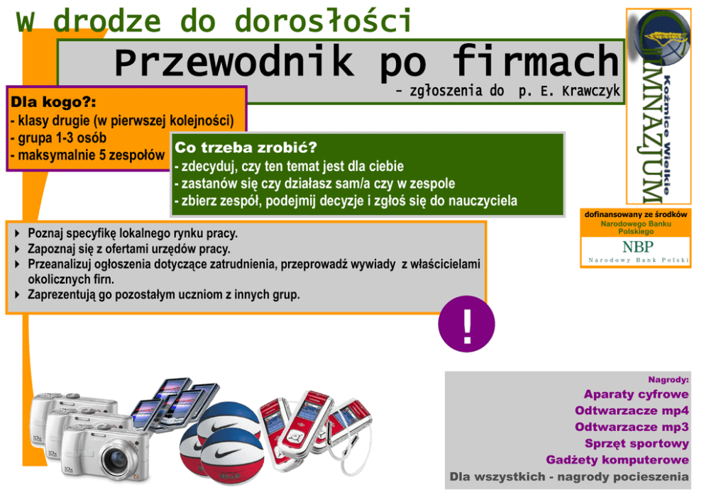 W drodze do dorosłości Przewodnik po firmach - zgłoszenia do p. E. Krawczyk Dla kogo?: - klasy drugie (w pierwszej kolejności) - grupa 1-3 osób - maksymalnie 5 zespołów Co trzeba zrobić? - zdecyduj, czy ten temat jest dla ciebie - zastanów się czy działasz sam/a czy w zespole - zbierz zespół, podejmij decyzje i zgłoś się do nauczyciela Poznaj specyfikę lokalnego rynku pracy. Zapoznaj się z ofertami urzędów pracy. Przeanalizuj ogłoszenia dotyczące zatrudnienia, przeprowadź wywiady z właścicielami okolicznych firn. Zaprezentują go pozostałym uczniom z innych grup. dofinansowany ze środków Narodowego Banku Polskiego ! Nagrody: Aparaty cyfrowe Odtwarzacze mp4 Odtwarzacze mp3 Sprzęt sportowy Gadżety komputerowe Dla wszystkich - nagrody pocieszenia