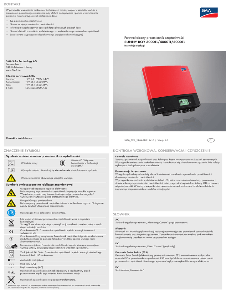 Kontakt W przypadku wystąpienia problemów technicznych prosimy najpierw skontaktować się z instalatorem posiadanego urządzenia. Aby ułatwić postępowanie i pomoc w rozwiązaniu problemu, należy przygotować następujące dane: • • • • • Typ przemiennika częstotliwości Numer seryjny przemiennika częstotliwości Informacja o podłączonych ogniwach fotowoltaicznych oraz ich ilości Numer lub treść komunikatu wyświetlonego na wyświetlaczu przemiennika częstotliwości Zastosowane wyposażenie dodatkowe (np. urządzenia komunikacyjne) Fotowoltaiczny przemiennik częstotliwości SUNNY BOY 3000TL/4000TL/5000TL Instrukcja obsługi SMA Solar Technology AG Sonnenallee 1 34266 Niestetal, Niemcy www.SMA.de Infolinia serwisowa SMA Inwertery: +49 561 9522 1499 Komunikacja: +49 561 9522 2499 Faks: +49 561 9522 4699 E‑mail: [email protected] Kontakt z instalatorem SB30_50TL_21-BA-BPL113410 | Wersja 1.0 Znaczenie symboli Kontrola wzrokowa, konserwacja i czyszczenie Symbole umieszczone na przemienniku częstotliwości Wskaźnik pracy PL Bluetooth . Włączona komunikacja w technologii Bluetooth.* ® Wystąpiła usterka. Skontaktuj się niezwłocznie z instalatorem urządzenia. Wobec uziemienia obowiązują specjalne wymogi. Symbole umieszczone na tabliczce znamionowej Uwaga! Niebezpieczne napięcie elektryczne. Podczas pracy w przemienniku częstotliwości występuje wysokie napięcie. Wszystkie czynności przy instalacji elektrycznej przemiennika mogą być wykonywane wyłącznie przez profesjonalnego elektryka. Kontrola wzrokowa Sprawdź przemiennik częstotliwości oraz kable pod kątem występowania uszkodzeń zewnętrznych. W przypadku stwierdzenia uszkodzeń należy skontaktować się z instalatorem urządzenia. Nie należy wykonywać żadnych napraw samodzielnie. Konserwacja i czyszczenie W regularnych odstępach należy zlecać instalatorowi urządzenia sprawdzenie prawidłowości działania przemiennika częstotliwości. W przypadku zabrudzenia wyświetlacza i diod LED, które znacznie utrudnia odczyt parametrów i stanów roboczych przemiennika częstotliwości, należy wyczyścić wyświetlacz i diody LED za pomocą wilgotnej szmatki. W żadnym wypadku do czyszczenia nie wolno stosować środków o działaniu żrącym (np. rozpuszczalników, środków szorujących). Uwaga! Gorąca powierzchnia. Podczas pracy przemiennik częstotliwości może się bardzo rozgrzać. Dlatego nie należy dotykać włączonego przemiennika. Przestrzegać treści załączonej dokumentacji. Nie wolno utylizować przemiennika częstotliwości wraz z odpadami komunalnymi. Szczegółowe informacje dotyczące utylizacji urządzenia zawiera załączona do niego instrukcja montażu. Oznakowanie CE. Przemiennik częstotliwości spełnia wymogi stosownych wytycznych UE. Oznakowanie klasy urządzenia. Przemiennik częstotliwości posiada wbudowany moduł komunikacji za pomocą fal radiowych, który spełnia wymogi norm zharmonizowanych. Sprawdzona jakość. Przemiennik częstotliwości spełnia stosowne europejskie wymogi ustawy dotyczącej bezpieczeństwa urządzeń i produktów. Znak jakości RAL Solar. Przemiennik częstotliwości spełnia wymogi niemieckiego Instytutu Jakości i Oznakowania. Australijski znak jakości Prąd stały (DC) Prąd przemienny (AC) Przemiennik częstotliwości jest zabezpieczony z każdej strony przed przedostaniem się do jego wnętrza kurzu i strumieni wody. Przemiennik częstotliwości nie posiada transformatora. * Marka oraz logo Bluetooth® są zastrzeżonymi znakami towarowymi firmy Bluetooth SIG, Inc.; używanie tych marek przez spółkę SMA Solar Technology AG ma miejsce na podstawie udzielonej licencji. Słownik AC Skrót od angielskiego terminu „Alternating Current“ (prąd przemienny). Bluetooth Bluetooth jest technologią komunikacji radiowej stosowanej przez przemiennik częstotliwości do komunikowania się z innymi urządzeniami. Komunikacja Bluetooth jest możliwa pod warunkiem znajdowania się urządzeń w swoim bezpośrednim zasięgu. DC Skrót od angielskiego terminu „Direct Current“ (prąd stały). Electronic Solar Switch (ESS) Electronic Solar Switch (elektroniczny przełącznik solarny - ESS) stanowi element rozłącznika obwodu DC w przemienniku częstotliwości. ESS musi być dobrze zamontowany w dolnej części przemiennika częstotliwości i wolno go wyjmować wyłącznie wykwalifikowanym elektrykom. PV Skrót terminu „Fotowoltaika”. wskazówki dotyczące bezpieczeństwa ZAGROŻENIE! Zagrożenie porażeniem prądu wskutek występowania w przemienniku częstotliwości wysokich napięć. Nawet gdy przemiennik częstotliwości nie jest podłączony do zewnętrznej instalacji elektrycznej, mogą w nim wystąpić wysokie napięcia. • Wszystkie czynności instalacyjne, naprawy i modyfikacje urządzenia mogą być wykonywane wyłącznie przez profesjonalnego elektryka. • Osoby o ograniczonych zdolnościach fizycznych lub psychicznych mogą wykonywać czynności przy przemienniku częstotliwości wyłącznie po uprzednim poinstruowaniu i pod nadzorem innej osoby. • Dzieciom nie wolno bawić się przemiennikiem częstotliwości. Przemiennik częstotliwości należy umieścić w miejscu niedostępnym dla dzieci. widok ogólny urządzenia Identyfikacja przemiennika częstotliwości serii Sunny Boy za pomocą tabliczki znamionowej Numer seryjny Górna pokrywa obudowy Dolna pokrywa obudowy OSTROŻNIE! Graficzny wyświetlacz • Gdy urządzenie jest włączone, wolno dotykać tylko jego dolnej części. Electronic Solar Switch (ESS) Zagrożenie odniesieniem obrażeń wskutek kontaktu z obudową włączonego urządzenia. Zagrożenie oparzeniem ciała. UWAGA! Zmniejszenie uzysku energii wskutek niewłaściwego odprowadzania ciepła! Diody LED • Nie kłaść na obudowie urządzenia żadnych przedmiotów. graficzny wyświetlacz Wskazania wyświetlacza dotyczące instalacji fotowoltaicznej są aktualizowane co 5 sekund. Postukanie palcem na d
