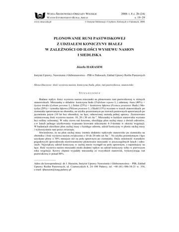 WODA-ŚRODOWISKO-OBSZARY WIEJSKIE WATER-ENVIRONMENT-RURAL AREAS www.imuz.edu.pl 2008: t. 8 z. 2b (24) s. 19–29 © Instytut Melioracji i Użytków Zielonych w Falentach, 2008 PLONOWANIE RUNI PASTWISKOWEJ Z UDZIAŁEM KONICZYNY BIAŁEJ W ZALEŻNOŚCI OD ILOŚCI WYSIEWU NASION I SIEDLISKA Józefa HARASIM Instytut Uprawy, Nawożenia i Gleboznawstwa – PIB w Puławach, Zakład Uprawy Roślin Pastewnych Słowa kluczowe: ilość wysiewu nasion, koniczyna biała, plon, ruń pastwiskowa, stanowisko Streszczenie Badano wpływ ilości wysiewu nasion mieszanki na plonowanie runi pastwiskowej w różnych stanowiskach. Mieszankę o składzie: koniczyna biała (Trifolium repens L.) odmiany Aura (40%) + życica trwała (Lolium perenne L.) Solen (25%) + kostrzewa łąkowa (Festuca pratensis Huds.) Motycka (20%) + tymotka łąkowa (Phleum pratense L.) Skald (15%) wysiano w trzech stanowiskach: po ziemniaku uprawianym na oborniku, na użytku przemiennym po trawach pastewnych uprawianych po jęczmieniu jarym (10 lat bez obornika), na łące, odnowionej metodą pełnej uprawy. Zastosowano zróżnicowaną ilość wysiewu nasion: 10, 20 i 30 szt.·ha–1. Mieszankę w każdym stanowisku wysiano bez rośliny ochronnej. W roku siewu ruń koszono, określając plon suchej masy z dwóch odrostów, a w latach pełnego użytkowania wypasano krowami mlecznymi 4–5-krotnie w okresie wegetacji. W badaniach określano plon suchej masy z każdego odrostu, udział koniczyny w plonie suchej masy i wykorzystanie runi przez zwierzęta. Stwierdzono, że na plon suchej masy istotnie dodatnio wpływało stanowisko po ziemniaku na oborniku i ilość wysiewu nasion zwiększona z 10 do 20 mln szt.·ha–1. Na użytku przemiennym i łące uzyskano plony o 50% mniejsze niż na polu uprawnym po ziemniaku. Duża zmienność warunków pogodowych spowodowała nierównomierne plonowanie mieszanki w poszczególnych latach i odrostach. Największy udział koniczyny w suchej masie wystąpił na polu uprawnym, a najmniejszy na łące. Ilość wysiewu nasion mieszanki miała dodatni wpływ na udział koniczyny tylko w pierwszym roku wegetacji. Krowy chętnie wyjadały mieszankę ze wszystkich stanowisk, wykorzystując ruń pastwiskową w ponad 80%. Adres do korespondencji: dr J. Harasim, Instytut Uprawy Nawożenia i Gleboznawstwa – PIB, Zakład Uprawy Roślin Pastewnych, ul. Czartoryskich 8, 24–100 Puławy; tel. +48 (81) 886-34-21 w. 354, e-mail: [email protected] 20 Woda-Środowisko-Obszary Wiejskie t. 8 z. 2b (24) WSTĘP Pastwiskowy sposób żywienia zwierząt jest konkurencyjny wobec systemu alkierzowego zarówno pod względem ekonomicznym, jak i zoohigienicznym [FALKOWSKI, 1983; TERLIKOWSKI, 1999; WASILEWSKI, 1994]. Uprawa mieszanek pastwiskowych z udziałem roślin motylkowatych odgrywa coraz większą rolę w gospodarstwach prowadzących produkcję mleka i mięsa wołowego [GAJDA, SAWICKI, KRAWCZYK, 2000]. Plonowanie zależy od wielu czynników, zwłaszcza od komponentów mieszanek, których dobór powinien być dostosowany zarówno do warunków siedliskowych, jak i sposobu użytkowania runi. Innym czynnikiem jest ilość wysiewu nasion, którą na gruntach ornych można ograniczyć nawet do 10 mln szt.·ha–1 [HARASIM, 2001b]. Na ogół proponuje się zawyżoną ilość wysiewu nasion, podawaną w jednostkach masy. Najczęściej odnosi się ona do siedlisk trwałych użytków zielonych [DOMAŃSKI, 1999; GRZYB, 1988]. Możliwość zmniejszenia ilości wysiewanych nasion wpływa na zmniejszenie kosztów uprawy i może dodatnio oddziaływać na ruń w latach pełnego użytkowania [KOZŁOWSKA, 1992; 1995]. Ustalanie masy wysiewu poszczególnych komponentów powinno odnosić się do pożądanej obsady roślin (mln szt.·ha–1), z uwzględnieniem nie tylko wartości siewnej, ale również masy tysiąca nasion (MTN) każdego z tych komponentów. MTN jest cechą, której wartość różni się zarówno w obrębie gatunków roślin, jak i odmian [MARTYNIAK, ŻYŁKA, 2001; Trawy..., 1982]. Celem badań była ocena plonowania runi pastwiskowej w zależności od ilości wysiewu mieszanki nasion i warunków siedliskowych. METODY I WARUNKI BADAŃ Badania prowadzono w latach 2004–2007 w RZD Grabów (woj. mazowieckie) w trzech siedliskach: 1. na polu uprawnym w stanowisku po ziemniaku na oborniku, 2. na użytku przemiennym w stanowisku po jęczmieniu jarym, uprawianym po trawach pastewnych, 3. na łące trwałej, zagospodarowanej metodą pełnej uprawy. W siedliskach 1. i 2. była gleba płowa – kompleksu żytniego bardzo dobrego, a w siedlisku 3. – czarna ziemia zdegradowana. Odczyn gleby we wszystkich siedliskach był lekko kwaśny. Gleba łąkowa cechowała się małą zawartością fosforu i potasu, a gleba pod użytkiem przemiennym była uboga w potas. Doświadczenie prowadzono w każdym siedlisku w trzech powtórzeniach. Wiosną 2004 r. wysiano mieszankę pastwiskową o składzie: koniczyna biała (Trifolium repens L.) odmiany Aura (40%) + życica trwała (Lolium perenne L.) Solen (25%) + kostrzewa łąkowa (Festuca pratensis Huds.) Motycka (20%) + tymotka łąkowa (Phleum pratense L.) Skald (15%). Zastosowano 3 ilości wysiewu: 10, 20 i 30 mln szt. nasion kiełkujących na 1 ha, co odpowiadało masie nasion: 17, 34 i 51 kg·ha–1. Takie zróżnicowanie ilości wysiewu nasion umożliwiało wskazanie normy wysiewu dla poszczególnych siedlisk. Masę nasion każdego gatunku obliczono według wzoru [HARASIM, 2001b]: Iw = abu 100 cd 21 J. Harasim: Plonowanie runi pastwiskowej z udziałem koniczyny białej… gdzie: Iw – masa wysiewanych nasion, kg·ha–1; a – planowana obsada roślin, mln szt.·ha–1; b – MTN (masa tysiąca nasion), g; c – zdolność kiełkowania nasion, %; d – czystość nasion, %; u – udział gatunku w mieszance, %. Nasiona pochodziły z Hodowli Roślin Szelejewo i Antoniny. Zdolność kiełkowania nasion wynosiła 94–96%, a ich czystość 98,8–99,8%. W każdym siedlisku mieszankę wysiano bez ro