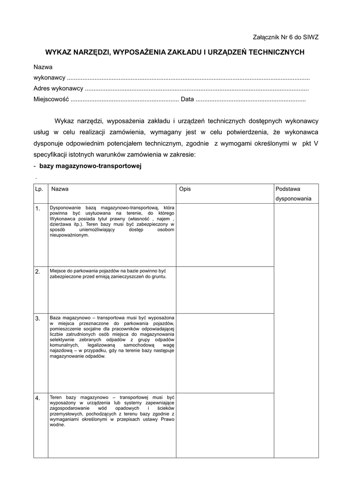 Załącznik Nr 6 do SIWZ WYKAZ NARZĘDZI, WYPOSAŻENIA ZAKŁADU I URZĄDZEŃ TECHNICZNYCH Nazwa wykonawcy ............................................................................................................................................. Adres wykonawcy .................................................................................................................................. Miejscowość ............................................................... Data ................................................................ Wykaz narzędzi, wyposażenia zakładu i urządzeń technicznych dostępnych wykonawcy usług w celu realizacji zamówienia, wymagany jest w celu potwierdzenia, że wykonawca dysponuje odpowiednim potencjałem technicznym, zgodnie z wymogami określonymi w pkt V specyfikacji istotnych warunków zamówienia w zakresie: - bazy magazynowo-transportowej . Lp. Nazwa Opis Podstawa dysponowania 1. Dysponowanie bazą magazynowo-transportową, która powinna być usytuowana na terenie, do którego Wykonawca posiada tytuł prawny (własność , najem , dzierżawa itp.). Teren bazy musi być zabezpieczony w sposób uniemożliwiający dostęp osobom nieupoważnionym. 2. Miejsce do parkowania pojazdów na bazie powinno być zabezpieczone przed emisją zanieczyszczeń do gruntu. 3. Baza magazynowo – transportowa musi być wyposażona w miejsca przeznaczone do parkowania pojazdów, pomieszczenie socjalne dla pracowników odpowiadającej liczbie zatrudnionych osób miejsca do magazynowania selektywnie zebranych odpadów z grupy odpadów komunalnych, legalizowaną samochodową wagę najazdową – w przypadku, gdy na terenie bazy następuje magazynowanie odpadów. 4. Teren bazy magazynowo – transportowej musi być wyposażony w urządzenia lub systemy zapewniające zagospodarowanie wód opadowych i ścieków przemysłowych, pochodzących z terenu bazy zgodnie z wymaganiami określonymi w przepisach ustawy Prawo wodne. 5. Teren bazy magazynowo – transportowej musi być wyposażony w miejsca do mycia i dezynfekcji pojazdów (o ile czynności te nie będą wykonywane przez uprawnione podmioty zewnętrzne poza terenem bazy). 6. Teren bazy magazynowo – transportowej musi być wyposażony w urządzenia do selektywnego gromadzenia odpadów komunalnych przed ich transportem do miejsc przetwarzania. – pojazdów Lp. Nazwa 1. Samochody specjalistyczne przystosowane do odbierania zmieszanych odpadów komunalnych (co najmniej 2 samochody) 2. Samochody przystosowane do odbioru selektywnie zebranych odpadów komunalnych (co najmniej 2 samochody) 3. Pojazd do odbierania odpadów komunalnych bez funkcji kompaktującej, który spełnia wymagania określone w Rozporządzeniu Ministra Środowiska z dnia 11 stycznia 2013 w sprawie szczegółowych wymagań w zakresie odbierania odpadów komunalnych od właścicieli nieruchomości (co najmniej 1 pojazd) Ilość Podstawa dysponowania Jeżeli Wykonawca polega na potencjale technicznym innych podmiotów należy do powyższego wykazu dołączyć pisemne zobowiązanie tych podmiotów do oddania do dyspozycji wykazanych narzędzi, wyposażenia zakładu urządzeń technicznych na okres korzystania z nich przy wykonywaniu zamówienia. Oświadczam, iż wszystkie pojazdy wykorzystywane do realizacji przedmiotu zamówienia spełniają wymogi dotyczące: a) wszystkie pojazdy wykorzystywane do realizacji przedmiotu zamówienia będą dostosowane w zakresie wielkości i rodzaju samochodów odbierających odpady do parametrów ulic/dróg, tj. ich szerokości oraz gęstości zabudowy, b) pojazdy wykorzystywane do realizacji przedmiotu zamówienia będą trwale i czytelnie oznakowane w widocznym miejscu nazwą firmy oraz danymi teleadresowymi podmiotu odbierającego odpady komunale od właścicieli nieruchomości, c) pojazdy wykorzystywane do realizacji przedmiotu zamówienia będą posiadać aktualne badania techniczne, być dopuszczone do ruchu. W przypadku awarii pojazdu będzie zapewniony pojazd zastępczy o zbliżonych parametrach, d) pojazdy będą posiadać konstrukcję zabezpieczającą przed rozwiewaniem i rozpylaniem przewożonych odpadów oraz minimalizującą oddziaływanie czynników atmosferycznych na odpady, e) pojazdy będą wyposażone w narzędzia lub urządzenia umożliwiające sprzątanie terenu po opróżnieniu pojemników, oraz zapewniam, dla właściwej realizacji przedmiotu zamówienia, przez cały czas trwania umowy dostateczną ilość pojazdów, gwarantujących terminowe i jakościowe wykonanie zakresu rzeczowego usługi, w ilości co najmniej takiej, jak w złożonej w postępowaniu przetargowym ofercie, nie mniej jednak niż co najmniej 2 samochody specjalistyczne przystosowane do odbierania zmieszanych odpadów komunalnych, co najmniej 2 samochody przystosowane do odbioru selektywnie zebranych odpadów komunalnych, co najmniej 1 pojazd do odbierania odpadów komunalnych bez funkcji kompaktującej, który spełnia wymagania określone w Rozporządzeniu Ministra Środowiska z dnia 11 stycznia 2013 w sprawie szczegółowych wymagań w zakresie odbierania odpadów komunalnych od właścicieli nieruchomości. .................................................................. (data i czytelny podpis wykonawcy)
