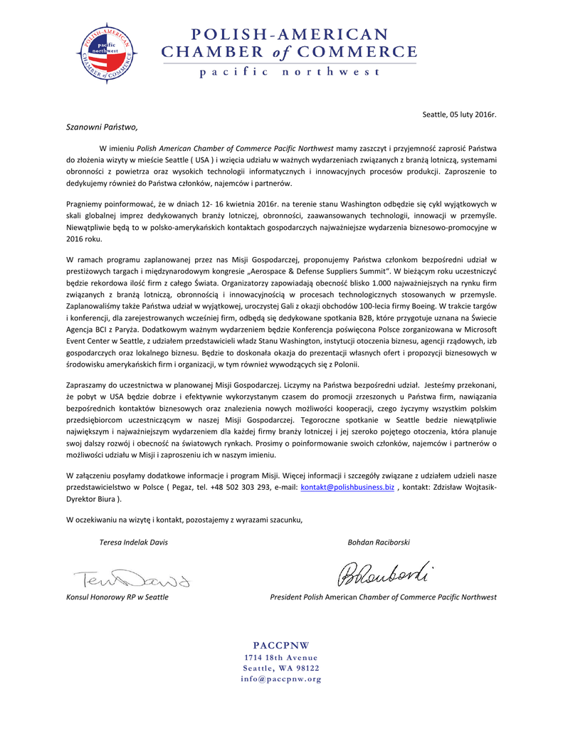 Seattle, 05 luty 2016r. Szanowni Państwo, W imieniu Polish American Chamber of Commerce Pacific Northwest mamy zaszczyt i przyjemnośd zaprosid Paostwa do złożenia wizyty w mieście Seattle ( USA ) i wzięcia udziału w ważnych wydarzeniach związanych z branżą lotniczą, systemami obronności z powietrza oraz wysokich technologii informatycznych i innowacyjnych procesów produkcji. Zaproszenie to dedykujemy również do Paostwa członków, najemców i partnerów. Pragniemy poinformowad, że w dniach 12- 16 kwietnia 2016r. na terenie stanu Washington odbędzie się cykl wyjątkowych w skali globalnej imprez dedykowanych branży lotniczej, obronności, zaawansowanych technologii, innowacji w przemyśle. Niewątpliwie będą to w polsko-amerykaoskich kontaktach gospodarczych najważniejsze wydarzenia biznesowo-promocyjne w 2016 roku. W ramach programu zaplanowanej przez nas Misji Gospodarczej, proponujemy Paostwa członkom bezpośredni udział w prestiżowych targach i międzynarodowym kongresie „Aerospace & Defense Suppliers Summit“. W bieżącym roku uczestniczyd będzie rekordowa ilośd firm z całego Świata. Organizatorzy zapowiadają obecnośd blisko 1.000 najważniejszych na rynku firm związanych z branżą lotniczą, obronnością i innowacyjnością w procesach technologicznych stosowanych w przemysle. Zaplanowaliśmy także Paostwa udział w wyjątkowej, uroczystej Gali z okazji obchodów 100-lecia firmy Boeing. W trakcie targów i konferencji, dla zarejestrowanych wcześniej firm, odbędą się dedykowane spotkania B2B, które przygotuje uznana na Świecie Agencja BCI z Paryża. Dodatkowym ważnym wydarzeniem będzie Konferencja poświęcona Polsce zorganizowana w Microsoft Event Center w Seattle, z udziałem przedstawicieli władz Stanu Washington, instytucji otoczenia biznesu, agencji rządowych, izb gospodarczych oraz lokalnego biznesu. Będzie to doskonała okazja do prezentacji własnych ofert i propozycji biznesowych w środowisku amerykaoskich firm i organizacji, w tym również wywodzących się z Polonii. Zapraszamy do uczestnictwa w planowanej Misji Gospodarczej. Liczymy na Paostwa bezpośredni udział. Jesteśmy przekonani, że pobyt w USA będzie dobrze i efektywnie wykorzystanym czasem do promocji zrzeszonych u Paostwa firm, nawiązania bezpośrednich kontaktów biznesowych oraz znalezienia nowych możliwości kooperacji, czego życzymy wszystkim polskim przedsiębiorcom uczestniczącym w naszej Misji Gospodarczej. Tegoroczne spotkanie w Seattle bedzie niewątpliwie największym i najważniejszym wydarzeniem dla każdej firmy branży lotniczej i jej szeroko pojętego otoczenia, która planuje swoj dalszy rozwój i obecnośd na światowych rynkach. Prosimy o poinformowanie swoich członków, najemców i partnerów o możliwości udziału w Misji i zaproszeniu ich w naszym imieniu. W załączeniu posyłamy dodatkowe informacje i program Misji. Więcej informacji i szczegóły związane z udziałem udzieli nasze przedstawicielstwo w Polsce ( Pegaz, tel. +48 502 303 293, e-mail: [email protected] , kontakt: Zdzisław WojtasikDyrektor Biura ). W oczekiwaniu na wizytę i kontakt, pozostajemy z wyrazami szacunku, Teresa Indelak Davis Konsul Honorowy RP w Seattle Bohdan Raciborski President Polish American Chamber of Commerce Pacific Northwest PACCPNW 1 7 1 4 1 8 t h A v e n ue S e a t tl e , W A 9 8 1 2 2 i nf o @ p a c c p nw . o r g