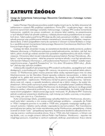 POLEMIKI ZATRUTE ŹRÓDŁO Uwagi do komentarza historycznego Sławomira Cenckiewicza z lutowego numeru „Biuletynu IPN” Instytut Pamięci Narodowej powołany został między innymi po to, by fakty ukrywane lub zakłamane w czasach PRL przybliżyć czytelnikowi. Firma IPN – oczekujemy tego – stać się powinna synonimem dobrego warsztatu historycznego. Czytając IPN-owskie komentarze historyczne, czytelnik ma prawo oczekiwać, że otrzyma tekst rzetelny, że prezentowane w tych tekstach fakty lub sylwetki zostaną z należytą starannością przedstawione ze wszystkich stron. Tekst wydany pod firmą IPN staje się dla wielu poważnym źródłem – tym większe szkody przynosi więc publikowanie tekstów nierzetelnych, zawierających błędne, niesprawdzone dane. Z takim przypadkiem mamy do czynienia w lutowym numerze Biuletynu w związku z opublikowaniem komentarza historycznego Sławomira Cenckiewicza Melchiora Wańkowicza kręta droga do Polski. Czytając ten tekst, stwierdzić muszę, że warsztatowe standardy zostały zaniżone, podano fałszywe informacje, a Wańkowicz pokazany został jednostronnie, nie takim, jaki był, lecz takim, jakim chcieli go widzieć zawistni lub uprzedzeni współzawodnicy do tytułu mistrza – wieszcza. Omawiany tekst nie jest indywidualną sprawą Instytutu Pamięci Narodowej, „Biuletynu” czy też samego autora – tekst ten przynosi wymierne szkody i musi być sprostowany. Oto bowiem fałszywa informacja o „willi podarowanej Pisarzowi w hołdzie” została rozpowszechniona przez „Tygodnik Powszechny” (nr 16 z dnia 18 kwietnia 2004 roku). „Biuletyn” stał się więc zatrutym źródłem. Ciekawą dla wszystkich jest prezentacja IPN-owskich archiwaliów, szczególnie tych mało dostępnych, a pochodzących z kręgów SB i cenzury, nie powinny one jednak tekstu zdominować. O Wańkowicza pytać można przecież także osoby reprezentujące inne niż obaj Mackiewiczowie czy też Stanisław Gierat sposoby widzenia rzeczywistości, a także inny pogląd na to, gdzie stać powinny drogowskazy, by dostrzec je mogły możliwie szerokie rzesze czytelników – wędrowców. Wańkowicz nie był na pewno osobą skromną – był świadomy swej roli, więcej, w sposób świadomy ustawiał się w takim miejscu, by zostać dostrzeżonym. Mimo prób czynionych przez niektórych, na przykład przez Czesława Miłosza, który w swej historii literatury polskiej Wańkowicza nie dostrzega, stał się on na długo przed śmiercią osobą i własnością publiczną, nic więc nie przeszkadza, by każdy mógł dawać wyraz swoim poglądom i dezawuować jego życie i twórczość. W „Biuletynie IPN” można by jednak oczekiwać prezentacji obiektywnej, czyli mówiąc po ludzku uczciwej, a nie prezentacji z tezą, jak czyni to p. Cenckiewicz. Autor omawianego tekstu, przedstawiając sylwetkę Melchiora Wańkowicza, skonstruował swój tekst i zawartą w nim ocenę wokół jednego problemu – przyjazdu do Polski w 1956 i następnie powrotu tu na stałe w 1958 roku, przyjazdu noszącego według cytowanych autorów i tekstów cechy zdrady i zaprzedania się komunistom. Pan Cenckiewicz pominął przy tym jedną, być może najciekawszą cechę Wańkowicza, perspektywę, z której oceniał on świat i ludzi – perspektywę reportera. Krytykowane działania zdecydowanie inaczej się ocenia z wańkowiczowskiej strony. Kraj w 1956 roku był miejscem, w którym coś się działo, coś, co mogło zmienić oblicze Polski i byt Polaków. Wańkowicz – reporter nie mógł tego porzucić, musiał być w centrum wydarzeń, dotknąć, posmakować. Kraj w stanie 96 97 POLEMIKI wrzenia, na ulicach Poznania leje się krew, czołgi sowieckie idą na Warszawę – on nie mógł siedzieć na kanapie w amerykańskim zaciszu, nie mógł też czyścić i pakować do skrzynek jajek (prowadzenie kurzej fermy dawało mu środki do życia). Musiał przyjechać, by to zobaczyć – wbrew emigracyjnym mentorom narzucającym wszystkim jedynie słuszny sposób traktowania sowieckiego reżymu w kraju. Z analizy przedstawionej w „Biuletynie” przez p. Cenckiewicza, powtórzmy, wyłania się Wańkowicz nie taki, jakim on był, lecz taki, jakim chcieli go widzieć inni. Zastanawiającym jest powielanie, a przez to nobilitowanie jako jedynie słusznych, obowiązujących w emigracyjnym środowisku „nieprzejednanych” postaw odmowy pisania do kraju, odmowy wydawania w kraju. Brakuje rzetelnej oceny skutków takich postaw. Pisarz żyje jedynie w świadomości swoich czytelników. Potencjalni czytelnicy Wańkowicza żyją w kraju. Prawie wszystkie próby pisania do szuflady kończyły się fiaskiem – z pustych szuflad nic nie dało się rzucić na maszyny drukarskie. Rysując czarną kreską ponad osiemdziesięcioletnie życie Wańkowicza, Cenckiewicz dokonuje szczególnej selekcji faktów, pomijając te, które z przyjętą tezą nie korespondują – w portrecie tym jest zarzut braku akcesu do Legionów, ale brakuje szerszej oceny działań, tego legionowego w gruncie rzeczy emisariusza w terenie najlepiej mu znanym, w ziemi mińskiej, w Bobrujsku, na dalekich, północno-wschodnich kresach Rzeczypospolitej. Cenckiewicz nie pisze o tym, że dwuletni pobyt „wypoczynkowy” na Cyprze zafundowali Wańkowiczowi rodacy, czyniąc go jako politycznie podejrzanego sanatora wręcz więźniem – gościem Jego Królewskiej Mości, pisze natomiast o nagannej skłonności Wańkowicza do zarabiania pieniędzy, posuwając się wręcz do pomówień o sprzedajność czy nieuczciwość w zbieraniu, w iście amerykański sposób, środków finansowych na to, by móc spokojnie pisać amerykańską trylogię (a przecież trylogia ta – W pępku Ameryki, Atlantyk–Pacyfik, Królik i oceany – powstała i dotarła do rąk subskrybentów). I tak można by dalej. Komentarz historyczny dotyczący Wańkowicza jest ciągle do napisania – pan Cenckiewicz tego nie zrobi. Po to, by taki komentarz napisać