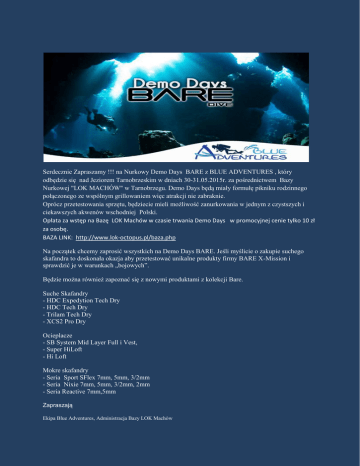 Serdecznie Zapraszamy !!! na Nurkowy Demo Days BARE z BLUE ADVENTURES , który odbędzie się nad Jeziorem Tarnobrzeskim w dniach 30-31.05.2015r. za pośrednictwem Bazy Nurkowej "LOK MACHÓW" w Tarnobrzegu. Demo Days będą miały formułę pikniku rodzinnego połączonego ze wspólnym grillowaniem więc atrakcji nie zabraknie. Oprócz przetestowania sprzętu, będziecie mieli możliwość zanurkowania w jednym z czystszych i ciekawszych akwenów wschodniej Polski. Opłata za wstęp na Bazę LOK Machów w czasie trwania Demo Days w promocyjnej cenie tylko 10 zł za osobę. BAZA LINK: http://www.lok-octopus.pl/baza.php Na początek chcemy zaprosić wszystkich na Demo Days BARE. Jeśli myślicie o zakupie suchego skafandra to doskonała okazja aby przetestować unikalne produkty firmy BARE X-Mission i sprawdzić je w warunkach „bojowych”. Będzie można również zapoznać się z nowymi produktami z kolekcji Bare. Suche Skafandry - HDC Expedytion Tech Dry - HDC Tech Dry - Trilam Tech Dry - XCS2 Pro Dry Ocieplacze - SB System Mid Layer Full i Vest, - Super HiLoft - Hi Loft Mokre skafandry - Seria Sport SFlex 7mm, 5mm, 3/2mm - Seria Nixie 7mm, 5mm, 3/2mm, 2mm - Seria Reactive 7mm,5mm Zapraszają Ekipa Blue Adventures, Administracja Bazy LOK Machów