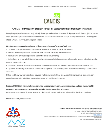 PROJEKT WSPÓŁFINANSOWANY JEST ZE ŚRODÓW MINISTERSTWA ZDROWIA Kraków, 25 stycznia 2017 CANDIS - Indywidualny program terapii dla uzależnionych od marihuany i haszyszu Konopie są najpopularniejszym i najczęściej używanym narkotykiem. Niestety obok przyjemnych doznań, jakich dostarczają, pojawia się niebezpieczeństwo uzależnienia. Osobom uzależnionym od tego rodzaju narkotyków z pomocą przychodzi CANDIS - indywidualny program terapii. O problemowym używaniu marihuany lub haszyszu można mówić w szczególności gdy: • Z powodu ich używania zaniedbujesz ważne obowiązki w pracy, w szkole lub w domu; • Używasz marihuany/haszyszu często w dużych ilościach lub dłużej niż zamierzałeś; • Bezskutecznie próbujesz ograniczyć lub kontrolować ich używanie; • Stwierdzasz, że ta sama ilość konopi nie ma już takiego działania jak wcześniej, albo musisz używać więcej dla uzyskania poprzednich efektów; • Odczuwasz napięcie, podenerwowanie, być może dopada Cię lęk lub depresja, gdy nie palisz przez dłuższy czas; • Z powodu marihuany lub haszyszu zaniedbałeś przyjaźnie, a także swoje pasje i realizowane w wolnym czasie zainteresowania. Dalsze problemy towarzyszące to na przykład trudności w szkole lub w pracy, konflikty z prawem, z rodzicami, partnerką/partnerem i przyjaciółmi, kłopoty finansowe lub problemy zdrowotne. Program CANDIS jest indywidualnym programem terapeutycznym, opracowanym z myślą o osobach, które chciałyby ograniczyć lub zrezygnować z używania konopi albo chociaż przemyśleć tę kwestię. Program ten został wypróbowany w USA i w kilku krajach Europy Zachodniej, gdzie dał bardzo dobre rezultaty. Kto? Gdzie? Kiedy? Czas trwania. POLSKIE TOWARZYSTWO PRZECIWDZIAŁANIA WYKLUCZENIU SPOŁECZNEMU ul. Młodej Polski 7, 30-131 Kraków tel. (0048) 12 637 08 49 fax (0048) 12 415 81 12 e-mail: [email protected] www.ptpws.pl Rejestr Stowarzyszeń przy Sądzie Rejonowym dla Krakowa – Śródmieścia, Wydział XI Gospodarczy KRS 0000533598 NIP: 6772386103, REGON: 360599541 PROJEKT WSPÓŁFINANSOWANY JEST ZE ŚRODÓW MINISTERSTWA ZDROWIA Kraków, 25 stycznia 2017 Program obejmuje z reguły 10 sesji, które realizowane są w ciągu 2 do 3 miesięcy i mają charakter indywidualnych rozmów z terapeutą. Program realizowany jest przez POLSKIE TOWARZYSTWO PRZECIWDZIAŁANIA WYKLUCZENIU SPOŁECZNEMU UL. Młodej Polski 7, 30-131 Kraków tel. 12 415 81 12, więcej informacji na stronie: www.candisprogram.pl. Uczestnicy. W programie mogą uczestniczyć osoby od 16 roku życia, problemowo używające przetworów konopi, które chciałyby ograniczyć lub zrezygnować z ich używania lub po prostu porozmawiać o swoim problemie ze specjalistą. Terapia jest bezpłatna. Terapia składa się z kilku etapów: • Wielu użytkowników konopi chciałoby zmienić swój sposób używania, jednak wewnętrzny konflikt „za i przeciw” stanowi w tym wielką przeszkodę. Dlatego, głównie na początku terapii, pracuje się nad usunięciem takich wątpliwości i wzmocnieniem motywacji do zmiany. • Terapia koncentruje się na wyrobieniu zdolności i sprawności, które pomogą w zredukowaniu lub całkowitym zaprzestaniu używania. Jej zakres obejmuje np. strategie radzenia sobie w sytuacjach ryzyka, stwarzających niebezpieczeństwo nawrotów, a także techniki, które pomagają wytrwać w decyzji po zaprzestaniu palenia. Podczas terapii uwzględnia się także inne problemy z wiązane z codziennym życiem, pracą i środowiskiem społecznym, które mogą stanowić przeszkodę w ograniczeniu używania konopi lub rezygnacji z ich używania. Trening rozwiązywania problemów jest dla uczestników terapii wsparciem w ich pokonywaniu. Zajęcia w ramach terapii prowadzone są przez specjalistów terapii uzależnień, którzy odbyli dodatkowo profesjonalne szkolenia uprawniające ich do prowadzenia programu CANDIS. Osoby mające problemy z prawem z powodu używania przetworów konopi mogą skorzystać z programu CANDIS w związku z art. 72 ust.1 ustawy o przeciwdziałaniu narkomanii Art. 72 ust.1 „Jeśli osoba uzależniona lub używająca szkodliwie substancji psychoaktywnej, której zarzucono popełnienie przestępstwa pozostającego w związku z używaniem środka odurzającego lub substancji psychotropowej, zagrożonego karą POLSKIE TOWARZYSTWO PRZECIWDZIAŁANIA WYKLUCZENIU SPOŁECZNEMU ul. Młodej Polski 7, 30-131 Kraków tel. (0048) 12 637 08 49 fax (0048) 12 415 81 12 e-mail: [email protected] www.ptpws.pl Rejestr Stowarzyszeń przy Sądzie Rejonowym dla Krakowa – Śródmieścia, Wydział XI Gospodarczy KRS 0000533598 NIP: 6772386103, REGON: 360599541 PROJEKT WSPÓŁFINANSOWANY JEST ZE ŚRODÓW MINISTERSTWA ZDROWIA Kraków, 25 stycznia 2017 nieprzekraczającą 5 lat pozbawienia wolności, podda się leczeniu, rehabilitacji lub udziałowi w programie edukacyjnoprofilaktycznym prowadzonym przez zakład opieki zdrowotnej lub inny podmiot działający w ochronie zdrowia, prokurator może zawiesić postępowanie do czasu zakończenia leczenia, rehabilitacji lub udziału w programie”. POLSKIE TOWARZYSTWO PRZECIWDZIAŁANIA WYKLUCZENIU SPOŁECZNEMU ul. Młodej Polski 7, 30-131 Kraków tel. (0048) 12 637 08 49 fax (0048) 12 415 81 12 e-mail: [email protected] www.ptpws.pl Rejestr Stowarzyszeń przy Sądzie Rejonowym dla Krakowa – Śródmieścia, Wydział XI Gospodarczy KRS 0000533598 NIP: 6772386103, REGON: 360599541