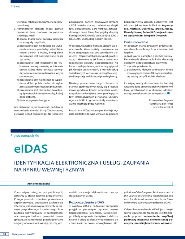 Prawo wieniami ratyfikowanej umowy międzynarodowej. 3. Administrator danych może jednak przekazać dane osobowe do państwa trzeciego, jeżeli: 1) osoba, której dane dotyczą, udzieliła na to zgody na piśmie, 2) przekazanie jest niezbędne do wykonania umowy pomiędzy administratorem danych a osobą, której dane dotyczą lub jest podejmowane na jej życzenie, 3) przekazanie jest niezbędne do wykonania umowy zawartej w interesie osoby, której dane dotyczą, pomiędzy administratorem danych a innym podmiotem, 4) przekazanie jest niezbędne ze względu na dobro publiczne lub do wykazania zasadności roszczeń prawnych, 5) przekazanie jest niezbędne do ochrony żywotnych interesów osoby, której dane dotyczą, 6) dane są ogólnie dostępne. Jak nietrudno wywnioskować, państwem trzecim będą również Stany Zjednoczone, ojczyzna Cloud computingu. Na szczęście powierzanie danych osobowych firmom z USA zostało znacząco ułatwione dzięki tzw. porozumieniu Safe Harbour, zatwierdzonego przez Unię Europejską decyzją Komisji 2000/520/WE z dnia 26 lipca 2000 r. (O.J. L 215, 25.08.2000 s. 0007–0047). bezpieczeństwa danych osobowych jest taki sam jak na terenie Unii, w: Argentynie, Australii, Guernsey, Izraela, Jersey, Kanady, Nowej Zelandii, Szwajcarii, oraz na Wyspie Man, Wyspach Owczych. Podsumowanie W skrócie, wszystkie firmy ze Stanów Zjednoczonych, które zostały umieszone na liście znajdującej się pod poniższym adresem: https://safeharbor.export.gov/list. aspx, traktowane są jak firmy z terenu europejskiego obszaru gospodarczego. Na liście znajdują się oczywiście tacy giganci jak Google czy Microsoft, z których usług świadczonych w chmurze szczególnie często korzystają mali i średni przedsiębiorcy. W obecnym stanie prawnym przetwarzanie danych osobowych w chmurze jest legalne. Jednak warto pamiętać o dwóch niezwykle ważnych elementach, które decydują o naszym bezpieczeństwie prawnym: 1) umowie powierzenia, 2) powierzeniu danych osobowych firmie działającej na terenie UE bądź posiadającej ważny certyfikat Safe Harbour. Niestety, powierzanie danych firmom ze Stanów Zjednoczonych łączy się z jeszcze innym ryzykiem. Chodzi oczywiście o nieuregulowane i niejasne powiązania gigantów informatycznych z National Security Agency (NSA) i ogromną skalę monitorowania internetu przez Agencję. Im więcej mamy do stracenia, im bardziej wrażliwe dane osobowe przetwarzamy, tym lepiej przetwarzać je w chmurze udostępnianej przez dostawców europejskich. ■ Przemysław Zegarek Kancelaria Lex Artist www.lex-artist.pl Poza Stanami Zjednoczonymi Komisja wydała arbitralne decyzje uznając, że poziom Prawo europejskie eIDAS IDENTYFIKACJA ELEKTRONICZNA I USŁUGI ZAUFANIA NA RYNKU WEWNĘTRZNYM Anna Kujaszewska Coraz więcej usług, w tym publicznych, jesteśmy w stanie załatwić przez internet. Z tego powodu, zdaniem prawodawcy wspólnotowego, budowanie zaufania do internetu jest kluczowym elementem rozwoju gospodarczego i społecznego. Brak zaufania spowodowany w szczególności odczuwanym brakiem pewności prawa sprawia, że konsumenci, przedsiębiorstwa i organy administracji wahają się, czy pro- 14 Biuletyn euro info (05) wadzić transakcje elektroniczne i korzystać z nowych usług. Rozporządzenie eIDAS gulation of the European Parliament and of the Council on electronic identification and trust for electronic transactions in the internal market) dalej: Rozporządzenie eIDAS. 3 kwietnia 2014 r. Parlament Europejski przyjął w pierwszym czytaniu projekt Rozporządzenia Parlamentu Europejskiego i Rady w sprawie identyfikacji elektronicznej i usług zaufania w odniesieniu do e-transakcji na rynku wewnętrznym (Re- Celem Rozporządzenia eIDAS jest zwiększenie zaufania do transakcji elektronicznych poprzez zapewnienie wspólnej podstawy interakcji elektronicznej pomiędzy przedsiębiorstwami, obywate- Prawo europejskie lami i organami publicznymi, co pozwoli podnieść skuteczność publicznych i prywatnych usług internetowych, e-biznesu czy handlu elektronicznego w Unii oraz ułatwi korzystanie z usług internetowych o charakterze transgranicznym. Aktualnie obowiązuje Dyrektywa Parlamentu Europejskiego i Rady 1999/93/ WE z dnia 13 grudnia 1999 r. w sprawie wspólnotowych ram z zakresie podpisów elektronicznych (DzU L 13 z 19.01.2000, s. 12), dalej: Dyrektywa 1999/93/WE, która odnosi się przede wszystkim do podpisu elektronicznego. Powyższy akt prawny nie zapewnia szczegółowych ram transgranicznych i międzysektorowych, które pozwoliłyby na bezpieczne, wiarygodne i łatwe do realizacji transakcje elektroniczne. Niedoskonałości Dyrektywy 1999/93/ WE skłoniły prawodawcę wspólnotowego do prac nad nowym aktem prawnym, szerzej regulującym zagadnienia istotne z punktu widzenia użytkowników usług elektronicznych. Rozporządzenie eIDAS zakłada umocnienie i poszerzenie dorobku Dyrektywy 1999/93/WE. Definicje: Identyfikacja elektroniczna – proces używania danych identyfikujących osobę w formie elektronicznej, reprezentujących niepowtarzalnie osobę fizyczną lub prawną, lub osobę fizyczną reprezentującą osobę prawną. Usługa zaufana – sługa elektroniczna zazwyczaj świadczona za wynagrodzenie i obejmująca: a) składanie, weryfikowanie i walidację podpisów elektronicznych, pieczęci elektronicznej lub elektronicznych znaczników czasu, usług potwierdzonych doręczeń elektronicznych oraz certyfikatów powiązanych z tymi usługami lub b) składanie, weryfikację i walidację certyfikatów do celu uwierzytelniania witryn internetowych lub c) konserwację elektronicznych podpisów, pieczęci lub certyfikatów powiązanych z tymi usługami. Kwalifikowana usługa zaufania – usługa zaufania, która spełnia wymogi określone w rozporządzeniu eIDAS. Fot. Bartosz Bartosiński Podkreślenia wymaga też to, że rozporządzenie jest aktem prawnym, który obowiązuje bezpośrednio, bez konieczności transpozycji zawartyc