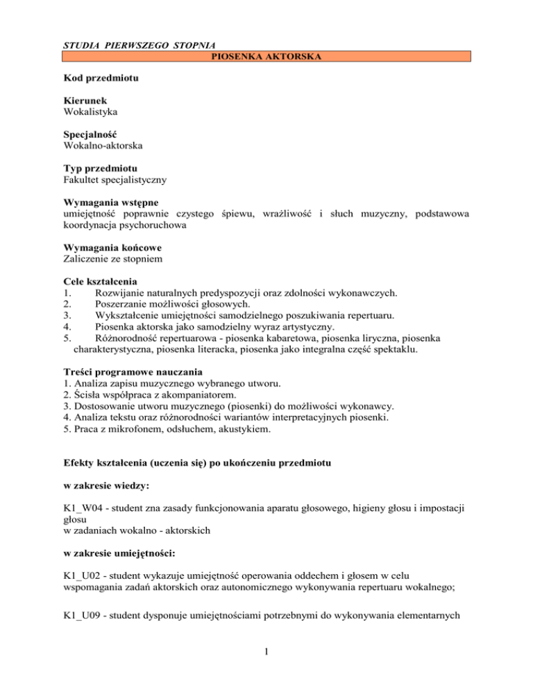 STUDIA PIERWSZEGO STOPNIA PIOSENKA AKTORSKA Kod przedmiotu Kierunek Wokalistyka Specjalność Wokalno-aktorska Typ przedmiotu Fakultet specjalistyczny Wymagania wstępne umiejętność poprawnie czystego śpiewu, wrażliwość i słuch muzyczny, podstawowa koordynacja psychoruchowa Wymagania końcowe Zaliczenie ze stopniem Cele kształcenia 1. Rozwijanie naturalnych predyspozycji oraz zdolności wykonawczych. 2. Poszerzanie możliwości głosowych. 3. Wykształcenie umiejętności samodzielnego poszukiwania repertuaru. 4. Piosenka aktorska jako samodzielny wyraz artystyczny. 5. Różnorodność repertuarowa - piosenka kabaretowa, piosenka liryczna, piosenka charakterystyczna, piosenka literacka, piosenka jako integralna część spektaklu. Treści programowe nauczania 1. Analiza zapisu muzycznego wybranego utworu. 2. Ścisła współpraca z akompaniatorem. 3. Dostosowanie utworu muzycznego (piosenki) do możliwości wykonawcy. 4. Analiza tekstu oraz różnorodności wariantów interpretacyjnych piosenki. 5. Praca z mikrofonem, odsłuchem, akustykiem. Efekty kształcenia (uczenia się) po ukończeniu przedmiotu w zakresie wiedzy: K1_W04 - student zna zasady funkcjonowania aparatu głosowego, higieny głosu i impostacji głosu w zadaniach wokalno - aktorskich w zakresie umiejętności: K1_U02 - student wykazuje umiejętność operowania oddechem i głosem w celu wspomagania zadań aktorskich oraz autonomicznego wykonywania repertuaru wokalnego; K1_U09 - student dysponuje umiejętnościami potrzebnymi do wykonywania elementarnych 1 zadań aktorskich; K1_U11 - student dysponuje umiejętnościami potrzebnymi do prawidłowej dykcji i wymowy scenicznej K1_U15 - student opanował efektywne techniki ćwiczenia, umożliwiające ciągły rozwój poprzez samodzielną pracę; K1_U16 - student jest przygotowany do współdziałania z innymi artystami muzykami, aktorami w różnych zespołach wykonawczych w ramach wspólnych projektów artystycznych; w zakresie kompetencji społecznych: K1_K02 - student posiada umiejętność organizacji pracy własnej i zespołowej w ramach wspólnych projektów i zadań artystycznych K1_K07 - student posiada umiejętność współpracy i integracji podczas realizacji zespołowych działań artystycznych K1_K13 - student w sposób świadomy kontroluje swoje emocje Metody nauczania Zajęcia grupowe , warsztatowe Nakład pracy studenta potrzebny do osiągnięcia efektów uczenia się 1 pkt ECTS = 30 godzin pracy studenta (zajęcia + praca własna) ROK SEMEST R I 1 II 2 3 III 5 6 IV 4 5 6 Punkty ECTS 1 1 Ilość godzin w semestrze 15 15 Rodzaj zaliczenia Zs Zs LEGEND A zal –zaliczony; zs – zaliczenie ze stopniem; egz – egzamin; ed –egzamin dyplomowy Kryteria oceny: Ocena wykonania ćwiczenia w trakcie zajęć, na materiale literackim, zaliczeniowym na koniec : 2 Jasność przekazu, intonacja. Literatura (piśmiennictwo) A. Literatura wymagana do ostatecznego zaliczenia zajęć (zdania egzaminu): A.1. wykorzystywana podczas zajęć ze względu na specyfikę przedmiotu zamiast literatury proponuję nagrania artystów piosenki: Kabaret Starszych Panów: Wasowski, Przybora, Michnikowski, Gołas, Jędrusik, Pawlik, Michnikowski, Krafftówna Ewa Demarczyk Jacques Brel A.2. studiowana samodzielnie przez studenta Mirosław Czyżykiewicz Wojciech Młynarski B. Literatura uzupełniająca Piosenki w wykonaniu laureatów konkursu PPA we Wrocławiu Język wykładowy Polski Imię i nazwisko wykładowcy mgr Mariusz Ostrowski 3