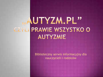 Biblioteczny serwis informacyjny dla nauczycieli i rodziców Jeżeli twoje dziecko ma autyzm oznacza to, iż ma ono pewne problemy w obszarach uspołecznienia, języka oraz zabawy. Autyzm to nie choroba, to upośledzenie lub problem rozwojowy, który rozwiązuje się wraz z wiekiem oraz dzięki pomocy. Nie traktuje się już autyzmu jako rzadko występującego zaburzenia. Obecne badania sugerują, iż mniej więcej jedno dziecko na tysiąc cierpi na autyzm klasyczny a jedno na 250 cierpi na zaburzenia należące do spektrum autystycznego, czyli łagodniejsze formy autyzmu. Wychowywanie dziecka autystycznego nie jest sprawą prostą ani łatwą, ale też jest nie pozbawione wielu radości. Co więcej, ma ono sporo uroków jakich nie znajdziecie nigdzie poza autyzmem. Trudno w to uwierzyć wówczas, gdy trudności nasilają się lub gdy nasze dziecko ma dodatkowe sprzężone schorzenia czy przypadłości. A jednak mimo wszystko to prawda! Osoby borykające się na co dzień z tym problemem potrzebują wiadomości i takiego wsparcia, o jakie nieraz trudno w ich otoczeniu. Z jednej strony spowodowane jest to przez unikalność (choć, nie rzadkość, niestety!) zjawiska jakim jest autyzm dziecięcy. Z drugiej przyczyną jest szczególna nieraz uciążliwość problemów, jakie się wiążą z autyzmem. Czasopisma: Rewalidacja : czasopismo dla nauczycieli i terapeutów - czasopismo dla nauczycieli i terapeutów. Półrocznik wydawany przez Centrum Metodyczne Pomocy Psychologiczno - Pedagogicznej Tematyka czasopisma obejmuje zagadnienia: diagnozy, rozwoju uczniów niepełnosprawnych, oraz małych dzieci z niepełnosprawnością relacjonuje doniesienia z badań krajowych i zagranicznych. Prenumerata od 2002 r. Spisy treści można przeglądać na stronie www.cmppp.edu.pl Szkoła Specjalna - dwumiesięcznik przeznaczony dla nauczycieli, pedagogów specjalnych i wszystkich osób zainteresowanych, porusza zagadnienia związane z niepełnosprawnością oraz praktyką pedagogiczną. Świat Autyzmu - Czasopismo pełnotekstowe wydane od lata 2001 roku, zawiera dodatek "Autyzm: Twój świat autyzmu" Zawiera: adresy ośrodków zajmujących się wspomaganiem osób z autyzmem, pomoce do zajęć z dziećmi autystycznymi, omawia diagnozę i najnowsze doniesienia dotyczące tej choroby. Światło i Cienie czasopismo poruszające tematykę osób niepełnosprawnych wydawane przez Chrześcijańskie Stowarzyszenie Osób Niepełnosprawnych, Ich rodzin i Przyjaciół "Ognisko". Spisy treści i wybrane artykuły można przeglądać na stronie Stowarzyszenia. AXEL BRAUNS „BARWNE CIENIE I NIETOPERZE. ŻYCIE W AUTYSTYCZNYM ŚWIECIE” LUCYNA BOBKOWICZ-LEWARTOWSKA „AUTYZM DZIECIĘCY. ZAGADNIENIA DIAGNOZY I TERAPII” JADWIGA KOMENDER GABRIELA JAGIELSKA ANITA BRYŃSKA „AUTYZM I ZESPÓŁ ASPERGERA” „WYBRANE FORMY TERAPII I REHABILITACJI OSÓB Z AUTYZMEM” POD RED. EWY PISULI DOROTY DANIELEWICZ MATT WINTER „ZESPÓŁ ASPERGERA. CO NAUCZYCIEL WIEDZIEĆ POWINIEN” D.SEACH M.LLOYD M.PRESTON „POMÓŻ DZIECKU Z AUTYZMEM” „AUTYZM I ZESPÓŁ ASPERGERA” POD RED. UTY FRITH LUKE JACKSON „ŚWIRY, DZIWADŁA I ZESPÓŁ ASPERGERA” SERIA : „ŻYĆ Z AUTYZMEM” Gay Waters: „Uczymy się dawać sobie radę z trudnymi zachowaniami” Caroll Yellop: „Uczymy się ubierać” Brenda Hutton: „Uczymy się myć” Jacqui Ashton-Smith, Kathy Crammer: „ Uczymy się jeść i pić” Chris Graham: „ Uczymy się korzystac z toalety” MAŁGORZATA KWIATKOWSKA „DZIECI GŁĘBOKO NIEZROZUMIANE” MARIA PISZCZEK „TERAPIA ZABAWĄ. TERAPIA PRZEZ SZTUKĘ” Bibliografia na temat autyzmu: www.autyzm.pl www.dzieci.org.pl www.cmppp.edu.pl www.synapsis.waw.pl www.dzieci.bci.pl www.zsslubliniec.info W.W „Nadzieja jest twoja twierdzą. Niech twe życie będzie przeniknięte pewnością spełnienia. Bo nadzieja nadaje tchnienie życiu.”