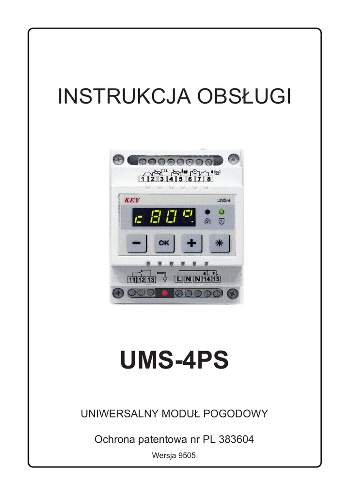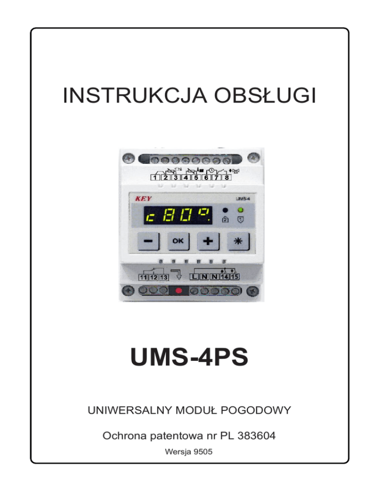 INSTRUKCJA OBSŁUGI UMS-4PS UNIWERSALNY MODUŁ POGODOWY Ochrona patentowa nr PL 383604 Wersja 9505 1. Przeznaczenie. Moduł UMS-4PS jest mikroprocesorowym urządzeniem przeznaczonym do pogodowej regulacji temperatury obiegu ogrzewania CO w instalacjach zasilanych węzłem cieplnym. Wysokość temperatury w obiegu CO utrzymywana jest poprzez sterowanie siłownikiem zaworu mieszającego. Moduł posiada wyjście przeznaczone do sterowania pompą CO wejście, obniżenia temperatury wody instalacyjnej oraz wejście wyłączające ogrzewanie. Konstrukcja urządzenia umożliwia równoległe podłączenie dowolnej liczby modułów UMS/UMP - oznacza to, że do jednego kotła lub węzła można podłączyć niezależnie wiele obiegów centralnego ogrzewania. 2. Podłączenie. Przed włączeniem urządzenia należy podłączyć odpowiednio do gniazd przewody zasilające modułu, siłownika zaworu mieszającego oraz przewody sterujące załączaniem pompy CO. Czujnik temperatury zewnętrznej można podłączyć równolegle do dowolnej liczby modułów UMS/UMP, pamiętając jednak o zwarciu styków odpowiednich styków złącza w jednym z modułów. Każdy moduł UMS-4PS wymaga zastosowania oddzielnego czujnika temperatury wody CO. Przykładowy schemat podłączenia modułu przedstawiony został na rysunku 3. UWAGA! Przed podłączeniem modułu należy sprawdzić poprawność uziemienia w instalacji sieciowej. 3. Obsługa. Płyta czołowa regulatora (rysunek 1) zawiera: 1 - Wyświetlacz. 2 - Kontrolkę pracy siłownika zaworu mieszającego (otwieranie). 3 - Kontrolkę pracy siłownika zaworu mieszającego (zamykanie). 4 - Złącze czujników temperatur i wejść sterujących funkcjami dodatkowymi. 5 - Przycisk (-) wyboru i zmiany parametrów. 6 - Przycisk OK zmiany i zatwierdzania parametrów. 7 - Przycisk (+) wyboru i zmiany parametrów. 8 - Przycisk (*). 9 - Złącze sterujące pompą CO. 10- Kontrolkę załączenia wyjścia sterowania pompą CO. 11 - Złącze zasilania oraz sterujące siłownikiem zaworu mieszającego. 3 Rysunek 1. Widok płyty czołowej modułu UMS-4PS. Obsługa modułu sprowadza się do ustawienia temperatur progowych ZIMA/LATO oraz wartość temperatury obniżenia. Sterowanie siłownikiem zaworu mieszającego i pompą obiegu CO realizowane jest automatycznie w oparciu o ustawione przez instalatora parametry serwisowe oraz zmierzone temperatury. Podczas normalnej pracy, kiedy wyświetlana jest jedna z dwóch temperatur zmierzonych, skrajna prawa kropka wyświetlacza informuje o trybie pracy regulatora: - świecenie kropki oznacza tryb pracy ZIMA. W trybie tym moduł dąży do utrzymania odpowiedniej temperatury w obiegu CO. Wysokość tej temperatury zależy od temperatury panującej na zewnątrz lub uśrednionej temperatury zewnętrznej oraz od zaprogramowanej charakterystyki pogodowej, - brak świecenia kropki oznacza tryb LATO. W trybie tym regulator zamyka zawór mieszający i wyłącza pompę CO. W celu uniknięcia zakleszczenia, pompa włączana jest raz na dobę na czas 1 minuty. Dostęp do parametrów pracy, których ustawienie leży w zakresie obsługi dokonywanej przez użytkownika, możliwy jest za pomocą przycisków oznaczonych +,-. Wykaz wszystkich parametrów zawiera tabela 1. Sposób zmiany poszczególnych wartości zawarty został w opisie parametrów. 4 W tabeli 1 przedstawiono wykaz wszystkich parametrów użytkownika. Pierwsza kolumna zawiera przykładowe wskazania wyświetlacza, następne kolumny: opis parametru, wartość minimalną i maksymalną możliwą do ustawienia oraz skok tej wartości przy ustawianiu, ostatnia kolumna zawiera wartości wstępnie zaprogramowane przez producenta, do których możemy wrócić wybierając serwisową funkcję [Prod]. Tabela 1. Spis parametrów użytkownika. Wyśw. c50° -15° d-10 co C LL10 LH18 E ?? Parametr Temperatura wody w obiegu CO Temperatura zewnętrzna. Wartość obniżenia temperatury wody instalacyjnej. Ręczne przełączanie trybu pracy modułu (ZIMA/LATO). Temperatura progowa ZIMA. Temperatura progowa LATO. Alarmy uszkodzeń czujników temperatury. Min -30 C 0 0 Max Skok 0 30 30 1°C 1°C 1°C Ust. prod. -10 C 10 18 3.1. Temperatura wody w obiegu CO [c50°]. Parametr ten umożliwia podgląd zmierzonej temperatury wody w obiegu CO. Naciśnięcie i przytrzymanie przycisku OK powoduje wyświetlanie przez moduł temperatury zadanej CO (temperatury do uzyskania której dąży regulator). Sygnalizowane jest to świeceniem pierwszej kropki wyświetlacza np. [c.50°]. Jest to podstawowy parametr, do którego regulator powraca automatycznie po 60 sekundach. Oznacza to, że jeśli użytkownik przełączy na np. podgląd temperatury zewnętrznej i przez 60 sekund nie naciśnie żadnego przycisku, regulator przełączy się na wyświetlanie temperatury w obiegu CO. Wyjątek stanowią sytuacje alarmowe. W przypadku ich wystąpienia domyślnie wyświetlany jest rodzaj alarmu. 3.2. Temperatura zewnętrzna [-15°]. Parametr ten wyświetla temperaturę panującą na zewnątrz. Jeśli temperatura zadana wody instalacyjnej wyliczana jest na podstawie średniej temperatury zewnętrznej, to naciśnięcie i przytrzymanie przycisku OK powoduje wyświetlenie przez moduł bieżącej średniej temperatury zewnętrznej np.: [A.-10]. 3.3. Wartość obniżenia temperatury wody instalacyjnej [d-10]. Wartość ustawiona w tym parametrze określa, o ile stopni obniżona zostanie wyliczona z charakterystyki pogodowej temperatura wody instalacyjnej CO w przypadku rozwarcia styków wejścia obniżenia nocnego. W celu zmiany parametru należy, podczas jego wyświetlania, przycisnąć klawisz OK. Regulator przełączy się w tryb edycji, sygnalizowany miganiem cyfr zmienianego parametru. Za pomocą przycisków (+,-) należy ustawić żądaną wielkość temperatury progowej i zatwierdzić ją klawiszem OK. Naciśnięcie przycisku (*) spowoduje anulowanie wprowadzonej zmiany i wyjście z trybu edycji. Anulowanie zmian nastąpi również, jeśli