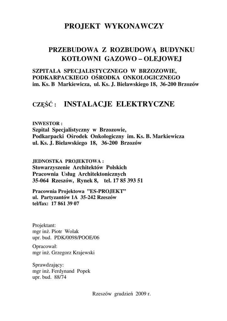 PROJEKT WYKONAWCZY PRZEBUDOWA Z ROZBUDOWĄ BUDYNKU KOTŁOWNI GAZOWO – OLEJOWEJ SZPITALA SPECJALISTYCZNEGO W BRZOZOWIE, PODKARPACKIEGO OŚRODKA ONKOLOGICZNEGO im. Ks. B Markiewicza, ul. Ks. J. Bielawskiego 18, 36-200 Brzozów CZĘŚĆ : INSTALACJE ELEKTRYCZNE INWESTOR : Szpital Specjalistyczny w Brzozowie, Podkarpacki Ośrodek Onkologiczny im. Ks. B. Markiewicza ul. Ks. J. Bielawskiego 18, 36-200 Brzozów JEDNOSTKA PROJEKTOWA : Stowarzyszenie Architektów Polskich Pracownia Usług Architektonicznych 35-064 Rzeszów, Rynek 8, tel. 17 85 393 51 Pracownia Projektowa ”ES-PROJEKT” ul. Partyzantów 1A 35-242 Rzeszów tel/fax: 17 861 39 07 Projektant: mgr inŜ. Piotr Wolak upr. bud. PDK/0098/POOE/06 Opracował: mgr inŜ. Grzegorz Krajewski Sprawdzający: mgr inŜ. Ferdynand Popek upr. bud. 88/74 Rzeszów grudzień 2009 r. ZAWARTOŚĆ OPRACOWANIA I. Opis techniczny 1. Przedmiot opracowania 2. Podstawa opracowania 3. Zakres opracowania 4. Opracowania związane 5. Parametry elektryczne 6. Zasilanie obiektu w energię elektryczna 7. Tablica główna TM 8. Wyłącznik główny p-poŜ 9. Instalacja oświetleniowa 10. Instalacja gniazd wtyczkowych potrzeb ogólnych 11. Instalacja zasilania urządzeń technicznych i technologicznych 12. Instalacja ochrony przeciwprzepięciowej 13. Instalacja dodatkowej ochrony od poraŜeń 14. Instalacja odgromowa i uziemiająca 15. Uwagi końcowe II. Obliczenia techniczne 1. Bilans mocy 2. Parametry elektryczne budynku 3. Dobór przewodów i zabezpieczeń 4. Obliczenia natęŜenia oświetlenia 5. Obliczenia spadkow napięcia 6. Obliczenia skuteczności ochrony przeciwporaŜeniowej III. Rysunki E – 01 Schemat instalacji elektrycznych E – 02 Budowa złącza kablowego i tablicy TM E – 03 Plan instalacji oświetleniowej E – 04 Plan instalacji siłowych i gniazd wtyczkowych E – 05 Plan instalacji odgromowej E – 06 Plan instalacji uziemiającej -2- I. OPIS TECHNICZNY 1. Przedmiot opracowania Przedmiotem opracowania jest projekt wykonawczy instalacji elektrycznych wewnętrznych w dobudowywanym budynku myjni i magazynów w Szpitalu Specjalistycznym w Brzozowie w ramach inwestycji przebudowy z rozbudową budynku kotłowni gazowoolejowej. 2. Podstawa opracowania − − − − umowa zawarta z Inwestorem projekt budynku „Przebudowa z rozbudową budynku kotłowni gazowo-olejowej” uzgodnienia oraz wytyczne branŜowe normy, przepisy oraz literatura techniczna 3. Zakres opracowania Zakres opracowania obejmuje wykonanie: − tablicy rozdzielczej TM − wewnętrznej linii zasilającej WLZ − instalacji oświetleniowej − instalacji gniazd wtyczkowych potrzeb ogólnych − instalacji zasilania urządzeń technicznych i technologicznych − instalacji ochrony przeciwprzepięciowej − instalacji ochrony od poraŜeń prądem elektrycznym − instalacji uziemiającej − instalacji ochrony odgromowej 4. Opracowania związane − PB ”Przebudowa z rozbudową budynku kotłowni gazowo-olejowej” − PW ”Przebudowa linii kablowych przyłączy elektroenergetycznych nn budynku kotłowni. Przebudowa zasilania rozdzielni nn kotłowni i linii kablowych zasilających pompy oleju” 5. Parametry elektryczne Parametry elektryczne dobudowywanego budynku myjni i magazynów: moc zainstalowana Pi [kW] – 21,42 moc szczytowa Ps [kW] – 5,90 współczynnik mocy cosφ [–] – 0,86 prąd szczytowy Is [A] – 9,9 układ sieci TNC-S 6. Zasilanie obiektu w energię elektryczną Istniejący budynek kotłowni zasilany jest z wewnętrznej sieci elektroenergetycznej nn szpitala, z rozdzielnicy głównej NN zlokalizowanej w budynku agregatorowi, dwoma liniami kablowymi typu YAKY-4x120 zasilania podstawowego oraz rezerwowego. Dobudowywany do kotłowni budynek myjni – magazynów zasilany będzie przyłączem elektroenergetycznym budynku kotłowni. -3- W związku z kolizją planowanej dobudowy z istniejącymi liniami kablowymi przyłączy elektroenergetycznych, kable zasilające oraz złącze kablowe naleŜy przebudować. Szczegóły przebudowy linii kablowych zasilających budynek kotłowni podano w ”PW – Przebudowa istniejących linii kablowych zasilających budynek kotłowni. Przebudowa zasilania rozdzielni nn kotłowni i linii kablowych zasilających pompy oleju” Dobudowywany budynek myjni – magazynów naleŜy zasilić z przebudowanego złącza kablowego, z wolnych podstaw bezpiecznikowych, wewnętrzną linią zasilającą YDYŜo-5x10 prowadzoną w rurze instalacyjnej RL-47 pod tynkiem elewacji budynku oraz na ścianach wewnątrz kotłowni. Zabezpieczenie WLZ w złączu kablowym – 40A gL-gG. Szczegóły zasilania podano na schemacie instalacji elektrycznych, na rysunku nr E-01. Lokalizację złącza kablowego oraz trasę prowadzenia wlz pokazano na planie instalacji, na rysunku nr E-04. 7. Tablica główna TM W dobudowywanym budynku myjni – magazynów zaprojektowano tablicę rozdzielczą TM typu XL3-160-6x24 prod. Legrand. Tablicę naleŜy instalować we wnęce ściennej, w pomieszczeniu rozładowczym (06). Wymiary tablicy: 670x1145x140mm. Wymiary wnęki: 620x1100x100 mm. Wysokość montaŜu tablicy TM: 1,8m od jej górnej krawędzi do poziomu posadzki. Tablicę TM naleŜy wyposaŜyć w aparaturę modułową, zabezpieczająca i sterowniczą: wyłącznik główny z wyzwalaczem wzrostowym, ochronniki przeciwprzepięciowe typ 1+2 DehnVentil TNS, zabezpieczenia obwodów odpływowych – wyłączniki nadmiarowe, silnikowe i róŜnicowoprądowe, zasilacz 24VDC obwodu wentylatorów nasad kominowych. Z tablicy rozdzielczej TM naleŜy zasilić wszystkie obwody odpływowe – oświetleniowe, gniazd wtyczkowych potrzeb ogólnych, gniazd siłowych 3-faz 400V, oraz odbiorników technicznych i technologicznych budynku. 8. Wyłącznik główny p-poŜ W obiekcie, dla kaŜdej odrębnej funkcjonalnie jego części tj. kotłowni oraz myjni – magazynów, projektowane są oddzielne wyłączniki główne p-poŜ. W istniejącym budynku kotłowni wyłącznik główny p-poŜ zamontowany jest 