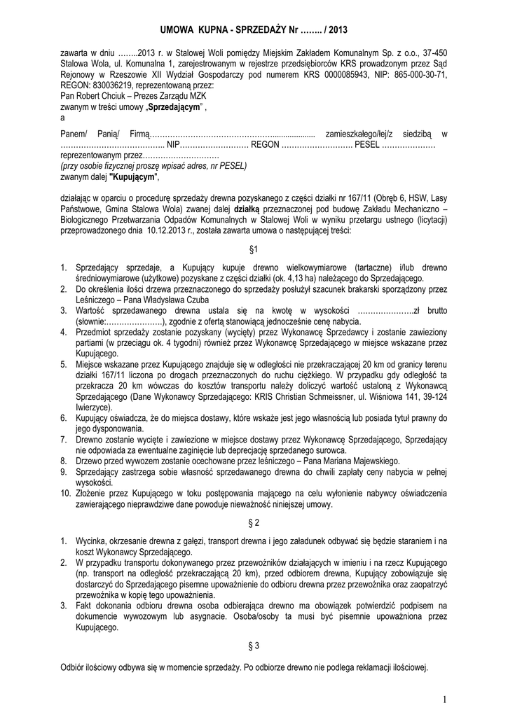 UMOWA KUPNA - SPRZEDAŻY Nr …….. / 2013 zawarta w dniu ……..2013 r. w Stalowej Woli pomiędzy Miejskim Zakładem Komunalnym Sp. z o.o., 37-450 Stalowa Wola, ul. Komunalna 1, zarejestrowanym w rejestrze przedsiębiorców KRS prowadzonym przez Sąd Rejonowy w Rzeszowie XII Wydział Gospodarczy pod numerem KRS 0000085943, NIP: 865-000-30-71, REGON: 830036219, reprezentowaną przez: Pan Robert Chciuk – Prezes Zarządu MZK zwanym w treści umowy „Sprzedającym” , a Panem/ Panią/ Firmą………………………………………….................... zamieszkałego/łej/z siedzibą w ………………………………….. NIP……………………… REGON ………………………. PESEL ………………… reprezentowanym przez………………………… (przy osobie fizycznej proszę wpisać adres, nr PESEL) zwanym dalej "Kupującym", działając w oparciu o procedurę sprzedaży drewna pozyskanego z części działki nr 167/11 (Obręb 6, HSW, Lasy Państwowe, Gmina Stalowa Wola) zwanej dalej działką przeznaczonej pod budowę Zakładu Mechaniczno – Biologicznego Przetwarzania Odpadów Komunalnych w Stalowej Woli w wyniku przetargu ustnego (licytacji) przeprowadzonego dnia 10.12.2013 r., została zawarta umowa o następującej treści: §1 1. Sprzedający sprzedaje, a Kupujący kupuje drewno wielkowymiarowe (tartaczne) i/lub drewno średniowymiarowe (użytkowe) pozyskane z części działki (ok. 4,13 ha) należącego do Sprzedającego. 2. Do określenia ilości drzewa przeznaczonego do sprzedaży posłużył szacunek brakarski sporządzony przez Leśniczego – Pana Władysława Czuba 3. Wartość sprzedawanego drewna ustala się na kwotę w wysokości ………………….zł brutto (słownie:………………….), zgodnie z ofertą stanowiącą jednocześnie cenę nabycia. 4. Przedmiot sprzedaży zostanie pozyskany (wycięty) przez Wykonawcę Sprzedawcy i zostanie zawieziony partiami (w przeciągu ok. 4 tygodni) również przez Wykonawcę Sprzedającego w miejsce wskazane przez Kupującego. 5. Miejsce wskazane przez Kupującego znajduje się w odległości nie przekraczającej 20 km od granicy terenu działki 167/11 liczona po drogach przeznaczonych do ruchu ciężkiego. W przypadku gdy odległość ta przekracza 20 km wówczas do kosztów transportu należy doliczyć wartość ustaloną z Wykonawcą Sprzedającego (Dane Wykonawcy Sprzedającego: KRIS Christian Schmeissner, ul. Wiśniowa 141, 39-124 Iwierzyce). 6. Kupujący oświadcza, że do miejsca dostawy, które wskaże jest jego własnością lub posiada tytuł prawny do jego dysponowania. 7. Drewno zostanie wycięte i zawiezione w miejsce dostawy przez Wykonawcę Sprzedającego, Sprzedający nie odpowiada za ewentualne zaginięcie lub deprecjację sprzedanego surowca. 8. Drzewo przed wywozem zostanie ocechowane przez leśniczego – Pana Mariana Majewskiego. 9. Sprzedający zastrzega sobie własność sprzedawanego drewna do chwili zapłaty ceny nabycia w pełnej wysokości. 10. Złożenie przez Kupującego w toku postępowania mającego na celu wyłonienie nabywcy oświadczenia zawierającego nieprawdziwe dane powoduje nieważność niniejszej umowy. §2 1. Wycinka, okrzesanie drewna z gałęzi, transport drewna i jego załadunek odbywać się będzie staraniem i na koszt Wykonawcy Sprzedającego. 2. W przypadku transportu dokonywanego przez przewoźników działających w imieniu i na rzecz Kupującego (np. transport na odległość przekraczającą 20 km), przed odbiorem drewna, Kupujący zobowiązuje się dostarczyć do Sprzedającego pisemne upoważnienie do odbioru drewna przez przewoźnika oraz zaopatrzyć przewoźnika w kopię tego upoważnienia. 3. Fakt dokonania odbioru drewna osoba odbierająca drewno ma obowiązek potwierdzić podpisem na dokumencie wywozowym lub asygnacie. Osoba/osoby ta musi być pisemnie upoważniona przez Kupującego. §3 Odbiór ilościowy odbywa się w momencie sprzedaży. Po odbiorze drewno nie podlega reklamacji ilościowej. 1 §4 Wszelkie koszty związane z realizacją postanowień niniejszej umowy obciążają Kupującego. §5 W sprawach nieuregulowanych niniejszą umową mają zastosowanie przepisy Kodeksu Cywilnego. §6 Wszystkie spory mogące wyniknąć przy realizacji niniejszej umowy będą rozpatrywane przez sąd właściwy dla miejsca siedziby Sprzedającego. §7 Niniejsza umowa sporządzona została w 2-ch jednobrzmiących egzemplarzach, po jednym egzemplarzu dla Kupującego i Sprzedającego. SPRZEDAJĄCY: KUPUJĄCY : …………………………………… …………………………………….. 2