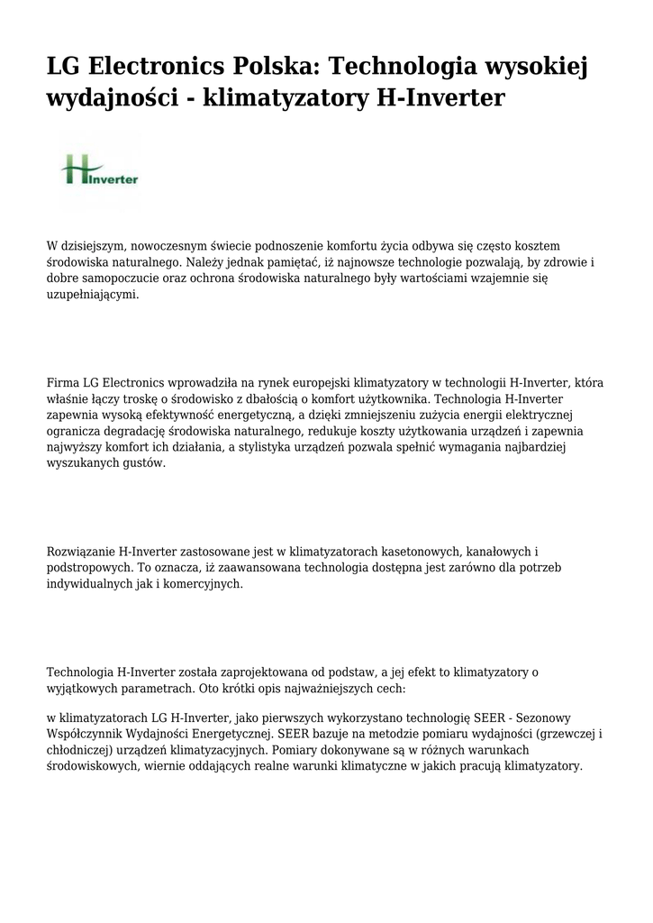 LG Electronics Polska: Technologia wysokiej wydajności - klimatyzatory H-Inverter W dzisiejszym, nowoczesnym świecie podnoszenie komfortu życia odbywa się często kosztem środowiska naturalnego. Należy jednak pamiętać, iż najnowsze technologie pozwalają, by zdrowie i dobre samopoczucie oraz ochrona środowiska naturalnego były wartościami wzajemnie się uzupełniającymi. Firma LG Electronics wprowadziła na rynek europejski klimatyzatory w technologii H-Inverter, która właśnie łączy troskę o środowisko z dbałością o komfort użytkownika. Technologia H-Inverter zapewnia wysoką efektywność energetyczną, a dzięki zmniejszeniu zużycia energii elektrycznej ogranicza degradację środowiska naturalnego, redukuje koszty użytkowania urządzeń i zapewnia najwyższy komfort ich działania, a stylistyka urządzeń pozwala spełnić wymagania najbardziej wyszukanych gustów. Rozwiązanie H-Inverter zastosowane jest w klimatyzatorach kasetonowych, kanałowych i podstropowych. To oznacza, iż zaawansowana technologia dostępna jest zarówno dla potrzeb indywidualnych jak i komercyjnych. Technologia H-Inverter została zaprojektowana od podstaw, a jej efekt to klimatyzatory o wyjątkowych parametrach. Oto krótki opis najważniejszych cech: w klimatyzatorach LG H-Inverter, jako pierwszych wykorzystano technologię SEER - Sezonowy Współczynnik Wydajności Energetycznej. SEER bazuje na metodzie pomiaru wydajności (grzewczej i chłodniczej) urządzeń klimatyzacyjnych. Pomiary dokonywane są w różnych warunkach środowiskowych, wiernie oddających realne warunki klimatyczne w jakich pracują klimatyzatory. Klimatyzatory LG z technologią H-Inverter charakteryzują się jednym z najwyższych na świecie wartości współczynników COP i EER. Dzięki specjalnej konstrukcji silnika wentylatora BLDC i sprężarki BLDC, klimatyzatory LG w trybie grzania osiągają współczynnik COP o wartości 4,46! Klimatyzatory inwerterowe LG wyposażone są w sprężarkę napędzaną bezszczotkowym silnikiem prądu stałego (BLDC), w którym zastosowano silne magnesy neodymowe. Dzięki temu jego wydajność jest znacznie wyższa w porównaniu z klimatyzatorem inwerterowym na prąd zmienny. Wentylator z silnikiem prądu stałego również zapewnia oszczędność energii. W porównaniu z silnikiem zasilanym prądem zmiennym, silnik BLDC może zaoszczędzić do 35% energii przy pełnej prędkości. Kolejną ważną zaletą klimatyzatorów LG H-Inverter jest zdolność do utrzymania stałej wydajności grzewczej w niskich temperaturach. Do temperatury otoczenia -7oC, wydajność grzewcza utrzymana jest na poziomie 100%. Dodatkowo, klimatyzatory LG H-Inverter uzyskują zadaną temperaturę w czasie krótszym o 44% w porównaniu z urządzeniami konwencjonalnymi, dzięki zastosowaniu ”Control PI”, która dostosowuje wydajność klimatyzatora do ustawionej temperatury i trybu pracy. Ponadto, w klimatyzatorach LG H-Inverter istnieje możliwość ograniczenia poziomu hałasu w nocy, poprzez zmniejszenie obrotów wentylatora w jednostce zewnętrznej. Pozwala to utrzymać komfortowe warunki odpoczynku. Klimatyzatory LG z technologią H-Inverter sprawnie funkcjonują w trybie grzania do temperatury zewnętrznej -18°C. Sprężarka inwerterowa BLDC i silnik BLDC wentylatora jednostki zewnętrznej dostosowują swoje obroty do odpowiedniego trybu pracy i warunków temperaturowych. Klimatyzatory LG H-Inverter oferowane są w zakresie wydajności chłodniczej od 3,5 kW do 7,0 kW w wersji 1-fazowej oraz od 10,0 kW do 13,4 kW w wersji 3-fazowej. Jednostki zewnętrzne w zależności od wydajności są jedno lub dwu-wentylatorowe. Jednostki wewnętrzne kasetonowe mają estetyczny wygląd a przez to mogą być przeznaczone dla zastosowań komercyjnych, np. w restauracji, hotelach, biurach czy salach konferencyjnych. Wyposażone są w szereg użytecznych funkcji: posiadają cztery żaluzje do bezpośredniego przepływu powietrza we wszystkich kierunkach jednocześnie z obniżonym poziomem hałasu oraz możliwością sterowania każdej z żaluzji niezależnie, dzięki zastosowaniu indywidualnych silników. Specjalnie opracowany algorytm regulacji wydajności powietrza dla wentylatora jednostki wewnętrznej, umożliwia kontrolę ilości nawiewanego powietrza w wysokich pomieszczeniach nawet do 4,2 m. Nowy kształt wylotu redukuje zanieczyszczenie powstałe na suficie na skutek ruchu powietrza, a pięciostopniowa regulacja kąta nawiewu (od 20° do 70°) każdej z czterech żaluzji pozwala perfekcyjnie skierować strumień powietrza w dowolnym kierunku. Kanałowe jednostki wewnętrzne pozwalają na pełne ich zabudowanie w przestrzeni sufitowej, dzięki czemu doskonale nadają się do budynków, w których znajduje się wiele pomieszczeń lub hal, w tym restauracje, biura, sale koncertowe i hotele. Instalacja takiej jednostki jest niezależna od rozmieszczenia opraw oświetlenia czy struktury pomieszczeń. Jednostki wewnętrzne kanałowe H-Inverter, podobnie jak jednostki kasetonowe mają wbudowaną pompkę skroplin, która automatycznie usuwa skropliny podnosząc je na wysokość 700 mm. Z kolei zastosowana w klimatyzatorach kanałowych technologia E.S.P, czyli liniowa kontrola sprężu dyspozycyjnego wentylatora, pozwala na utrzymanie na tym samym poziomie ilości nawiewanego powietrza do pomieszczenia przy niskim poziomie hałasu, pomimo zmian zewnętrznego ciśnienia statycznego. Natomiast podstropowe jednostki wewnętrzne dają dużą swobodę w wyborze miejsca ich montażu. Poprzez możliwość sterowania nawiewem powietrza nadają się np. do sklepów i biur. Jednostki podstropowe, w przeciwieństwie do kasetonowych i kanałowych sterowane są za pomocą bezprzewodowego sterownika. Przy zastosowaniu sterownika przewodowego istnieje możliwość kontroli temperatury pomieszczenia za pomocą dwóch czujników. Zwykle temperatura mierzona czujnikiem zainstalowanym w jednostce wewnętrznej różni się od t