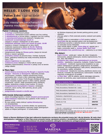 HELLO, I LOVE YOU Pakiet 3 dni – już od 500zł Luty miesiącem zakochanych? Marena miejscem idealnym! Pakiet 3-dniowy zawiera: 2 noclegi w komfortowym pokoju 2 śniadania z elementami kuchni wellness oraz live cooking 1 obiadokolację w formie bufetu z napojami oraz live cooking 1 romantyczną kolację przy świecach z lampką wina możliwość wcześniejszego check-in |zapytaj w recepcji o dostępność na dany dzień| możliwość późnego check-out nawet do godz. 16:00 |zapytaj w recepcji o dostępność na dany dzień| możliwość wypożyczenia kijków do Nordic Walking możliwość korzystania z tenisa stołowego, bilarda oraz piłkarzyków nieograniczony dostęp do fitness parku |stacje do ćwiczeń fitness w naszym ogrodzie| powitalny zestaw do parzenia kawy i herbaty |budynek Perła|, galanterię hotelową oraz wodę mineralną |budynek Perła i Fala| płaszcz kąpielowy na czas pobytu codzienna prasa dostępna w Vento Cafe & Lounge bezpłatny bezprzewodowy Internet w pokoju oraz na terenie całego obiektu w Mare Spa: masaż świecą aromatyczną Ma Bougie o zapachu Fruits Rouges - Owoców w Szampanie. Naturalne aromaty otrzymywane z kwiatów i olejków południowej Francji wprowadzą ciało i umysł w stan cudownego odprężenia. Esencje zawarte w świecy Fruits Rouges działają jak afrodyzjak. Słodki, wyrazisty zapach wprawi w dobry nastrój, pobudzi zmysłowość, rozluźni. Olejki pozostawią skórę nawilżoną, gładką i aksamitną w dotyku [czas trwania: 25 minut] nieograniczone korzystanie z basenu z atrakcjami wodnymi, sauny suchej, łaźni parowej, jacuzzi, groty aromatycznej podgrzewane leżanki w strefie Aqua Informacje dotyczące pobytu: pakiet nie podlega łączeniu z innymi akcjami promocyjnymi doba hotelowa rozpoczyna się o godzinie 14.00 i kończy o godzinie 11.00 do ceny pobytu należy doliczyć opłatę klimatyczną: 1,8 zł/osoba/doba parking dozorowany na terenie obiektu ma ograniczoną liczbę miejsc, nie prowadzimy rezerwacji miejsc parkingowych opłata za miejsce parkingowe: 12 zł/auto/doba do Państwa dyspozycji jest również parking gminny przed obiektem planując pobyt w Perle zwierzaki prosimy zostawić pod opieką w domu planując pobyt ze zwierzakiem w Fali prosimy zadbać o zwierzaka tak aby pozostali goście czuli się bezpiecznie i komfortowo (prosimy o zabranie smyczy oraz kagańca): opłata za zwierzaka wynosi 30zł/doba masz ochotę zagrać w golfa: www.abgc.pl, zapytaj nas o hasło a otrzymasz rabat w „Amber Baltic Golf Club” potrzebujesz taxi, poinformuj nas – załatwimy to za Ciebie Dla dzieci: Kącik Urwisa - pokój gier i zabaw dla dzieci |książeczki, kolorowanki, zabawki edukacyjne, ścianka wspinaczkowa, Foxbox, Xbox 360 KINECT| przyjazny plac zabaw dla najmłodszych na terenie obiektu - zjeżdżalnie, trampolina, huśtawki, Chatka Puchatka w pokojach - możliwość wypożyczenia bezpłatnie na czas pobytu następujących sprzętów: podgrzewaczy do butelek, wanienek, mat antypoślizgowych, baby-phone, zabezpieczenia do narożników, szafek, kontaktów w restauracji - bezpieczne naczynia, plastikowe sztućce oraz śliniaczki, krzesełka dla najmłodszych, kolorowanki i kredki dla maluchów oczekujących na posiłek w Mare Spa - piłki do zabawy, pianki ułatwiające pływanie, pływaki na ramionka, pasy wypornościowe (kamizelki| Pokoje w budynku Perła Cena od osoby Pokój dwuosobowy Standard |ok. 17m kw.| 500 zł ** Pokój dwuosobowy Standard dla 1 osoby 625 zł Pokój dwuosobowy Apartament 605 zł ** |ok. 35m kw.| Pokój dwuosobowy Apartament De Lux Dostawka w Apartamencie |ok. 35m kw.| |osoby powyżej 12 roku życia| 635 zł ** 440 zł Dziecko w wieku 4-12 lat 205 zł Dziecko do 4 lat GRATIS! Łóżeczko GRATIS! ** Cena dla 1 osoby/pakiet przy rezerwacji pokoju dla 2 pełnopłatnych osób. Podane ceny są cenami brutto. Marena Wellness & Spa zastrzega sobie prawo do zmiany cen oraz planu pakietu. Pakiet obowiązuje w terminie od 01.02.2017 do 28.02.2017. Oferta tylko dla Gości indywidualnych. Pobyt w Marena Wellness & Spa jest całkowicie bezpieczny zarówno dla przyszłej mamy jak i dla jej dziecka. W razie chęci skorzystania z zabiegów w Mare Spa przez przyszłą mamę, uprzejmie prosimy o przedłożenie zaświadczenia lekarskiego o braku przeciwwskazań do przeprowadzenia zabiegów kosmetyczno-pielęgnacyjnych.