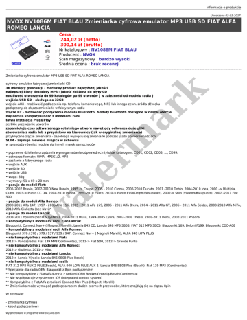 Informacje o produkcie Utworzono 03-03-2017 NVOX NV1086M FIAT BLAU Zmieniarka cyfrowa emulator MP3 USB SD FIAT ALFA ROMEO LANCIA Cena : 244,02 zł (netto) 300,14 zł (brutto) Nr katalogowy : NV1086M FIAT BLAU Producent : NVOX Stan magazynowy : bardzo wysoki Średnia ocena : brak recenzji Zmieniarka cyfrowa emulator MP3 USB SD FIAT ALFA ROMEO LANCIA er m ar k cyfrowy emulator fabrycznej zmieniarki CD 36 miesięcy gwarancji - markowy produkt najwyższej jakości najlepszej klasy dekodery MP3 - jakość zbliżona do płyty CD możliwość utworzenia do 99 katalogów po 99 utworów ( w zależności od modelu radia ) wejście USB SD - obsługa do 32GB wejście AUX - możliwość podłączenia np. telefonu komórkowego, MP3 lub innego zewn. źródła dźwięku podłączany do złącza zmieniarki w fabrycznym radiu złącze BT - możliwość podłączenia modułu Bluetooth. Moduły bluetooth dostępne w naszej ofercie najszersza kompatybilność z modelami radii łatwa instalacja Plug&Play szybkie przewijanie utworów zapamiętuje czas odtwarzanego ostatniego utworu nawet gdy odtwarza duże pliki sterowanie z radia lub z przycisków na kierownicy (jak w oryginalnej zmieniarce) przykręcane złącze zmieniarki - zapobiega wypięciu się zmieniarki podczas jazdy po nierównościach SLIM - zajmuje niewiele miejsca w schowku w sprzedaży również modele do innych marek samochodów w at • poprawne działanie urządzenia wymaga nadania odpowiednich tytułów katalogom: CD01, CD02, CD03, ..., CD99. • odtwarza formaty: WMA, MPEG1/2, MP3 • zasilanie z fabrycznego radia • wejście AUX • wejście SD • wejście USB • waga: 85g • wymiary: 91 x 69 x 20 mm • pasuje do modeli Fiat: 2005-2007 Bravio, 2007-2010 New Bravio, 1995 -> Coupe, 2005 - 2010 Croma, 2006-2010 Ducato, 2001 -2010 Doblo, 2004-2010 Idea, 2000 -> Multipla, Qubo, 2003-> Punto CC DA, 2004-2010 Panda, 1999–2010 Punto, 2010-> Punto EVO(Delphi/Blaupunkt), 2002-> Stilo (Visteon/Blaupunkt), 2007 -2011 Fiat 500 • pasuje do modeli Alfa Romeo: 2000-2011 Alfa 147, 1997 - 2005 Alfa 156, 2005 - 2011 Alfa 159, 2005 - 2011 Alfa Brera, 2004 - 2011 Alfa GT, 2006 - 2011 Alfa Spider, 2008-2010 Alfa MiTo, 2010 Alfa Giulietta (bez Navi)* • pasuje do modeli Lancia: 2003-2011 Ypsilon (bez ICS system), 2004-2011 Musa, 1999-2005 Lybra, 2002-2008 Thesis, 2008-2011 Delta, 2002-2011 Phedra • kompatybilny z modelami radii Fiat/Lancia: Blaupunkt, Connect Nav+ ( Magneti Marelli), Lancia 843 CD, Lancia 848 MP3 SB03, FIAT 312 MP3 SB05, Blaupunkt 169, Delphi F199, Blaupunkt CDC-A08 • kompatybilny z modelami radii Alfa Romeo: Blaupunkt 376 / 378 / 379 / 937 / 939 / 947, Connect Nav+ ( Magneti Marelli), ALFA 940 LOW PLUS • nie kompatybilne z modelami Fiat: 2012-> Panda(radio: Fiat 139 MP3 Continental), 2012-> Fiat 500, 2012-> Grande Punto • nie kompatybilne z modelami Alfa Romeo: 2012-> Giulietta, 2011-> Mito, • nie kompatybilne z modelami Lancia: 2012-> Lancia Y(radio: Lancia 846 SB08 Plus Bosch) • nie kompatybilne z modelami radii: FIAT 312 MP3 AUX 2 PLUS(Bosch), ALFA 940 LOW PLUS AUX 2, Lancia 846 SB08 Plus (Bosch), Fiat 139 MP3 (Continental), * Specjalnie dla radia OEM Blaupunkt z 8pin podłączeniem ** Nie kompatybilne z Fiat/Alfa/Lancia z radiami OEM Becker/Grundig/Bosch/Continental ** Nie współpracuje z systemem ICS (integrated control system) ** Kompatybilne z Fiat/Alfa z radiami Connect Nav Plus (Magneti Marelli) ** Zmieniarka może wymagać podpięcia razem dwóch czarnych przewodów, które znajdują się na złączu 8pin W zestawie: - zmieniarka cyfrowa - kabel podłączeniowy Wygenerowano w programie www.oscGold.com w at er m ar k - instrukcja obsługi - kabel AUX - gwarancja 36 miesięcy - paragon lub Faktura VAT