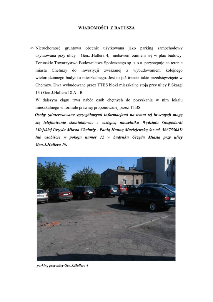 WIADOMOŚCI Z RATUSZA • Nieruchomość gruntowa usytuowana przy ulicy obecnie uŜytkowana jako parking samochodowy Gen.J.Hallera 4, niebawem zamieni się w plac budowy. Toruńskie Towarzystwo Budownictwa Społecznego sp. z o.o. przystępuje na terenie miasta ChełmŜy do inwestycji związanej z wybudowaniem kolejnego wielorodzinnego budynku mieszkalnego. Jest to juŜ trzecie takie przedsięwzięcie w ChełmŜy. Dwa wybudowane przez TTBS bloki mieszkalne stoją przy ulicy P.Skargi 13 i Gen.J.Hallera 18 A i B. W dalszym ciągu trwa nabór osób chętnych do pozyskania w nim lokalu mieszkalnego w formule prawnej proponowanej przez TTBS. Osoby zainteresowane szczegółowymi informacjami na temat tej inwestycji mogą się telefonicznie skontaktować z zastępcą naczelnika Wydziału Gospodarki Miejskiej Urzędu Miasta ChełmŜy - Panią Hanną Maciejewską /nr tel. 566753085/ lub osobiście w pokoju numer 12 w budynku Urzędu Miasta przy ulicy Gen.J.Hallera 19. parking przy ulicy Gen.J.Hallera 4 2 • Kolejna inwestycja drogowa zakończona: Dobiegła końca realizacja II etapu projektu pn. „Budowa dróg publicznych w ChełmŜy: etap I – budowa ul. Kościuszki w ChełmŜy na odcinku od Lecznicy Zwierząt do granicy miasta oraz etap II – Rewitalizacja strefy śródmiejskiej ChełmŜy w części zlokalizowanej przy Jeziorze ChełmŜyńskim od ul. Tumskiej do ul. Toruńskiej – etap III: modernizacja ul. Tumskiej” obejmującego kompleksową modernizację ulicy Tumskiej. W ramach przedmiotowej inwestycji wykonana została całkowicie nowa nawierzchnia z kostki kamiennej oraz kostki klinkierowej w kolorze czerwonym. Modernizacji nawierzchni towarzyszyła rozbudowa kanalizacji deszczowej oraz wymiana oświetlenia ulicznego. Nowo zamontowane stylowe lampy oświetleniowe podkreślają zabytkowy charakter tej części miasta. Pierwszy etap inwestycji, zakończony w październiku 2009 roku, obejmował wybudowanie odcinka ulicy Kościuszki o nawierzchni bitumicznej prowadzącego do granicy miasta, w kierunku miejscowości StruŜal. Projekt zrealizowano dzięki wsparciu z Europejskiego Funduszu Rozwoju Regionalnego w ramach Działania 1.1. Infrastruktura drogowa Regionalnego Programu Operacyjnego Województwa Kujawsko-Pomorskiego na lata 2007-2013. Dofinansowanie w kwocie 787 719,66 zł stanowi połowę wszystkich wydatków kwalifikujących się do wsparcia ze środków funduszy strukturalnych Unii Europejskiej. Całkowita wartość inwestycji wyniosła 1 634 034,97 zł. W wyniku realizacji powyŜszego projektu nastąpiła poprawa stanu technicznego infrastruktury drogowej oraz bezpieczeństwa w ruchu drogowym na terenie miasta. Modernizacja ulicy Tumskiej wpłynęła równieŜ zdecydowanie na podniesienie wartości estetycznej śródmiejskiej części ChełmŜy. 3 FOTOGRAFIE ZMODERNIZOWANEJ ULICY TUMSKIEJ: 4 5 • Informacja - gdzie ubiegać się o paszport. Organem wydającym paszport dla mieszkańców ChełmŜy jest Wojewoda Kujawsko-Pomorski Biuro Paszportowe znajduje się w Urzędzie Marszałkowskim, Toruń, Pl. Teatralny 2: - przyjmowanie wniosków - pokój 122, 123, - wydawanie paszportów - pokój 123, - godziny urzędowania: pon., śr., czw. i pt.: 7.30-15.30, wt.: 8.00-18.00 - godziny obsługi klienta: pon., czw. i pt.: 8.00 - 15.00 wtorek 8.00 - 17.45 środa 10.00 - 15.00 Szczegółowe informacje moŜna uzyskać pod nr telefonu - 56 62 18 517 lub 56 62 18 479. Druk wniosku o wydanie paszportu dostępny jest w Wydziale Spraw Społecznych i Obywatelskich Urzędu Miasta ChełmŜy, pok. Nr 13. • X Jubileuszowy Półmaraton ChełmŜyński. Rozgrywany od dziesięciu lat Półmaraton o Puchar Burmistrza Miasta ChełmŜy cieszy się coraz większym uznaniem. Jubileuszowy bieg, który odbył się 28 kwietnia ukończyło 250 zawodników. Jako pierwsi wystartowali niepełnosprawni na wózkach. W tej kategorii najlepszym okazał się Wiesław Matejuk (0:54:58) wyprzedzając Przemysława Kowalskiego (0:56:49) oraz Andrzeja Hryniewicza (1:01:56) wszyscy reprezentowali IKS „Smolk” Lotos, Apoteks Orneta. Pierwsze miejsce w kategorii generalnej biegu zajął Mariusz Pawłowski z Kurzętnika reprezentujący klub „Biegam Bo Lubię” z czasem 1:17:31, drugi na mecie był Artur Kamiński TKKF Płock z rezultatem 1:18:03, trzecie miejsce wywalczył Grzegorz Maczyński biegnący w barwach „Kolejarza” Bydgoszcz uzyskując czas 1:18:47. Wśród kobiet pierwsze miejsce zajęła Dorota Pawłowska z Kurzętnika z czasem 1:29:34, za nią sklasyfikowano Ewę Kowalską (1:43:28) oraz Dagmarę Wróblewską (1:48:14). 6 Półmaraton zyskuje równieŜ popularność wśród mieszkańców ChełmŜy gdyŜ aŜ, czternastu mieszkańców naszego miasta stanęło do zawodów. Pierwsze miejsce wśród chełmŜan zajął Piotr Olchawa uzyskując rezultat 1:27:11, dało mu to dziewiątą lokatę w ogólnej klasyfikacji biegu. Kolejnym chełmŜaninem na mecie był Piotr Ernest, który uzyskał czas 1:29:12. Trzecie miejsce zajął Wiesław Budziak reprezentujący Polski Związek Wędkarski w ChełmŜy uzyskując czas 1:45:35. Oprócz biegów dorosłych na Bulwarze rywalizowali uczniowie szkół podstawowych. Najlepszym biegaczom Burmistrz Miasta ufundował atrakcyjne nagrody. • Międzynarodowy wyścig kolarski W dniu 27 kwietnia 2012 r. ChełmŜa gościła najlepszych kolarzy w kategorii juniorów. Nasze miasto było na trasie przejazdu II etapu XXIV Międzynarodowego Wyścigu Kolarskiego Juniorów, a zarazem XXV Memoriału Lecha Cergowskiego. Start i meta zawodów była zlokalizowana na chełmŜyńskim Rynku. Juniorzy mieli do pokonania 5 pętli wokół jeziora, w sumie 105 km. Przez ChełmŜę przejeŜdŜali kolarze z 15 krajów m.in. z Belgii, Ukrainy, Białorusi, Litwy, Izraela, Węgier, Niemiec i Szwecji. Główne zmagania juniorów poprzedziły wyścigi kolarskie dziewcząt i chłopców, w których bardzo dobrze zaprezentowała się chełmŜyńska grupa kolarzy. Najlepszy był Adrian Walecki, który zajął