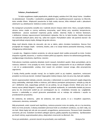Felieton „Przechodzenie”. To było wyjątkowo ciepłe popołudnie, około drugiej, autobus linii 156, dosyć luźno. Usiadłam na plastykowym krzesełku i swobodnie przyglądałam się współtowarzyszom wyprawy na Sikornik, duże osiedle Gliwic. Większość pasażerów to były osoby starsze, kilka młodych osób z plecakami szkolnymi i ja, obiektywnie- kobieta w wieku średnim. Na następnym przystanku wsiadła ona i wybrała akurat miejsce obok mnie. Stara, szczupła kobieta, ubrana mimo ciepła w czarną wełnianą marynarkę, spod której przy wysokiej temperaturze, dodatkowo jeszcze wystawał rozpinany gruby sweter, dawniej chyba w kolorze beżowym, z delikatnie mówiąc zapuszczonymi końcówkami rękawów. Nie to, że była brudna. Szybka lustracja nie wykazała żadnych plam, dziur itp., tylko ten zapach. Pomyślałam sobie- tak pachnie starość i do tego potrzebuje więcej ciepła, dlatego tak grubo ubrana. Moja myśl dotarła chyba do staruszki, ale nie w takim, jakim chciałam kontekście. Starsza Pani przylgnęła do mojego ciepła - ramienia, biodra, uda a na swoje kolana postawiła kolorową, troszkę sfatygowaną reklamówkę. I zaczęło się... Najpierw miałam wrażenie, że cały jej zapach dość szybko przeszedł na mnie. Czułam drapanie w gardle, duszenie, a nozdrza miałam pełne jej zapachu: dawno nie odświeżanej garderoby, zawilgoconego mieszkania, stęchlizny- starości. Pobrudzone mankiety sweterka dotykały moich nowych, bielutkich spodni. Boże pomyślałam, jak te roztocza, bakterie i inne przejdą na mnie. Dziwne napięcie umiejscowiło mi się w okolicach żołądka i coś mi w podpowiadało: uciekaj, choć nawet nie umiałam nazwać wroga, albo przynajmniej zagrożenia. Z każdą chwilą panika zaczęła rosnąć, bo co będzie jeżeli za jej ciepłem, zapachem, roztoczami przejdzie na mnie jej starość. Uciekać! Zająć gdzie indziej miejsce, byle nie przy niej, byle jak najdalej. Zanim wypracowałam taktykę ucieczki, staruszka z reklamówki na swoich kolanach wyjęła elegancką dużą czekoladkę, odwinęła złotko w kolorze, jeśli dobrze pamiętam pistacjowym, włożyła ją całą do ust i delikatnie żuła, wypychając policzki raz po jednej, raz po drugiej stronie. Miała przy tym na twarzy wyraz jakiejś błogości i spokoju. Mnie się jednak wydawało, że czekoladka dodała jej jeszcze parę lat, bo zmarszczki wokół jej ust zaciskających się na smakołyku mnożyły się i pogłębiały. Jeszcze z czekoladką w ustach grzecznie powiedziała coś w rodzaju do widzenia i wyszła na przedostatnim przystanku. Do widzenia, do widzenia, jakie do widzenia, tak sobie poszła. A co z brzydkim zapachem, roztoczami, starością- zostawiła! Mój przystanek, wiatr rozwiał woń stęchlizny, roztocza przecież mnie nie zjedzą, ale co z tą starością, która na mnie przeszła. Z obawą stawiałam pierwsze kroki za schodkami autobusu, czy dam radę, czy nie boli. Może będę tak szła jak ona powoli, przygarbiona, pomarszczona. Pierwsze kroki stawiałam ostrożnie, jak ona. Szukałam wzrokiem jakiegoś oparcia, gdyby pojawiły się problemy. Spróbowałam po chwili raźniej, wyprostowałam plecy, obejrzałam zmarszczki na dłoniach. Nic. Teraz już wiedziałam.. przecież starość nie przechodzi, ona nadchodzi. Grażyna Żur