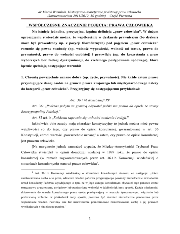 dr Marek Wasiński, Historyczno-teoretyczne podstawy praw człowieka (konwersatorium 2011/2012, 30 godzin) – Część Pierwsza WSPÓŁCZESNE ZNACZENIE POJĘCIA: PRAWA CZŁOWIEKA Nie istnieje jednolita, precyzyjna, legalna definicja „praw człowieka”. W dużym uproszczeniu stwierdzić można, że współcześnie w dyskursie prawniczym (bo dyskurs może być prowadzony np. z pozycji filozoficznych) pod pojęciem „praw człowieka” rozumie się pewne swobody (np. wolność wypowiedzi, wolność od tortur, prawo do prywatności, prawo do wolności osobistej) i przywileje (np. do korzystania z praw wyborczych bez żadnej dyskryminacji, do rzetelnego postępowania sądowego), które łącznie spełniają następujące warunki: 1. Chronią powszechnie uznane dobra (np. życie, prywatność). Nie każde zatem prawo przysługujące danej osobie na gruncie prawa krajowego lub międzynarodowego należy do kategorii „praw człowieka”. Przyjrzyjmy się następującemu przykładowi: Art. 36 i 76 Konstytucji RP Art. 36: „Podczas pobytu za granicą obywatel polski ma prawo do opieki ze strony Rzeczypospolitej Polskiej.” Art. 53 ust.1: „Każdemu zapewnia się wolności sumienia i religii.” Jakkolwiek obie zasady mają charakter konstytucyjny to jednak można mieć pewne wątpliwości co do tego, czy prawo do opieki konsularnej, gwarantowane w art. 36 Konstytucji, chroni wartość „powszechnie uznaną” a zatem, czy prawo do opieki konsularnej jest prawem człowieka. [Na marginesie jednak zauważyć wypada, że Między-Amerykański Trybunał Praw Człowieka stwierdził w opinii doradczej wydanej w 1999 roku, że prawo do opieki konsularnej (w ramach zagwarantowanych przez art. 36.1.b Konwencji wiedeńskiej o stosunkach konsularnych) stanowi prawo człowieka1. 1 Art. 36.1.b Konwencji wiedeńskiej o stosunkach konsularnych stanowi, co następuje: „Jeżeli zainteresowana osoba o to prosi, właściwe władze państwa przyjmującego powinny niezwłocznie zawiadomić urząd konsularny Państwa wysyłającego o tym, że w jego okręgu konsularnym obywatel tego państwa został tymczasowo aresztowany, uwięziony lub pozbawiony wolności w jakikolwiek inny sposób. Każda wiadomość, skierowania do urzędu konsularnego przez osobę przebywającą w areszcie tymczasowym, więzieniu lub pozbawioną wolności w jakikolwiek inny sposób, powinna być również niezwłocznie przekazana przez wspomniane władze. Powinny one też niezwłocznie poinformować zainteresowaną osobę o jej prawach wynikających z niniejszego punktu.” 1 dr Marek Wasiński, Historyczno-teoretyczne podstawy praw człowieka (konwersatorium 2011/2012, 30 godzin) – Część Pierwsza 2. Zagwarantowane są przez normy prawa pozytywnego, tzn. a) w przypadku prawa krajowego – przez normy obowiązujące na mocy autorytetu władzy, która je ustanowiła (np. konstytucja, ustawy), b) w przypadku prawa międzynarodowego – normy obowiązujące na podstawie zgody zainteresowanych państw (np. umowy międzynarodowe, zwyczaj międzynarodowy). „Normy prawa pozytywnego” (w powyższym znaczeniu) należy przeciwstawić np. normom religijnym i moralnym. Nie można przy tym wykluczyć, że swobody i przywileje chronione przez prawo pozytywne wywodzą się z płaszczyzny religii lub moralności (np. prawo do życia). 3. Związane są z godnością osoby ludzkiej, a zatem mają charakter: a) przyrodzony, tzn. przysługują każdemu wyłącznie z racji bycia człowiekiem. Należy podkreślić, że powszechne uznanie godności każdego człowieka, jest „wynalazkiem” dwudziestowiecznym. Widać to na poniższym przykładzie: Status niewolnika w rzymskim prawie prywatnym „Niewolnik (servus) nie był traktowany jako podmiot, lecz jako przedmiot prawa. Jeżeli właściciel niewolnika zmarł, nawet nie pozostawiając dziedziców, niewolnik nie uzyskiwał wolności. Nie uzyskiwał jej także w przypadku ucieczki (fugitivus). Niewolnik nie mający właściciela był rzeczą niczyją i jako taki mógł być przedmiotem zawłaszczenia (occupatio). Nie mógł zatem niewolnik być właścicielem, ani wierzycielem, ani też być podmiotem w sferze prawa familijnego, nie mógł pozywać, ani być pozywanym. Właściciel maił wobec niewolnika prawo życia i śmierci (ius vitae ac necis). […] Jako istota myśląca (instrumentum vocale – narzędzie mówiące) niewolnik wchodził oczywiście w rozmaite stosunki społeczne, które w odniesieniu do człowieka wolnego traktowano jako stosunki cywilnoprawne, ale z uwagi na brak pełnej zdolności prawnej niewolnika traktowano jej jako stosunki faktyczne. Pozycie niewolnika z niewolnicą, a nawet osobą wolną, nie było uważane za małżeństwo, lecz za stan faktyczny zwany contubernium. Dzieci zrodzone z takiego związku również były niewolnikami i stanowiły własność tego, kto był właścicielem ich matki-niewolnicy”. [W. Rozwadowski, Prawo rzymskie. Zarys wykładu wraz z wyborem źródeł, Wydawnictwo Naukowe PWN, Warszawa 1991, s. 87). 2 dr Marek Wasiński, Historyczno-teoretyczne podstawy praw człowieka (konwersatorium 2011/2012, 30 godzin) – Część Pierwsza Należy zwrócić zatem uwagę, że w świetle rzymskiego prawa prywatnego np. prawo własności i prawo do zawarcia małżeństwa nie miały charakteru przyrodzonego, ale zależały od statusu wolności (status libertatis), który mógł się zmieniać w toku ludzkiego życia. b) niezbywalny, tzn. jednostka nie może się ich ani skutecznie zrzec, ani też nie może własnym zachowaniem wyłączyć się spod ich ochrony. Wyjaśnijmy na następującym przykładzie: Makaratzis v. Grecja (wyrok Europejskiego Trybunału Praw Człowieka. Dostępny na stronie: http://www.echr.coe.int/ECHR/EN/hudoc) Wieczorem dnia 13 września 1995 roku grecka policja podjęła próbę zatrzymania samochodu, który przejechał na czerwonym świetle skrzyżowanie w centrum Aten, w pobliżu ambasady Stanów Zjednoczonych. Kierowca pojazdu nie