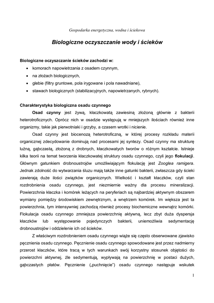 Gospodarka energetyczna, wodna i ściekowa Biologiczne oczyszczanie wody i ścieków Biologiczne oczyszczanie ścieków zachodzi w: komorach napowietrzania z osadem czynnym, na złożach biologicznych, glebie (filtry gruntowe, pola irygowane i pola nawadniane), stawach biologicznych (stabilizacyjnych, napowietrzanych, rybnych). Charakterystyka biologiczna osadu czynnego Osad czynny jest żywą, kłaczkowatą zawiesiną złożoną głównie z bakterii heterotroficznych. Oprócz nich w osadzie występują w mniejszych ilościach również inne organizmy, takie jak pierwotniaki i grzyby, a czasem wrotki i nicienie. Osad czynny jest biocenozą heterotroficzną, w której procesy rozkładu materii organicznej zdecydowanie dominują nad procesami jej syntezy. Osad czynny ma strukturę luźną, gąbczastą, złożoną z drobnych, kłaczkowatych tworów o różnym kształcie. Istnieje kilka teorii na temat tworzenia kłaczkowatej struktury osadu czynnego, czyli jego flokulacji. Głównym gatunkiem drobnoustrojów umożliwiającym flokulację jest Zooglea ramigera. Jednak zdolność do wytwarzania śluzu mają także inne gatunki bakterii, zwłaszcza gdy ścieki zawierają duże ilości związków organicznych. Wielkość i kształt kłaczków, czyli stan rozdrobnienia osadu czynnego, jest niezmiernie ważny dla procesu mineralizacji. Powierzchnia kłaczka i komórek leżących na peryferiach są najbardziej aktywnym obszarem wymiany pomiędzy środowiskiem zewnętrznym, a wnętrzem komórek. Im większa jest ta powierzchnia, tym intensywniej zachodzą również procesy biochemiczne wewnątrz komórki. Flokulacja osadu czynnego zmniejsza powierzchnię aktywną, lecz zbyt duża dyspersja kłaczków lub występowanie pojedynczych bakterii, uniemożliwia sedymentację drobnoustrojów i oddzielenie ich od ścieków. Z właściwym rozdrobnieniem osadu czynnego wiąże się często obserwowane zjawisko pęcznienia osadu czynnego. Pęcznienie osadu czynnego spowodowane jest przez nadmierny przerost kłaczków, które tracą w tych warunkach swój korzystny stosunek objętości do powierzchni aktywnej, źle sedymentują, wypływają na powierzchnię w postaci dużych, gąbczastych płatów. Pęcznienie („puchnięcie”) osadu czynnego następuje wskutek 1 masowego rozwoju bakterii nitkowatych. Najczęściej zjawisko to wywołuje nadmierny rozwój Sphaerotilus natans, rzadziej Beggiatoa lub Thiothrix. Skład gatunkowy mikroflory w osadzie czynnym jest bardzo zróżnicowany, podlega stałym zmianom i zależy głównie od składu chemicznego ścieków. Osad czynny oczyszczający ścieki bytowo-gospodarcze jest bardziej zróżnicowany pod względem jakościowym niż osad, do którego dozowane są ścieki przemysłowe. Bakterie heterotroficzne stanowią główne część organizmów występujących w osadzie czynnym. Ich funkcja polega na enzymatycznym rozkładzie związków organicznych. Im większe zróżnicowanie tych drobnoustrojów, tym szersze możliwości enzymatyczne pozwalające na rozkład bardzo różnych substratów. W tej grupie drobnoustrojów następuje też najczęściej adaptacja enzymatyczna umożliwiająca metabolizm związków trudno podatnych na rozkład, zwłaszcza syntetycznych. Najczęściej spotykanymi gatunkami są Zooglea ramigera, Pseudomonas fluorescens, Pseudomonas putida oraz bakterie z rodzaju Achromobacter, Bacillus, Flavobacterium. Ścieki zawierające duże ilości białek lub produktów ich hydrolizy, zapewniają w osadzie czynnym dominację bakteriom z rodzaju Alcaligenes, Flavobacterium i Bacillus, natomiast ścieki obfitujące w węglowodany lub węglowodory umożliwiają szybki rozwój Pseudomonas. W osadzie czynnym mogą również występować bakterie chemosyntetyzujące z rodzaju Nitrosomonas i Nitrobacter (bakterie nitryfikacyjne) oraz bakterie siarkowe z rodzaju Thiothrix i Beggiatoa. Grzyby są stosunkowo rzadko spotykane w osadzie czynnym. Rozwijają się w osadzie w warunkach niedostatecznego natlenienia, niskiego pH i nadmiaru węglowodorów. Przypisuje się im – podobnie jak bakteriom nitkowatym – wywoływanie zjawiska pęcznienia osadu. Do pierwotniaków najczęściej występujących w osadzie czynnym należą Vorticella, Carchesium i Opercularia, które w sprzyjających warunkach rozwijają się bardzo intensywnie. Ich ilość dochodzi do około 11 000 komórek/ml zawartości komory napowietrzania. Bardzo często występują również Cochliopodium (ameba), Anthophysa vegetans (wiciowiec) oraz orzęski Trachelophyllum pulsillum, Litonotus, Trochilia minor, Oxytricha pellionella, Stylonychia mytilus. Między liczebnością wiciowców i orzęsków w osadzie czynnym istnieje odwrotna proporcjonalność. Podczas, gdy duża liczba wiciowców z rodzaju Bodo, Hexamitus, Trepomonas i Trigonomonas, wskazuje na przeciążenie osadu czynnego związkami organicznymi i złą pracą osadu, orzęski – zwłaszcza Vorticella i Aspidisia costata – wskazują, że osad pracuje prawidłowo. Wiele gatunków orzęsków uznano za wskaźniki informujące o 2 efektach oczyszczania ścieków oraz obecności związków toksycznych (są one o wiele bardziej wrażliwe na trucizny niż bakterie). Rola pierwotniaków w osadzie czynnym: uczestniczą one w procesie bioflokulacji, są wskaźnikami jakości pracy osadu czynnego, jego natlenienia i obciążenia związkami organicznymi, niektóre gatunki, zwłaszcza holozoiczne, aktywnie uczestniczą w usuwaniu zanieczyszczeń ze ścieków, odżywiają się komórkami bakteryjnymi odmładzając i uaktywniając populację tych drobnoustrojów, klarują odpływ ścieków przez pożeranie wolno pływających bakterii. W osadzi czynnym mogą pojawiać się też masowo wrotki i nicienie. Wrotki są wskaźnikami dobrze pracującego osadu, lecz ich nadmierny rozwój, podobnie jak nicieni, może stać się przyczyną niekorzystnego ubytku biomasy osadu czynnego, który zwierzęta te pożerają w dużych ilościach. Oczyszczanie ścieków osade