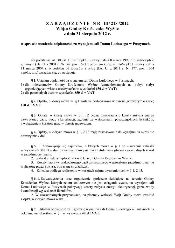 Z A R Z Ą D Z E N I E N R III/ 218 /2012 Wójta Gminy Krościenko Wyżne z dnia 31 sierpnia 2012 r. w sprawie ustalenia odpłatności za wynajem sali Domu Ludowego w Pustynach. Na podstawie art. 30 ust. 1 i ust. 2 pkt 3 ustawy z dnia 8 marca 1990 r. o samorządzie gminnym (Dz. U. z 2001 r. Nr 142, poz. 1591 z późn. zm.) oraz art. 146a pkt 1 ustawy z dnia 11 marca 2004 r. o podatku od towarów i usług (Dz. U. z 2011 r. Nr 177, poz. 1054 z późn. zm.) zarządza się, co następuje: § 1. Ustalam odpłatność za wynajem sali Domu Ludowego w Pustynach: 1) dla mieszkańców Gminy Krościenko Wyżne (zameldowanych na pobyt stały) organizujących własne uroczystości w wysokości 650 zł + VAT; 2) dla pozostałych osób w wysokości 850 zł + VAT. § 2. Opłata, o której mowa w § 1 zostanie podwyższona w okresie grzewczym o kwotę 150 zł + VAT. § 3. Opłata, o której mowa w § 1 i 2 będzie zwiększana o koszty zużycia energii elektrycznej, gazu, wody i kanalizacji, zgodnie ze wskazaniami poszczególnych liczników, z wyłączeniem kosztów gazu w okresie grzewczym. § 4. Opłaty, o których mowa w § 1, 2 i 3 mają zastosowanie do wynajmu na okres nie dłuższy niż 7 dni. § 5. 1. Zobowiązuje się najemców, o których mowa w § 1 do uiszczenia zaliczki w wysokości 300 zł w dniu zawarcia umowy najmu z tytułu wyrządzenia ewentualnych szkód w przedmiocie najmu. 2. Zaliczkę należy wpłacić w kasie Urzędu Gminy Krościenko Wyżne. 3. Koszty naprawy uszkodzonego bądź zniszczonego wyposażenia przedmiotu najmu wyliczone przez Sołtysa, potrącane są z zaliczki. 4. Zaliczka podlega rozliczeniu w kosztach najmu wymienionych w § 1, 2 i 3. § 6. 1. Stowarzyszenia oraz organizacje społeczne działające na terenie Gminy Krościenko Wyżne, których celem statutowym nie jest osiąganie zysku, za wynajem sali Domu Ludowego w Pustynach pokrywają koszty zużycia energii elektrycznej, gazu, wody i kanalizacji wg wskazań liczników. 2. W uzasadnionych przypadkach, na pisemny wniosek Wójt Gminy może zwolnić z opłat, o których mowa w ust. 1. § 7. Ustalam odpłatność za 1 godzinę wynajmu sali Domu Ludowego w Pustynach na cele inne niż określone w § 1 w wysokości 40 zł +VAT. 2 § 8. 1. Warunkiem wynajmu sali Domu Ludowego w Pustynach jest zawarcie umowy z Sołtysem Sołectwa Pustyny. 2. Szczegółowe zasady wynajmu określa załącznik do niniejszego zarządzenia. § 9. W każdym przypadku najemca zapewni zaopatrzenie w środki czystości. § 10. Odpłatność, o której mowa w § 1, 2, 3, 5, 6 i 7 płatna będzie w kasie Urzędu Gminy Krościenko Wyżne po wystawieniu przez upoważnionego pracownika urzędu faktury VAT. § 11. 1. Z opłat, o których mowa w § 1, 2, 3, 5 i 6 mogą być zwolnione organizacje społeczne, które organizują imprezy, spotkania itp. promujące Gminę Krościenko Wyżne. 2. Przy zwolnieniu, o którym mowa w ust. 1 wymagana jest każdorazowo zgoda Wójta Gminy. § 12. 1. Nadzór nad realizacją niniejszego zarządzenia w ramach swoich kompetencji pełni Skarbnik i Sekretarz Gminy. 2. Sekretarz Gminy przeprowadza okresowe kontrole (nie rzadziej niż raz na kwartał) stanu technicznego i estetyki pomieszczeń obiektu, sposobu przekazywania i zwrotu przedmiotu najmu, sprawności urządzeń pomiarowych – spisując z każdej kontroli odpowiednią notatkę służbową oraz zapewnia sołtysowi wszystkie druki dokumentów niezbędnych do wykonania czynności, o których mowa w niniejszym zarządzeniu. § 13. Traci moc zarządzenie Nr II/527/10 z dnia 31 grudnia 2010 r. w sprawie ustalania odpłatności za wynajem sali Domu Ludowego w Pustynach. § 14. Zarządzenie wchodzi w życie z dniem podpisania, z mocą obowiązującą od dnia 1 września 2012 r. i podlega ogłoszeniu poprzez rozplakatowanie tekstu na tablicy ogłoszeń w sposób zwyczajowo przyjęty. 3 Załącznik do zarządzenia Nr III/ 218 /2012 Wójta Gminy Krościenko Wyżne z dnia 31 sierpnia 2012 r. Szczegółowe zasady wynajmu sali Domu Ludowego w Pustynach 1. W Urzędzie Gminy Krościenko Wyżne tworzy się „Rejestr wynajmu sali Domu Ludowego w Pustynach” zwany dalej „rejestrem”, który zawiera następujące rubryki: a) liczba porządkowa, b) imię i nazwisko wynajmującego – adres zamieszkania, c) data wynajmu sali, d) odpis stanu liczników poszczególnych mediów w chwili przekazania i odbioru sali. 2. W rejestrze ewidencjonuje się również imprezy kulturalne lub okolicznościowe organizowane przez stowarzyszenia i organizacje społeczne działające na terenie Gminy Krościenko Wyżne, a zwolnione z odpłatności. 3. Obowiązek rzetelnego prowadzenia rejestru należy od osoby odpowiedzialnej za mienie komunalne – Sołtysa Sołectwa Pustyny. 4. Rejestr powinien być przedkładany do 10 każdego miesiąca osobie upoważnionej do rozliczeń podatku VAT celem prowadzenia ewidencji towarów i usług jak również do sporządzenia analizy zużycia mediów. 5. Warunkiem dokonania wynajmu sali Domu Ludowego w Pustynach jest: a) zawarcie umowy najmu, b) sporządzenie protokołu zdawczo – odbiorczego. 6. Zwalnia się z obowiązku zawierania umowy najmu i sporządzania protokołu zdawczo – odbiorczego w stosunku do narad i konferencji organizowanych przez jednostki samorządu terytorialnego. 7. Upoważnionym do dokonywania czynności, o których mowa w ust. 5 jest osoba odpowiedzialna za mienie komunalne, w przypadku jego nieobecności Sekretarz Gminy. 8. Bezpośrednio po zakończeniu trwania umowy najmu najemca przedkłada umowę wraz z protokołem do Urzędu Gminy, gdzie wystawiana jest faktura VAT. 9. Dokumenty, o których mowa w ust. 8 przechowywane są u pracownika Urzędu Gminy upoważnionego do wystawiania faktur VAT. 10. Należności wynikające z faktury VAT najemca uiszcza w kasie Urzędu Gminy, a jako potwierdzenie zapłaty otrzymuje dowód wpłaty.
