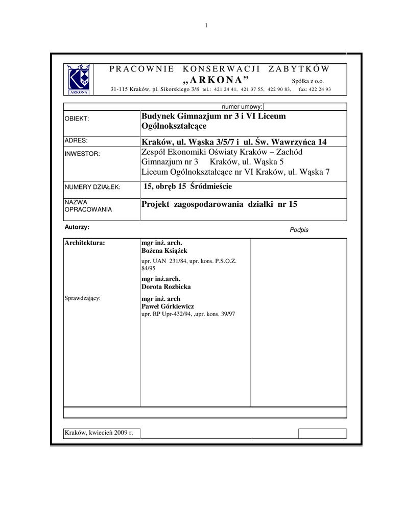 1 PRACOWNIE KONSERWACJI ZABYTKÓW „ARKONA” ARKONA Spółka z o.o. 31-115 Kraków, pl. Sikorskiego 3/8 tel.: 421 24 41, 421 37 55, 422 90 83, fax: 422 24 93 numer umowy: OBIEKT: ADRES: INWESTOR: NUMERY DZIAŁEK: NAZWA OPRACOWANIA Budynek Gimnazjum nr 3 i VI Liceum Ogólnokształcące Kraków, ul. Wąska 3/5/7 i ul. Św. Wawrzyńca 14 Zespół Ekonomiki Oświaty Kraków – Zachód Gimnazjum nr 3 Kraków, ul. Wąska 5 Liceum Ogólnokształcące nr VI Kraków, ul. Wąska 7 15, obręb 15 Śródmieście Projekt zagospodarowania działki nr 15 Autorzy: Architektura: Podpis mgr inż. arch. Bożena Książek upr. UAN 231/84, upr. kons. P.S.O.Z. 84/95 mgr inż.arch. Dorota Rozbicka Sprawdzający: mgr inż. arch Paweł Górkiewicz upr. RP Upr-432/94, ,upr. kons. 39/97 Kraków, kwiecień 2009 r. 2 PKZ - „ARKONA” Budynek Gimnazjum nr 3 i Liceum Obiekt: Ogólnokształcące nr VI Adres: Nazwa Opracowania: Projekt zagospodarowania działki nr 15 Nr umowy: Kraków, ul. Wąska 3/5/7 i ul. Św. Wawrzyńca 14 SPIS ZAWARTOŚCI l.p. Nazwa 1. 2. 3. Strona tytułowa Spis zawartości Opis zagospodarowania terenu 4. Projekt zagospodarowania działki nr 15 stron Nr rys. 1 1 1 1 Część rysun kowa: Kraków, Lipiec 2009 r. 3 Opis zagospodarowania działki nr 15 Budynek Gimnazjum nr 3 i Liceum ogólnokształcącego nr VI 1. Przedmiot i zakres inwestycji. Przedmiotem opracowania jest projekt budowlany remontu elewacji i nawierzchni podwórek budynku, siedziby szkoły Gimnazjum nr 3 i Liceum Ogólnokształcącego nr VI. W całość zespołu zabudowy, objętej remontem, pozostaje bez umiany sposobu użytkowania. Zakres opracowania projektu obejmuje: - remont elewacji frontowych wraz z konserwacją powierzchni ceglanych, tynkowanych i kamiennych, remont elewacji wewnętrznych, podwórkowych, z wymianą stolarki okiennej piwnic, remont nawierzchni dwóch bocznych podwórek z wymianą instalacji odwadniającej. W zakresie przedmiotowego opracowania mieści się zagospodarowanie dwóch bocznych podwórek na działce nr 15, podwórek bezpośrednio przylegających do ścian budynku. W ramach podwórek, przy bocznych, klatkach schodowych budynku zlokalizowane są schody zewnętrzne. Projekt zagospodarowania dotyczy jedynie remontowanych podwórek. Istniejące zagospodarowanie działki pozostaje bez zmian. 2. Adres lokalizacji. Kraków ul. Wąska 3/5/7 3. Inwestor. Zespół Ekonomiki Oświaty Kraków – Zachód Gimnazjum nr 3 i Liceum Ogólnokształcące nr VI 31- 057 Kraków, ul. Wąska 5-7 4. Podstawa opracowania. • Umowa z Inwestorem • Inwentaryzacja architektoniczno-budowlana elewacji, wykonana dla potrzeb przedmiotowego projektu przez autorów opracowania w czerwcu 2009 roku. • Mapa sytuacyjno-wysokościowa w skali 1:500 • Ustalenia z Inwestorem i Użytkownikiem. • Program prac konserwatorskich opracowany w lipcu 2009 roku. • Dokumentacja konserwatorska opracowana przez Pracownie Konserwacji Zabytków „ARKONA” sp. Z o.o. w 1995 roku. • Projekt branżowy instalacji kanalizacji deszczowej • Obowiązujące normy i przepisy. 4 5. Autor opracowania. PKZ „ARKONA” Sp. z o. o., Plac Sikorskiego 3/8, 31-115 Kraków: architektura, , instalacja odwodnienia deszczowego, program prac konserwatorskich, koordynacja międzybranżowa. 6. Stan własności. Działka nr 15, obręb 15, Śródmieście – Gmina Kraków , Trwały zarząd – Gimnazjum nr 3 31-057 Kraków, ul. Wąska 5 i Liceum Ogólnokształcące nr VI ul. Wąska 7. 7. Infrastruktura. Nie ulega zmianie. Projektuje się jedynie wymianę instalacji deszczowej w niewielkim zakresie na wewnętrznych podwórkach. 8. Wpływ inwestycji na środowisko. Projektowana inwestycja nie będzie miała ujemnego wpływu na środowisko i nie stanowi rodzaju inwestycji zaliczanej do szkodliwych dla środowiska i zdrowia ludzi lub mogących pogorszyć stan środowiska w rozumieniu przepisów Rozporządzenia Ministra Ochrony Środowiska Zasobów Naturalnych i Leśnictwa z dn. 14.07.1998. 9. Podstawowe parametry powierzchniowe kubaturowe remontu elewacji i nawierzchni podwórek Powierzchnia działki nr 15 2.362 m² Powierzchnia terenu objęta zagospodarowaniem 147,15 m² powierzchnia zabudowy 799,10 m2 Powierzchnia podwórka północnego 89,86 m2 Powierzchnia podwórka południowego 57,29 m2 Wysokość elewacji frontowych 21,80 m Wysokość elewacji wewn. podwórkowych 20,70 m 10. Opis stanu istniejącego zabudowy. Obiekt jest wpisany do rejestru zabytków pod numerem A-1138. Gmach przy ul. Wąskiej zajmuje pierzeję ulicy, od narożnika ul. Św. Wawrzyńca do placu przy skrzyżowaniu ulic Józefa i Jakuba. Budynek posiada cztery kondygnacje, założony jest na rzucie wydłużonego prostokąta, z dwoma prostokątnymi skrzydłami, umieszczonymi od strony północnej i południowej. Dwie części budynku spełniające samodzielne funkcje, tworzą w zakresie kompozycji i rozwiązaniu dekoracji elewacji frontowych jeden gmach. Granicę pomiędzy nimi stanowi jedynie dylatacja. W 2001 roku zabudowano dziedziniec wewnętrzny na poziomie piwnic i parteru. Powstały wówczas dwie sale gimnastyczne, a funkcję dziedzińca przejęła powierzchnia stropodachu nad salami dostępna z poziomu I piętra. 5 Od południa i północy, przy skrzydłach bocznych budynku głównego pozostawiono dwa wewnętrzne, niewielkie podwórka. Podwórka nie są dostępne dla młodzieży uczącej się zarówno w gimnazjum jak i w Liceum. 12. Projektowane zagospodarowanie W zakresie opracowania mieści się zagospodarowanie dwóch podwórek. Przestrzenie te wydzielone są przylegającymi do nich obiektami kubaturowymi. Nawierzchnia podwórek, obecnie w bardzo złym stanie technicznym jak i istniejące niedrożne odwodnienie wymagają wymiany i remontu. Przy budynkach w miejscu wyjść zlokalizowane są schody zewnętrzne. Obecnie z ubytkami warstwy betonu przeznaczone są do rekonstrukcji i konserwacji. Projektuje się wymianę nawierzchni z nadaniem jej odpowiednich spadków w kierunku wpustów uli
